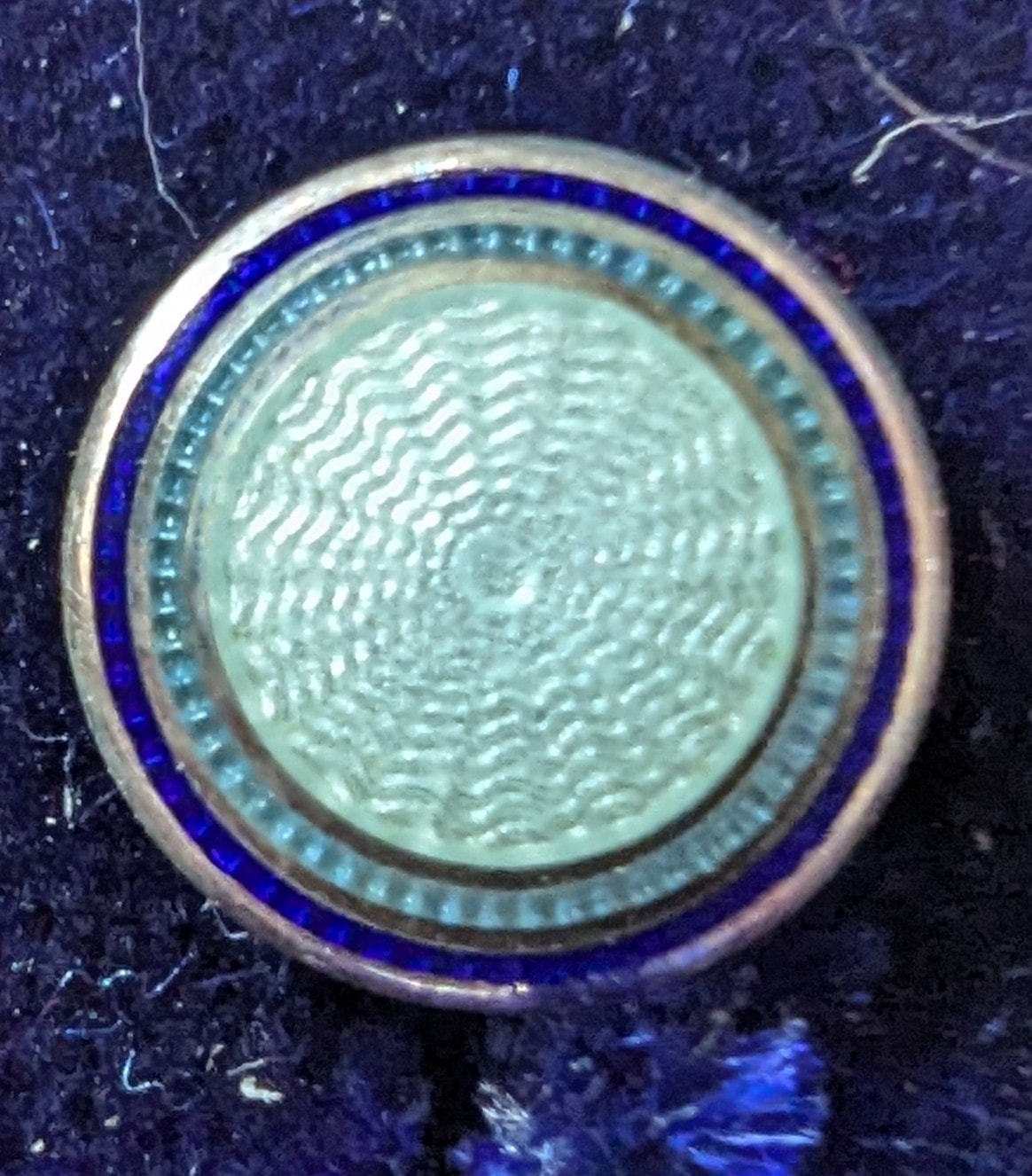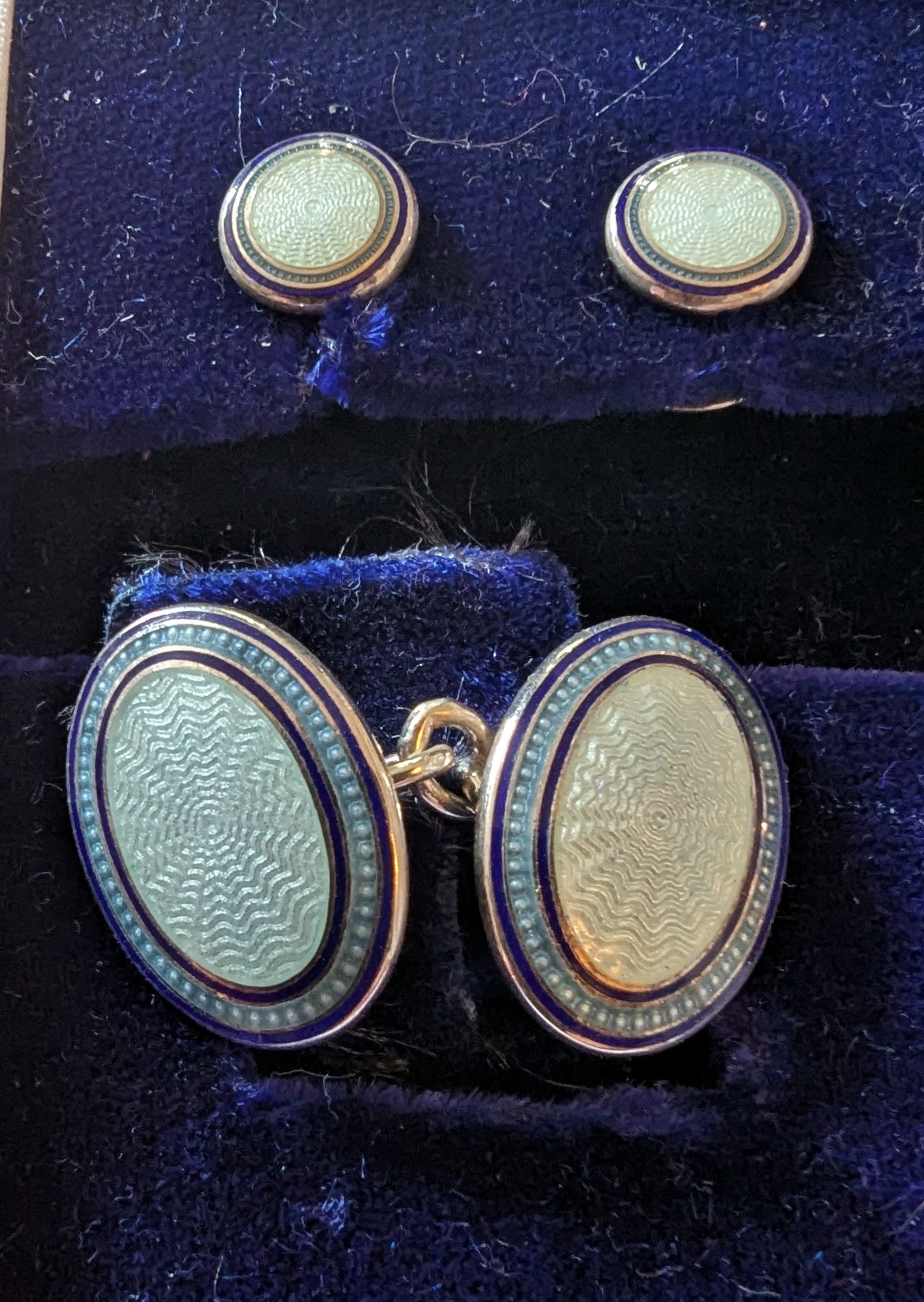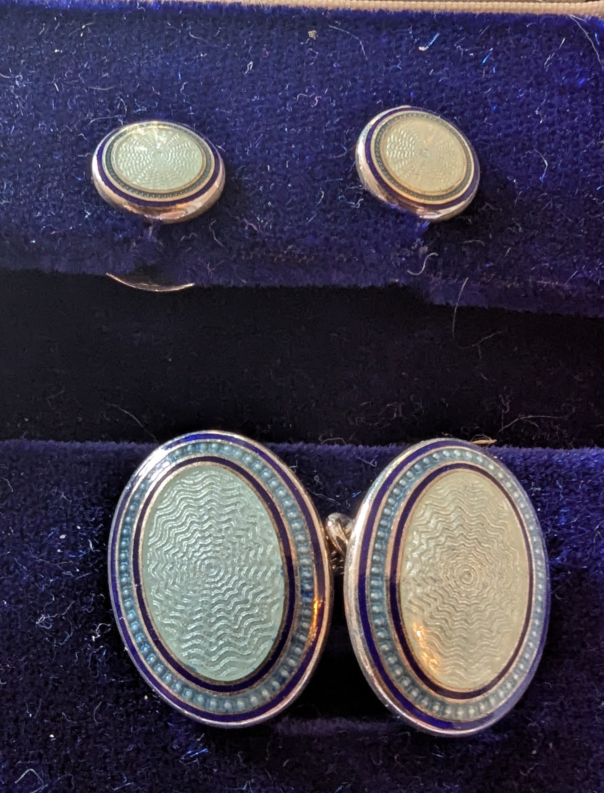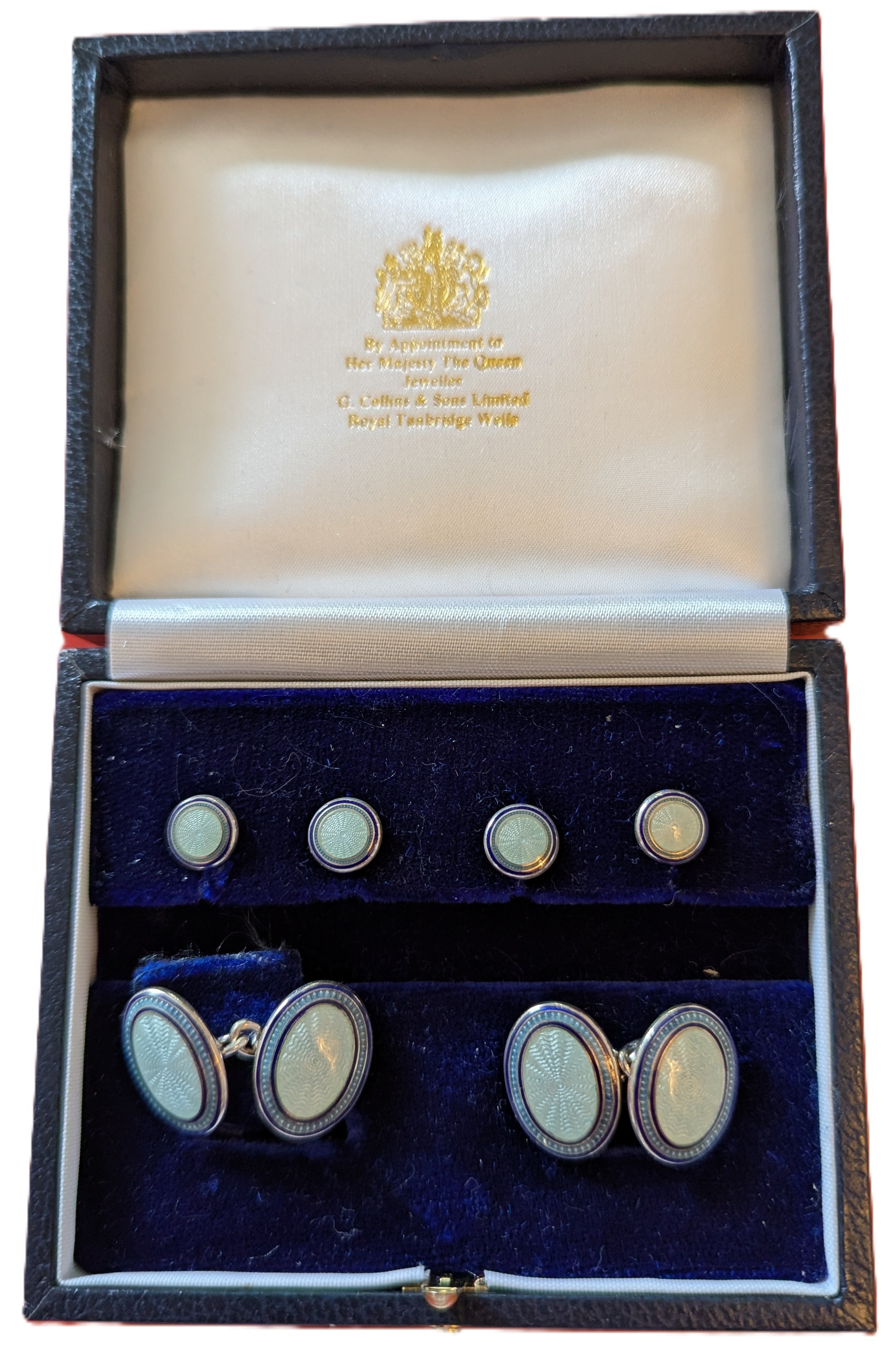 A boxed set of men’s formal wear accessories by Deakin & Francis and retailed through C. Collins & Sons Limited, Royal Tunbridge Wells, comprising a pair of chain-link Oxford cufflinks and four matching shirt studs. The jewellery pieces are fashioned from silver with the 925 mark clearly visible on the reverse of the cufflinks. The cufflinks feature oval faces, and the studs feature round faces. Each face is decorated with guilloche enamel in a pale blue-green central field, exhibiting a concentric wavy pattern, framed by concentric rings of brighter and darker blue enamel. The set is presented in a black leatherette box with gold tooling, lined internally with cream satin and dark blue velvet. The interior lid of the box is gold embossed with a Royal Warrant crest and accompanying text: “By Appointment to Her Majesty The Queen, Jeweller, C. Collins & Sons Limited, Royal Tunbridge Wells, ” dating the set to post-1952.