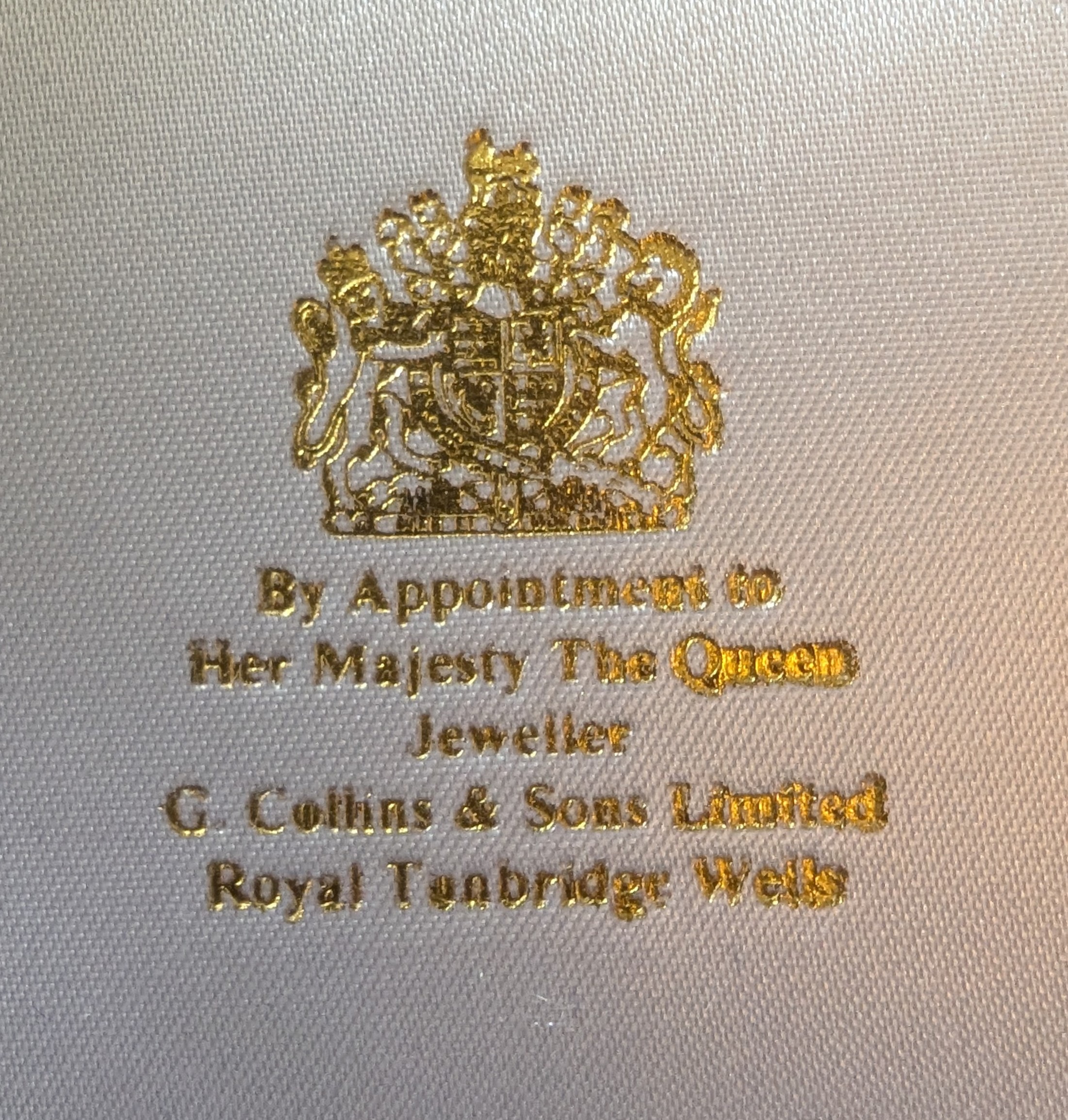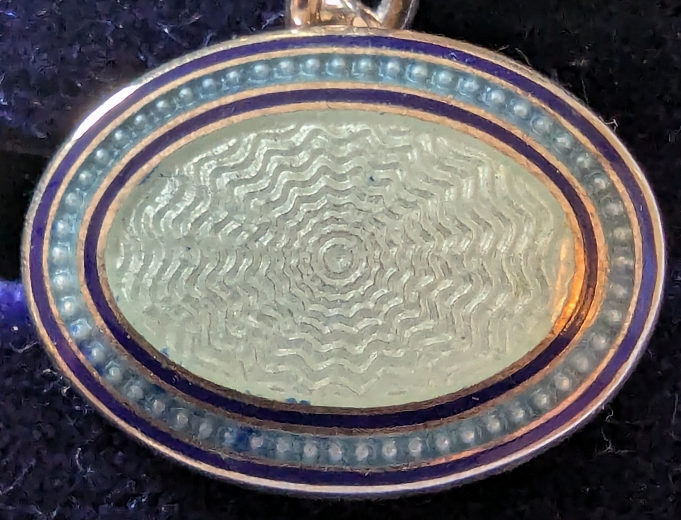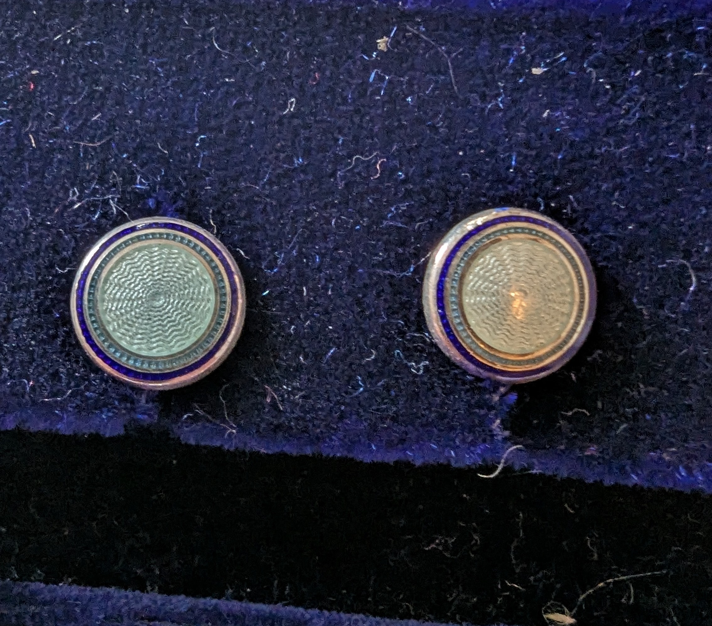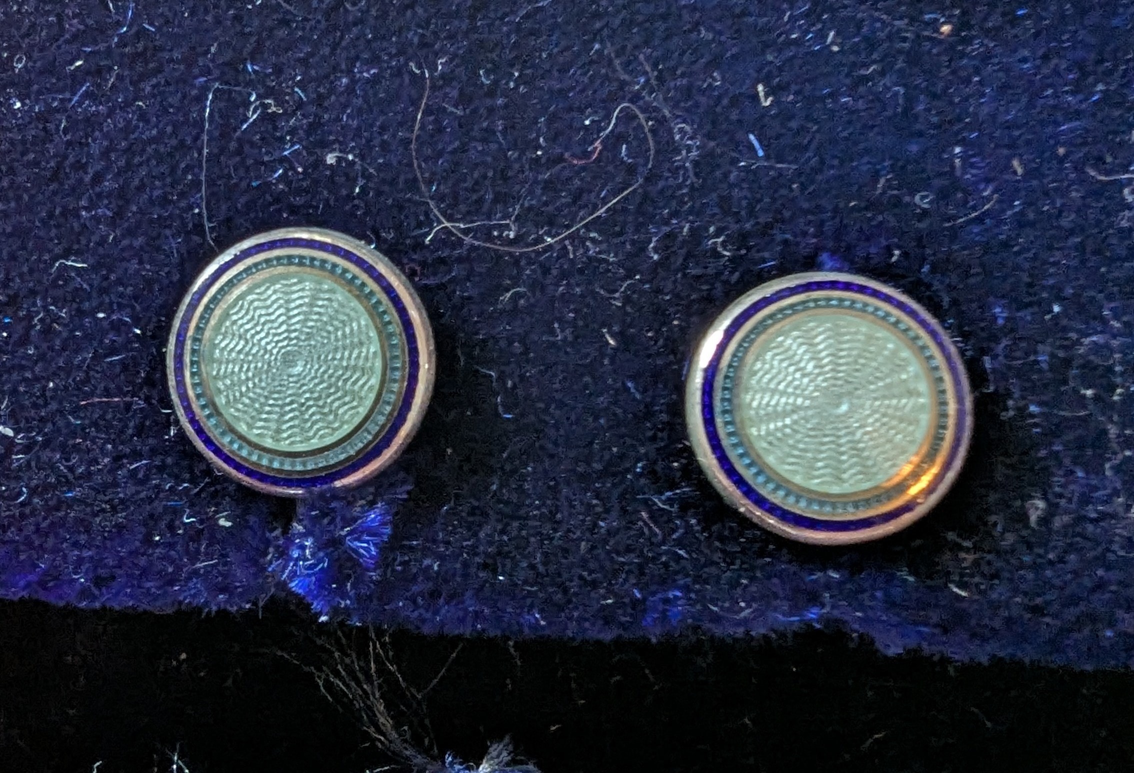 A boxed set of men’s formal wear accessories by Deakin & Francis and retailed through C. Collins & Sons Limited, Royal Tunbridge Wells, comprising a pair of chain-link Oxford cufflinks and four matching shirt studs. The jewellery pieces are fashioned from silver with the 925 mark clearly visible on the reverse of the cufflinks. The cufflinks feature oval faces, and the studs feature round faces. Each face is decorated with guilloche enamel in a pale blue-green central field, exhibiting a concentric wavy pattern, framed by concentric rings of brighter and darker blue enamel. The set is presented in a black leatherette box with gold tooling, lined internally with cream satin and dark blue velvet. The interior lid of the box is gold embossed with a Royal Warrant crest and accompanying text: “By Appointment to Her Majesty The Queen, Jeweller, C. Collins & Sons Limited, Royal Tunbridge Wells, ” dating the set to post-1952.