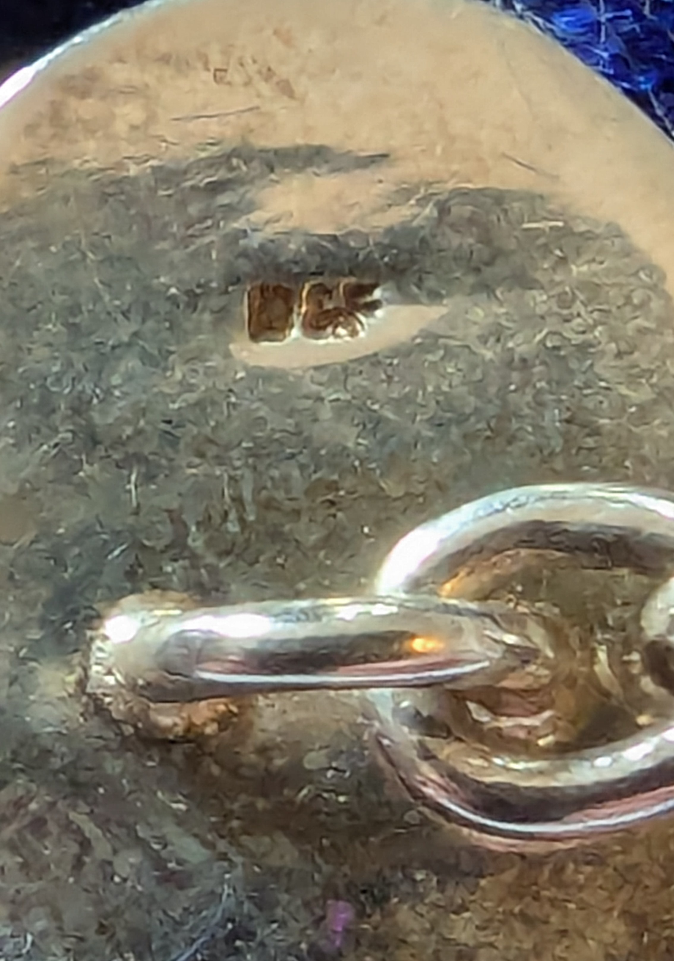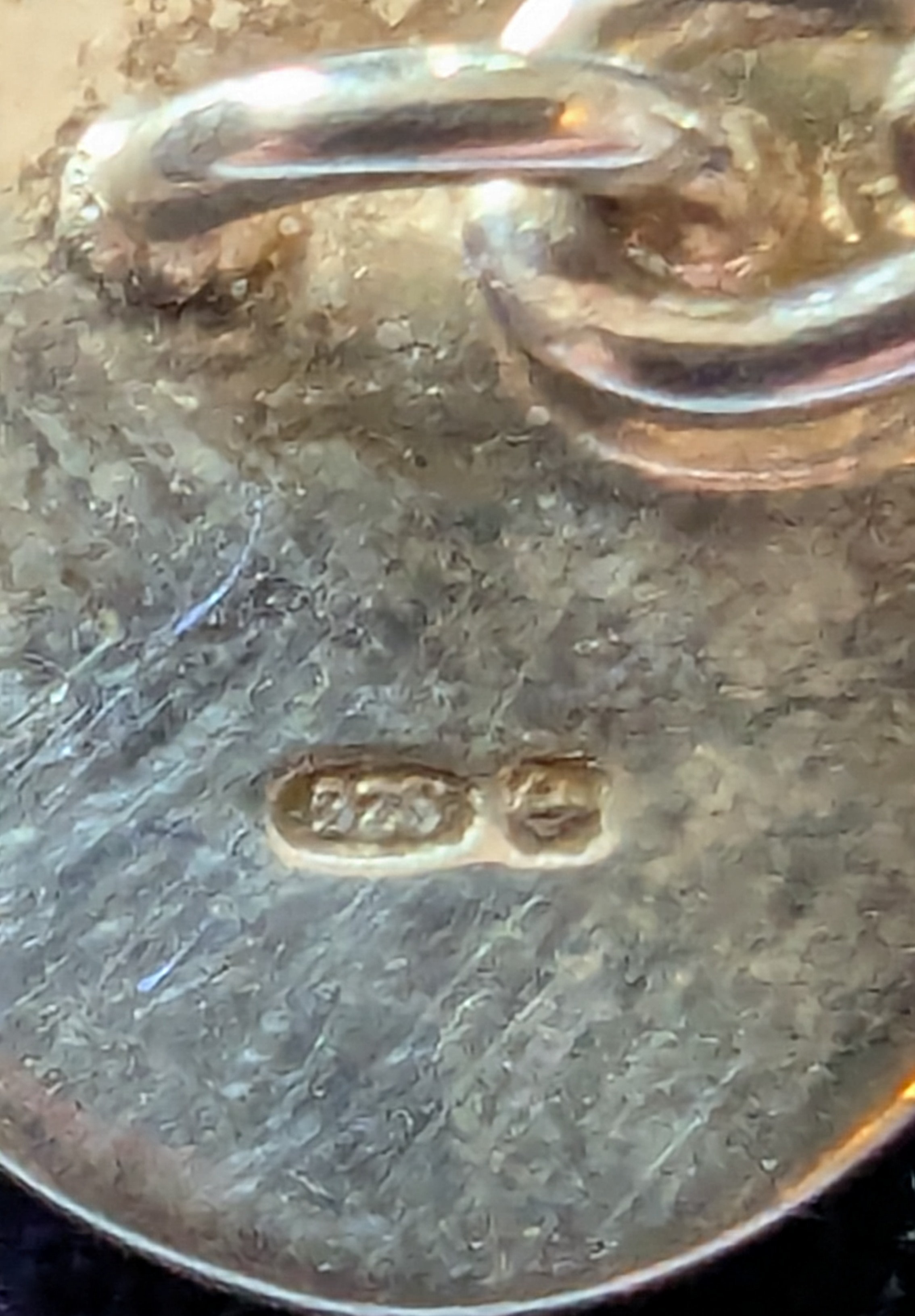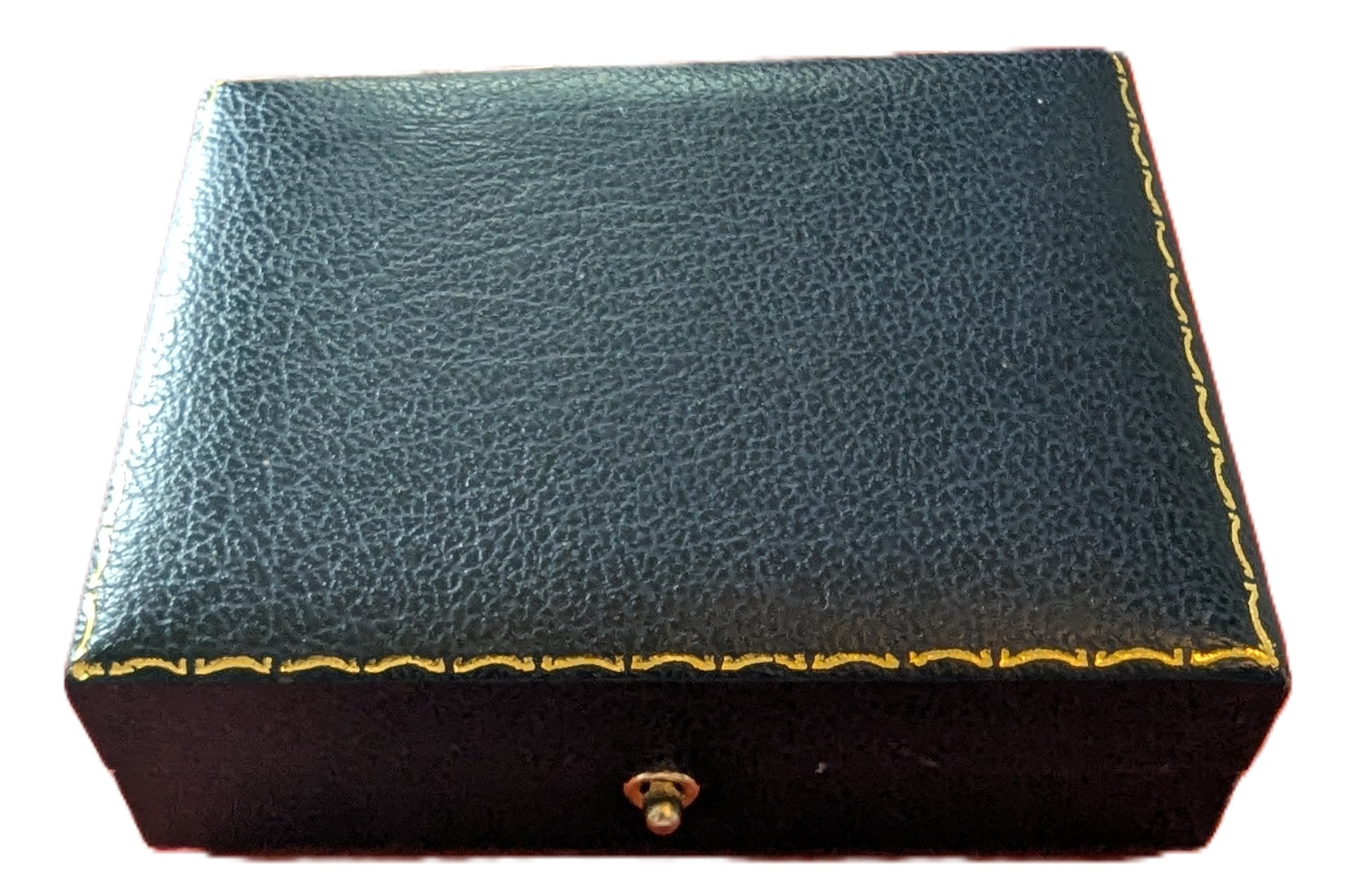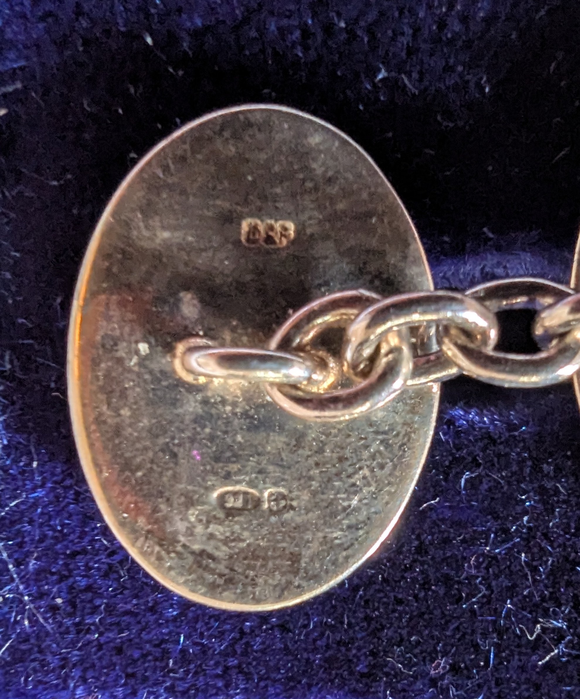 A boxed set of men’s formal wear accessories by Deakin & Francis and retailed through C. Collins & Sons Limited, Royal Tunbridge Wells, comprising a pair of chain-link Oxford cufflinks and four matching shirt studs. The jewellery pieces are fashioned from silver with the 925 mark clearly visible on the reverse of the cufflinks. The cufflinks feature oval faces, and the studs feature round faces. Each face is decorated with guilloche enamel in a pale blue-green central field, exhibiting a concentric wavy pattern, framed by concentric rings of brighter and darker blue enamel. The set is presented in a black leatherette box with gold tooling, lined internally with cream satin and dark blue velvet. The interior lid of the box is gold embossed with a Royal Warrant crest and accompanying text: “By Appointment to Her Majesty The Queen, Jeweller, C. Collins & Sons Limited, Royal Tunbridge Wells, ” dating the set to post-1952.