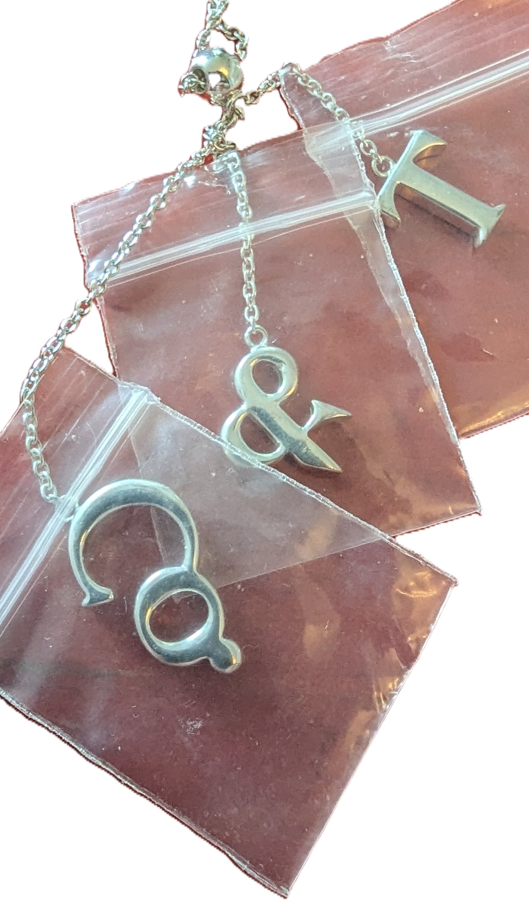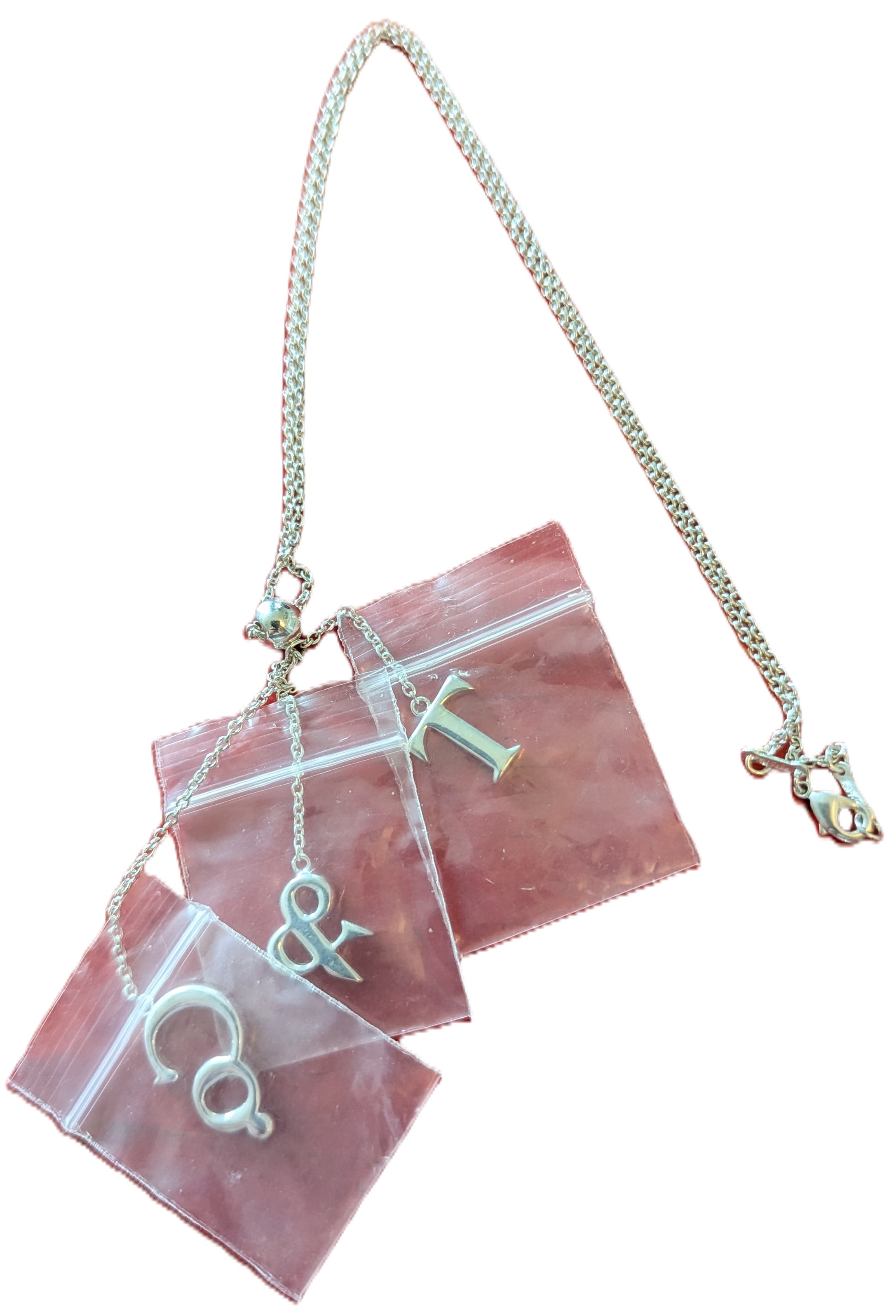 A TIFFANY&CO. Marked, sterling silver chain necklace with a lobster clasp, accompanied by three individual charms. The charms include one shaped as the letter ‘T’, one as an ampersand ‘&’, and one resembling a curly ‘C’. Each charm is individually contained within a small, clear, resealable plastic bag. The necklace clasp features two stamped tags, one clearly marked “TIFFANY&CO.” and the other “SPAIN 925”, indicating the brand, country of origin, and sterling silver composition.
