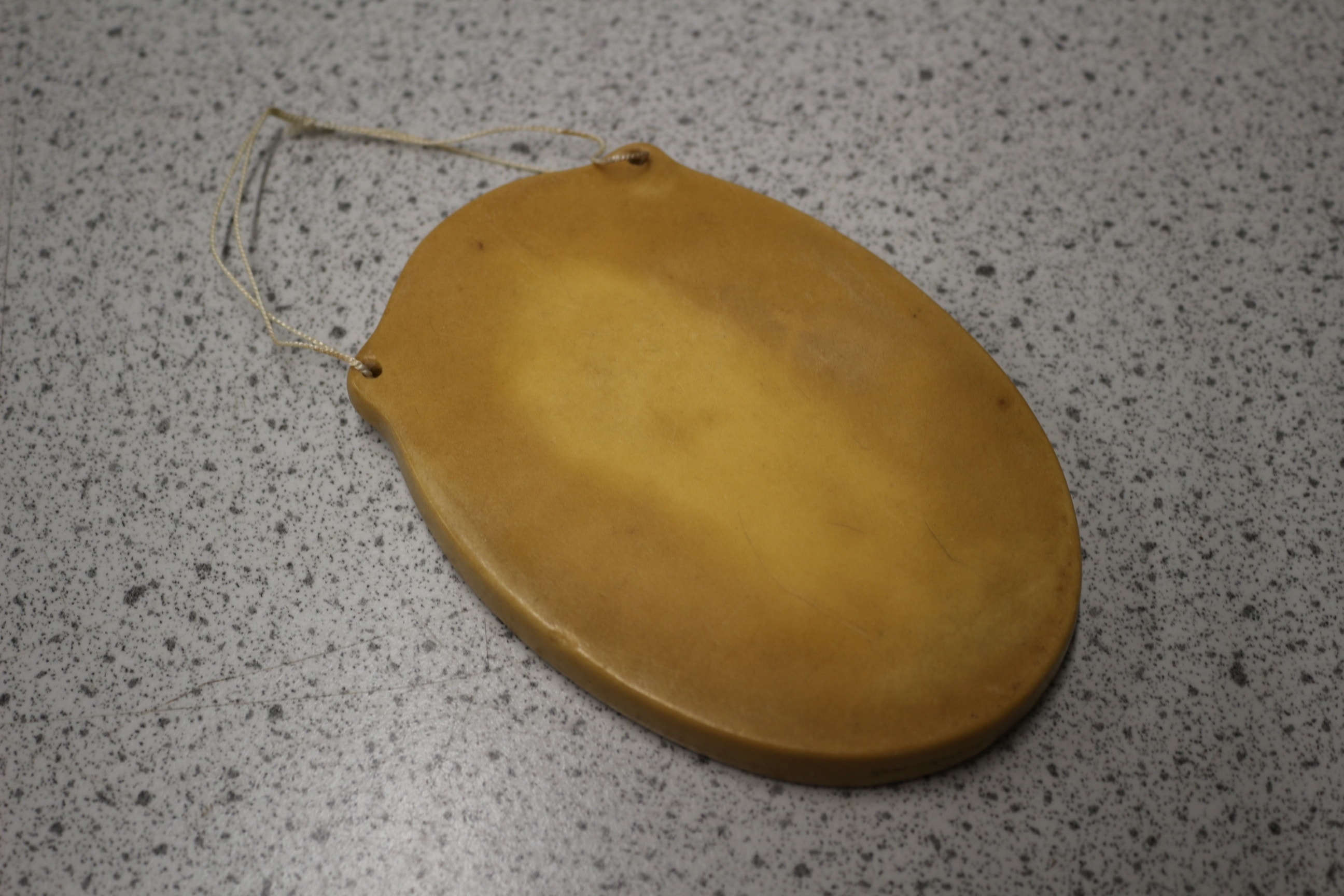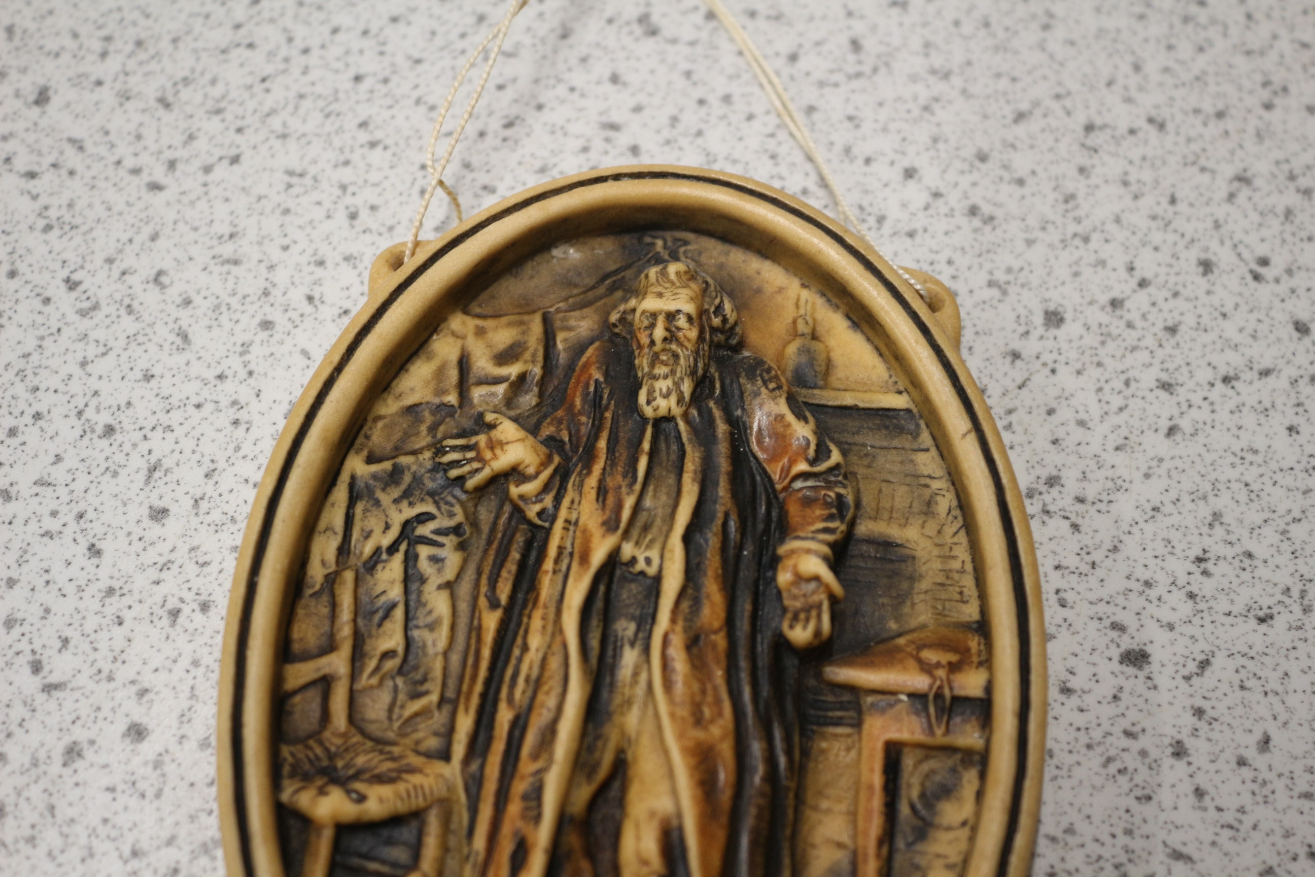 An Osborne Ivorex Charles Dickens ‘Fagin’ wall plaque, crafted from a multi-toned resin or composite material designed to emulate carved wood or ivory. This oval-shaped figural relief depicts a standing, bearded male figure in robes within an interior setting, rendered in a representational style. The name “Fagin” is clearly inscribed at the bottom, identifying the character from Charles Dickens’ *Oliver Twist*. The item features two holes at the top with a string for hanging. Examples from this series are often copyrighted around 1910-1911. 12.5cm