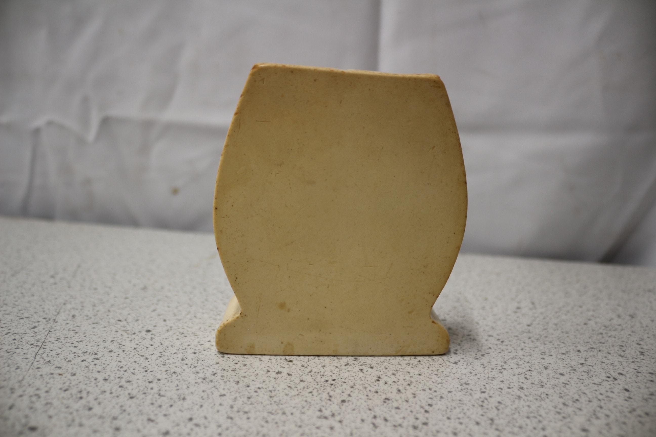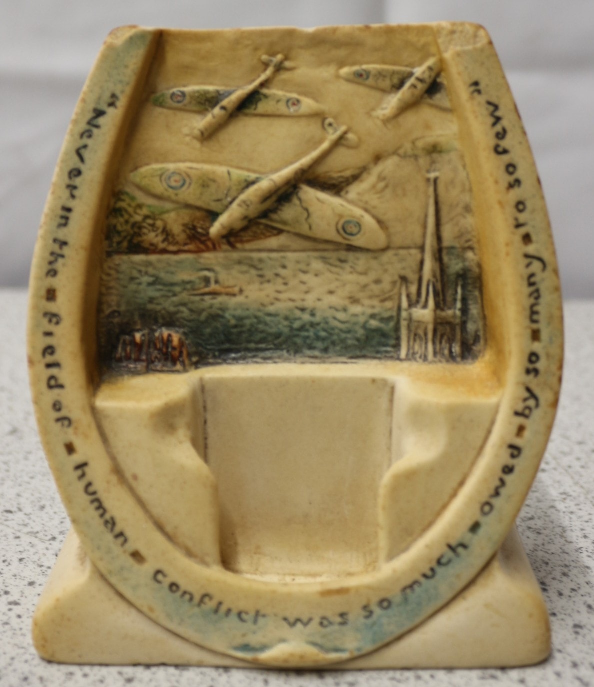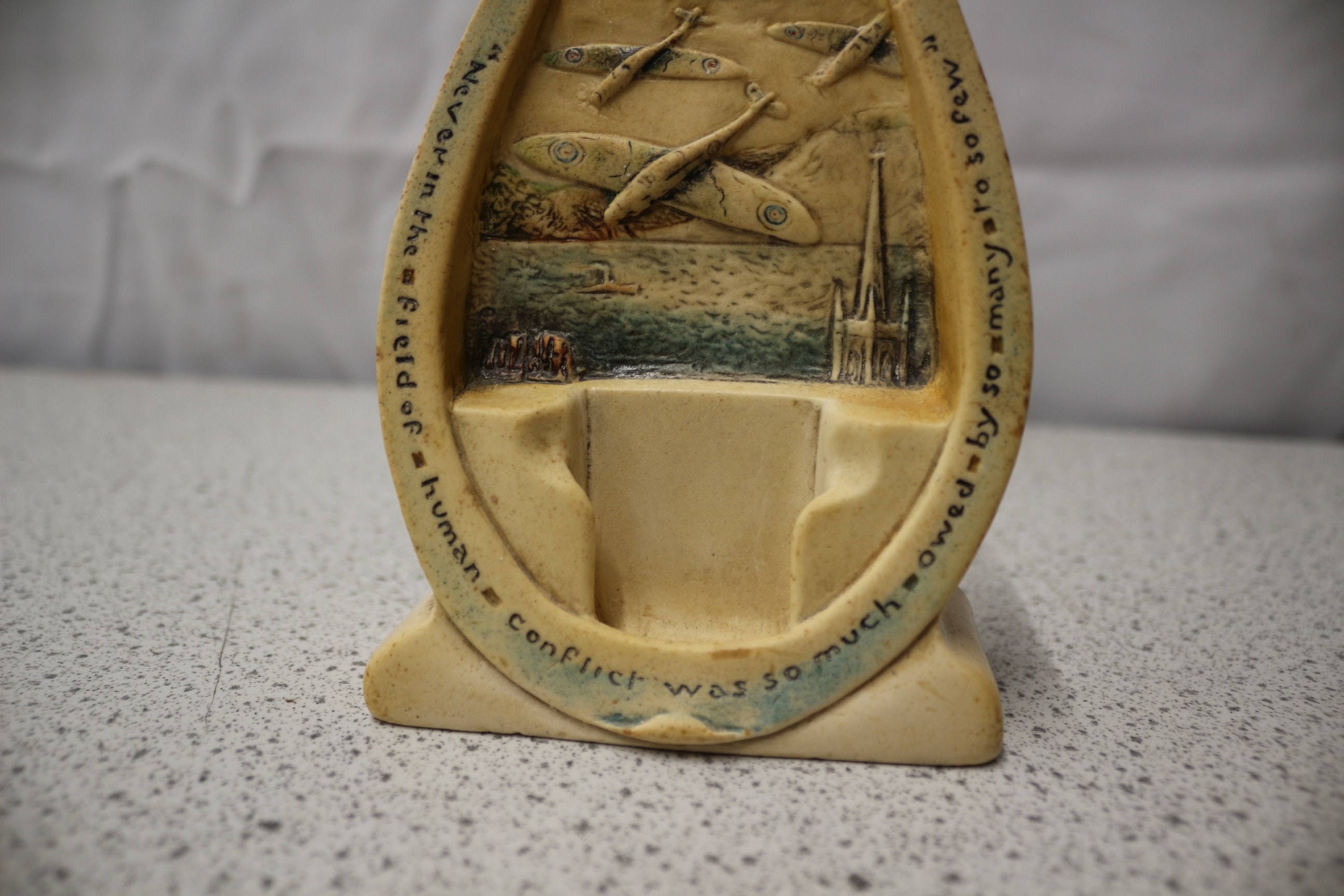 A very rare Osbourn Ivorex commemorative plaque, cream-coloured and molded from composition material, featuring a central oval-shaped recess. Within this recess, a detailed relief scene depicts four fighter aircraft, consistent with British WWII-era Spitfires or Hurricanes and bearing visible roundels, engaged in aerial combat above a landscape with water and a tall, Gothic-style spire, possibly representing a cathedral. Encircling this scene is the painted inscription: “Never in the field of human conflict was so much owed by so many to so few, ” a direct quote from Winston Churchill famously referencing the Battle of Britain. The item is inferred to be from the World War II period or shortly thereafter.