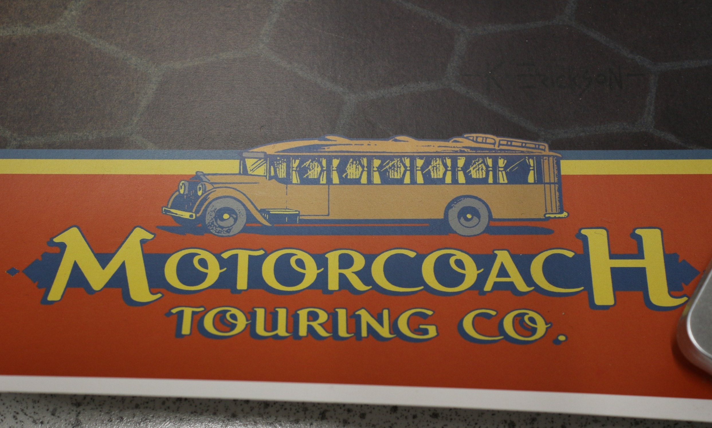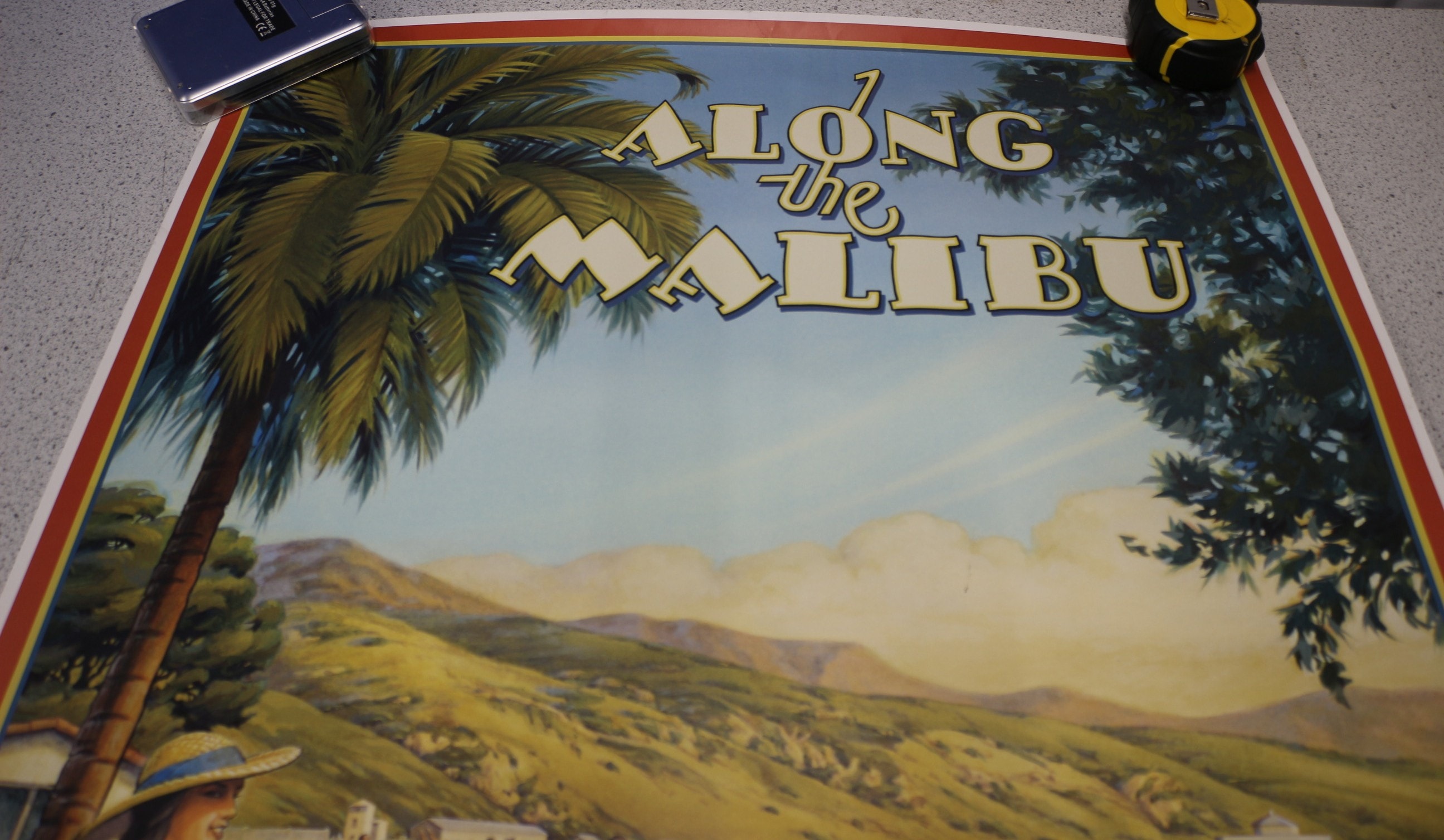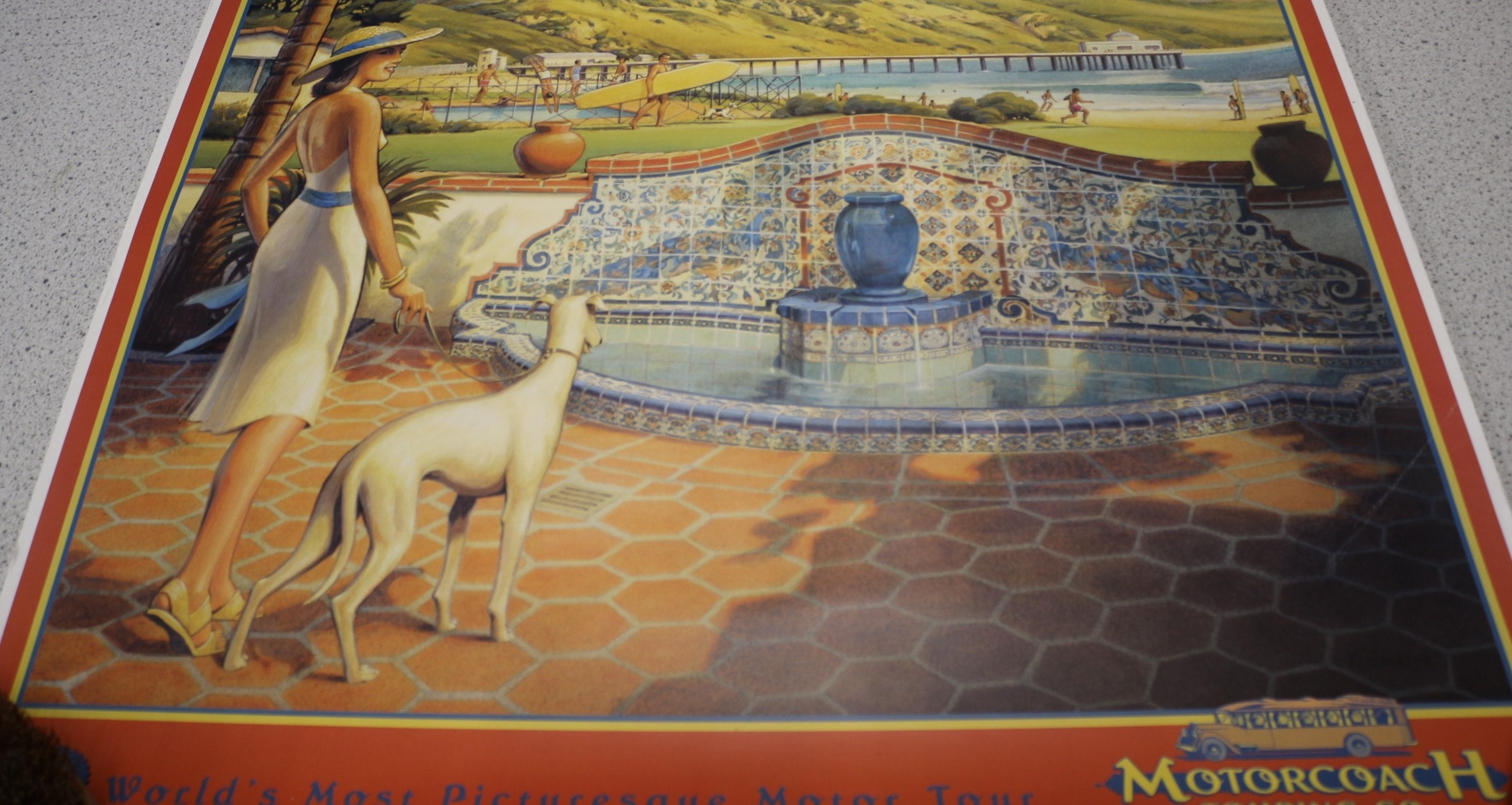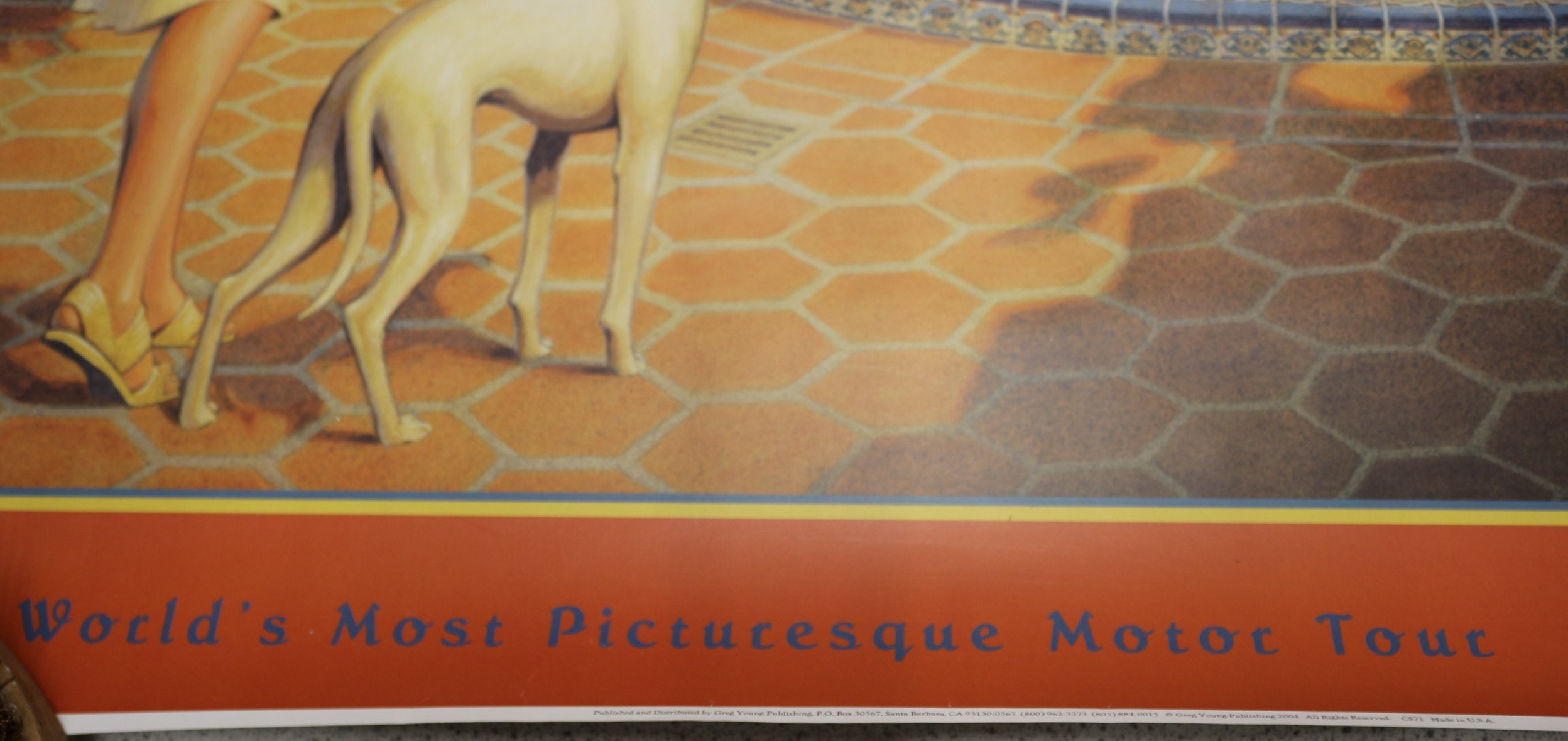 A vibrantly coloured printed poster titled “Along the Malibu – California Coast Highway – Motorcoach Touring Company” by Kerne Erickson. This artwork, styled as a vintage travel advertisement, depicts a scenic coastal landscape, presumably Malibu, featuring a woman walking a greyhound beside a tiled fountain, with a palm tree, rolling hills, and a distant pier. Text on the poster reads “ALONG the MALIBU” at the top, and “World’s Most Picturesque Motor Tour” with “MOTORCOACH TOURING CO.” and a classic bus illustration at the bottom. Printed on paper, the poster is identified with a copyright of 2004 by Greg Young Publishing LLC. 66×96.5cm