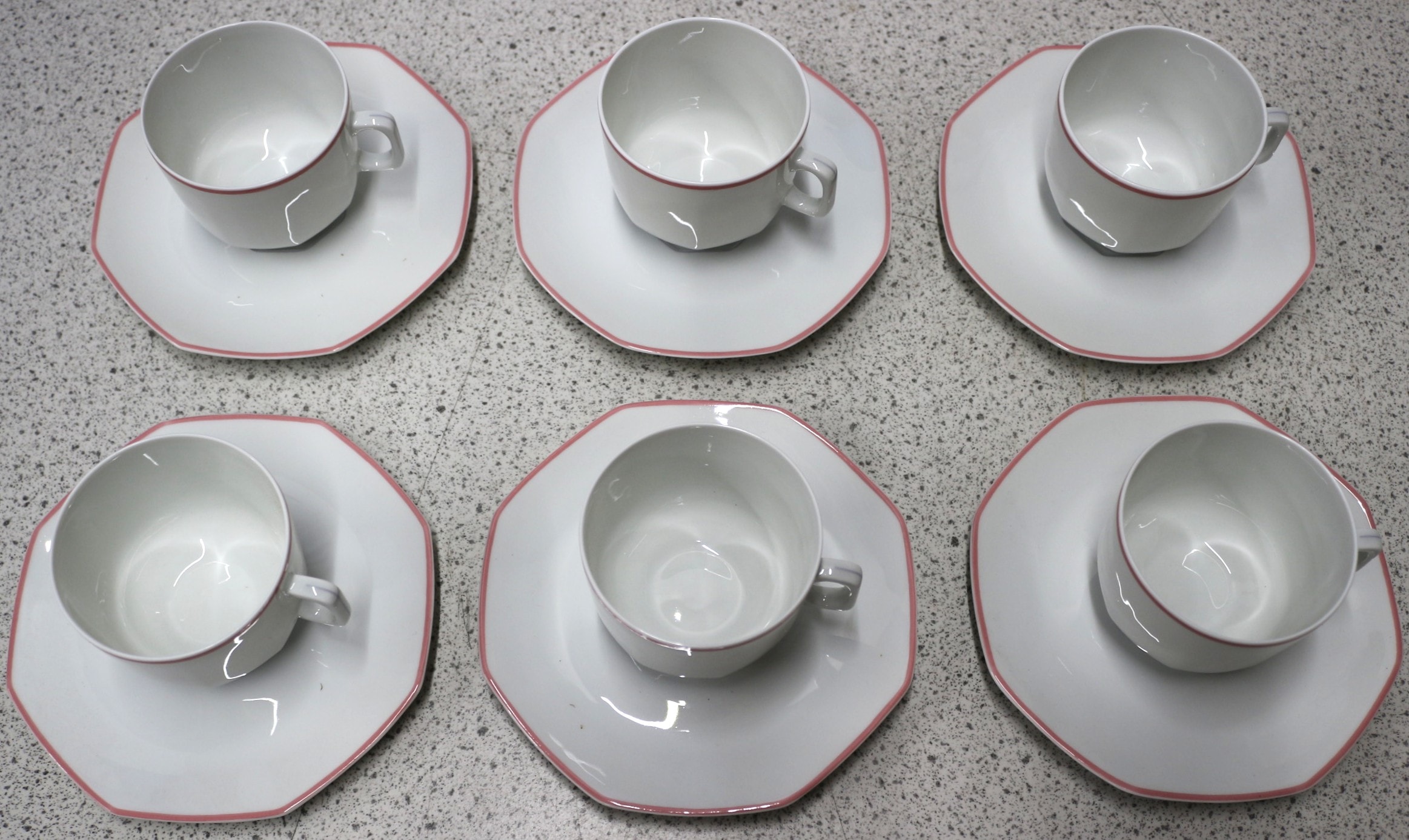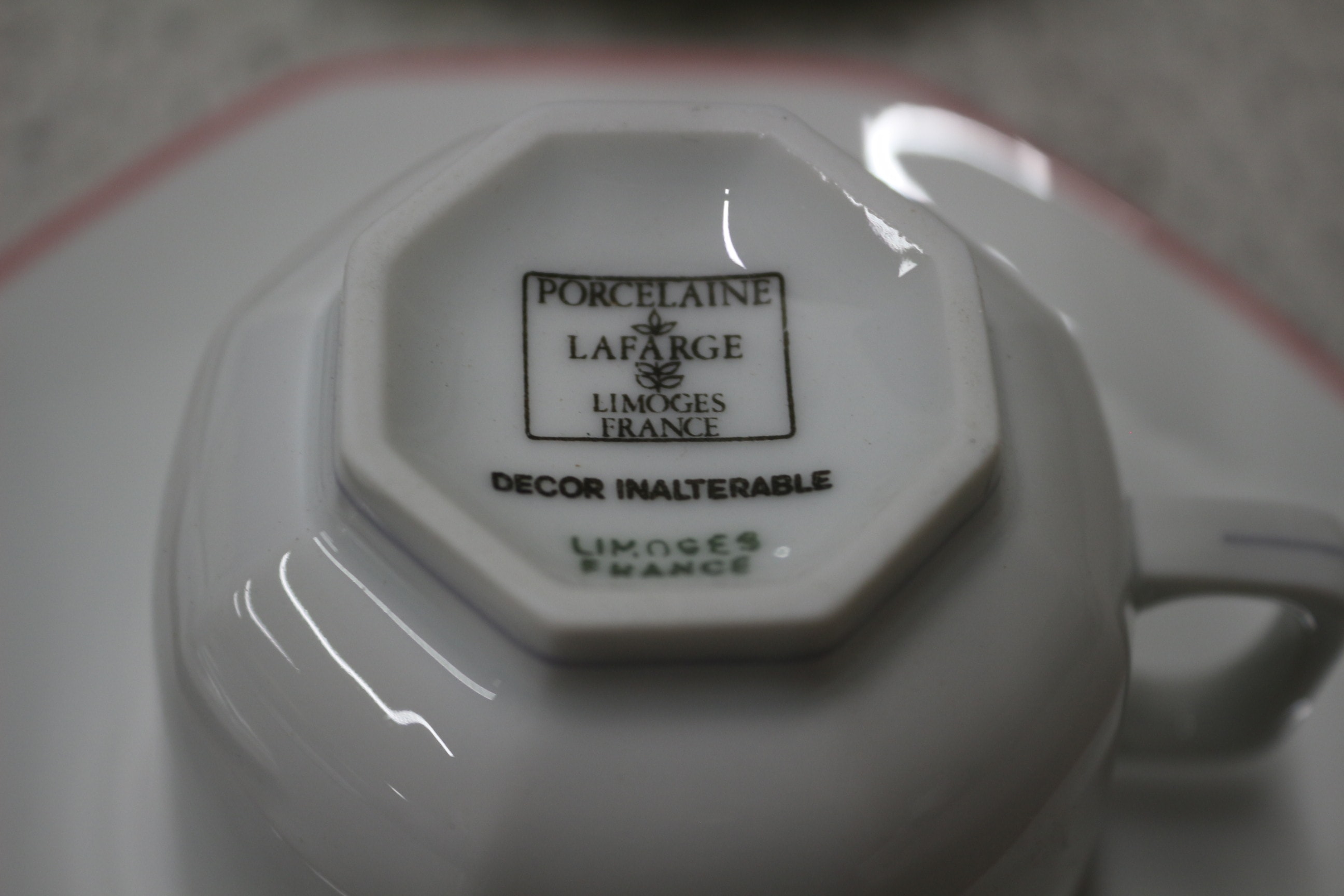 A set of six Villeroy & Boch Facette Rouge porcelain cups and saucers. Each cup and matching octagonal saucer features a thin pink decorative band along the rim. The cups have an octagonal base and a simple handle design. The underside of one cup is marked “PORCELAINE LAFARGE, ” “LIMOGES FRANCE, ” and “DECOR INALTERABLE” (Indelible Decoration).