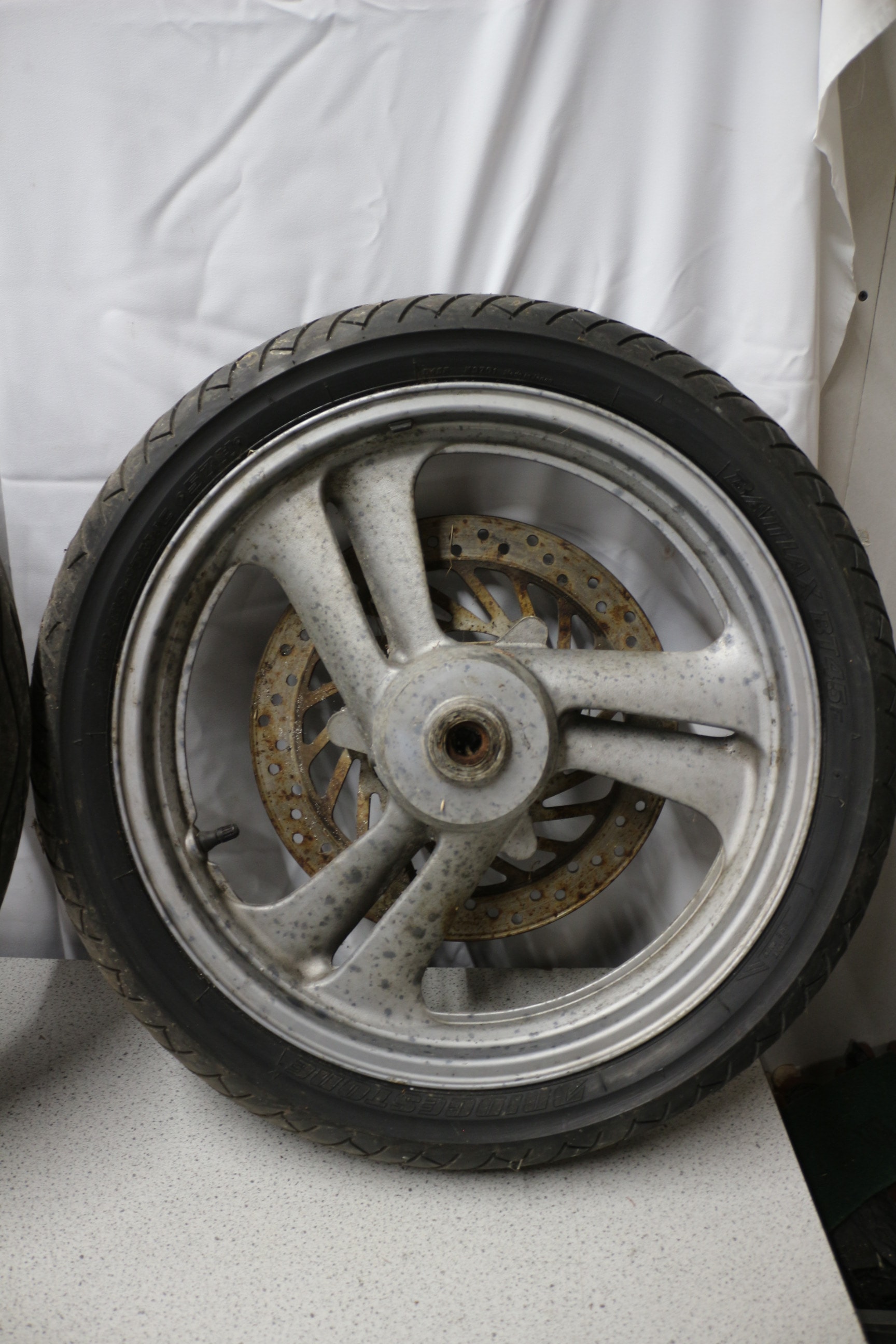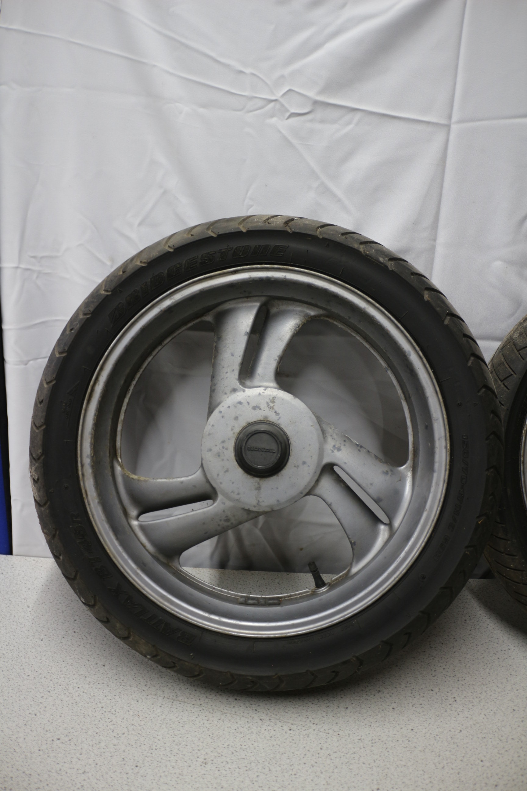 Two silver-coloured Honda motorcycle wheels with black tires, one marked ‘BRIDGESTONE BATTLAX 120/70ZR17’ and the other with a rusty brake disc, consistent with NTV 650 or NT650 Hawk GT models.