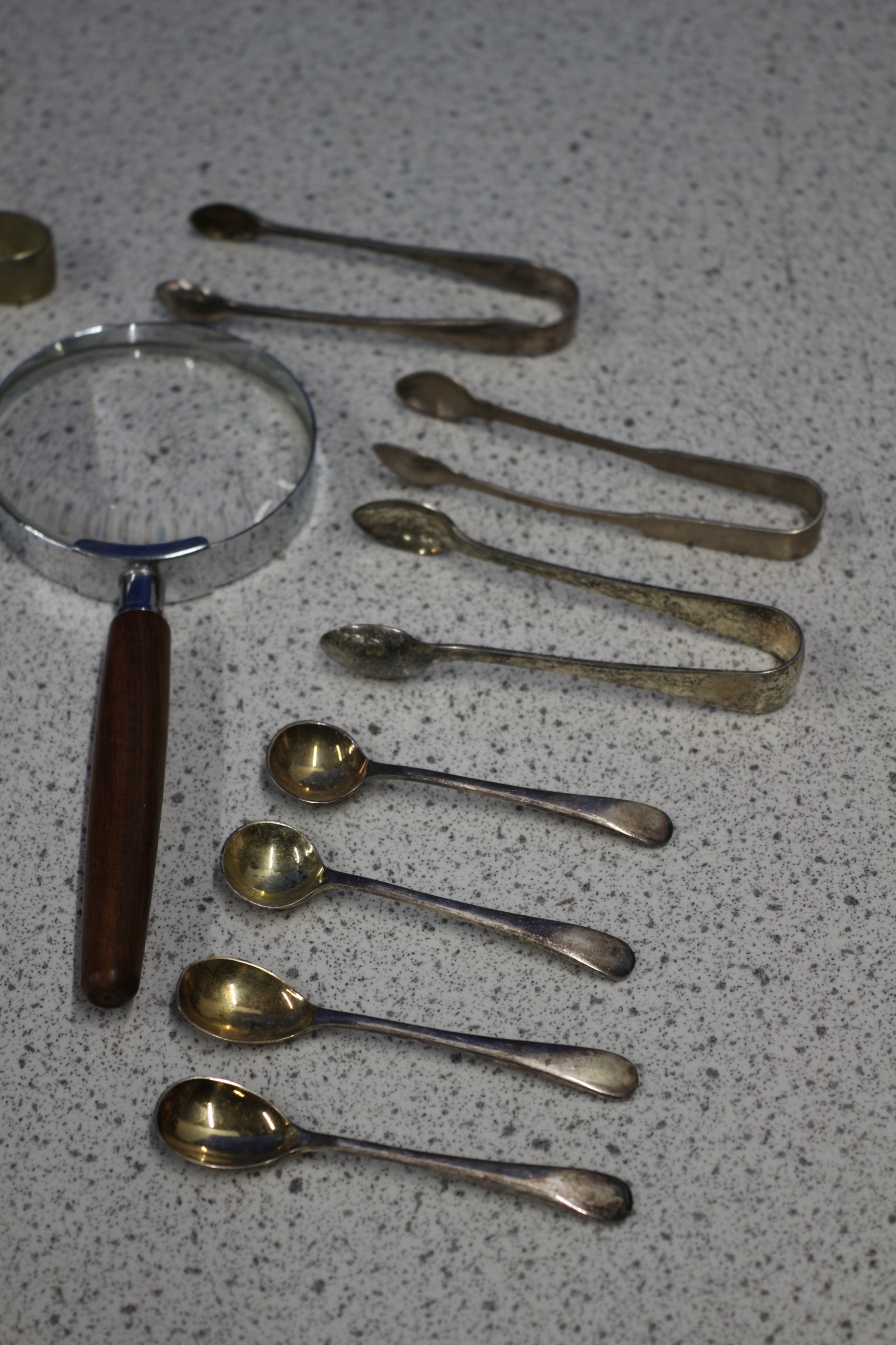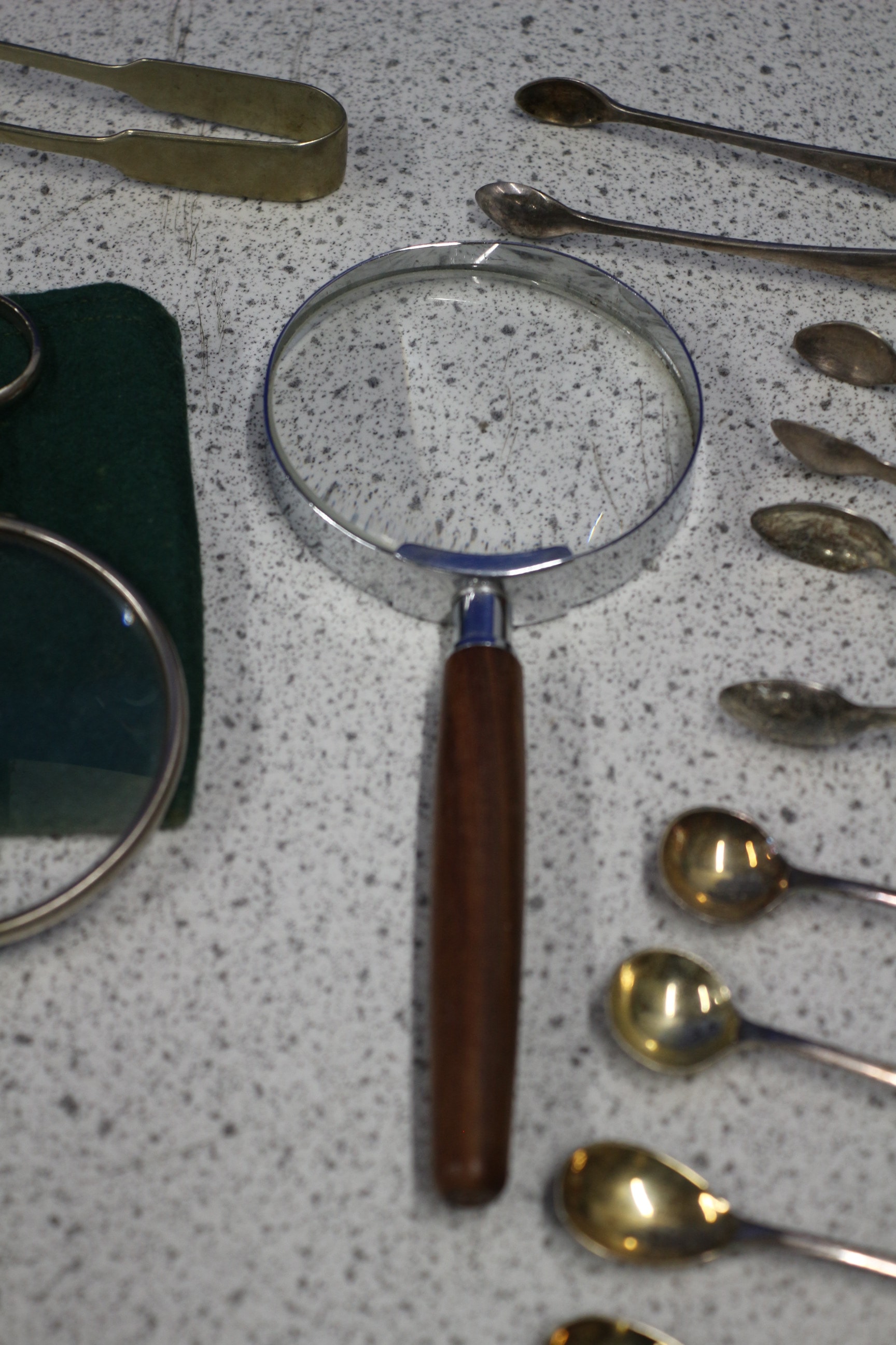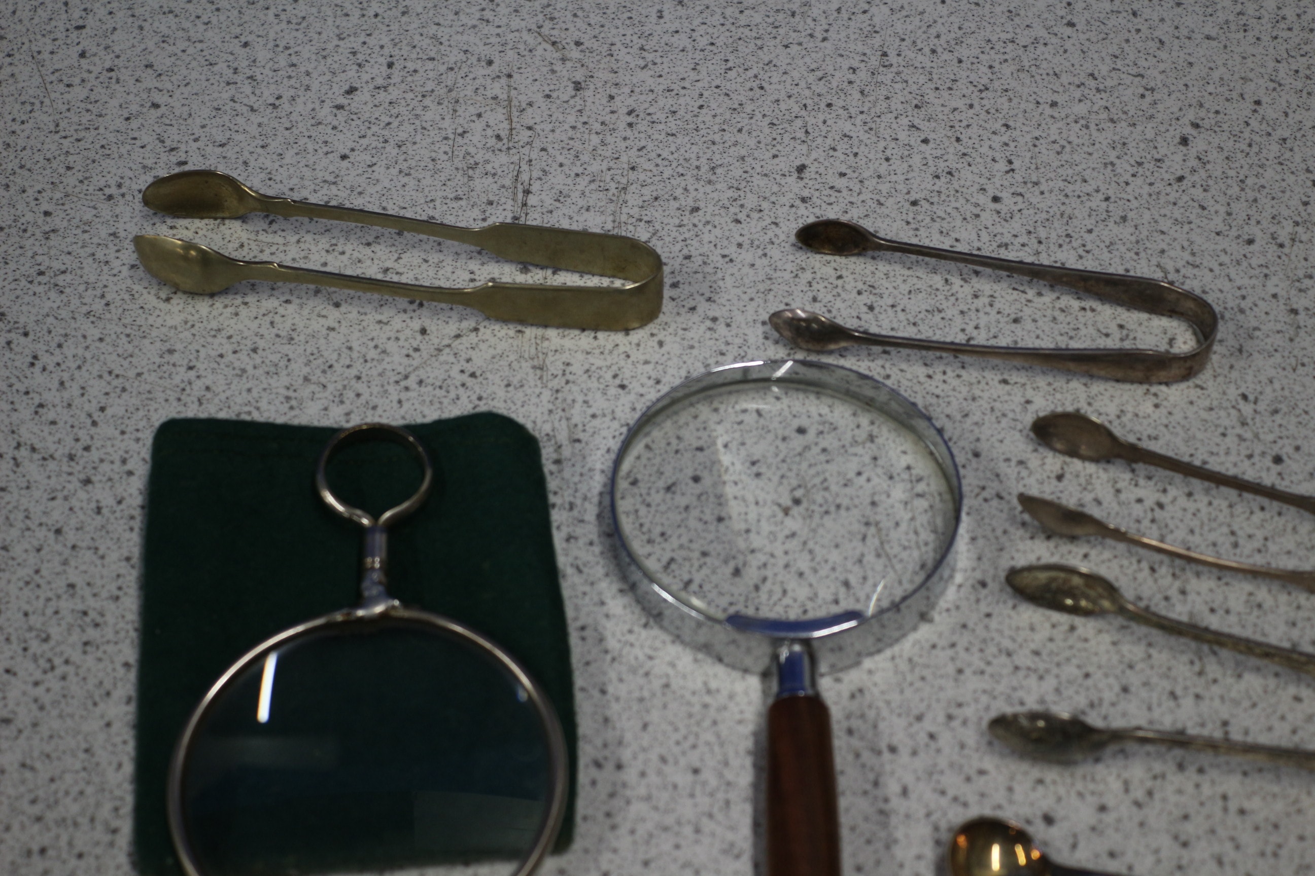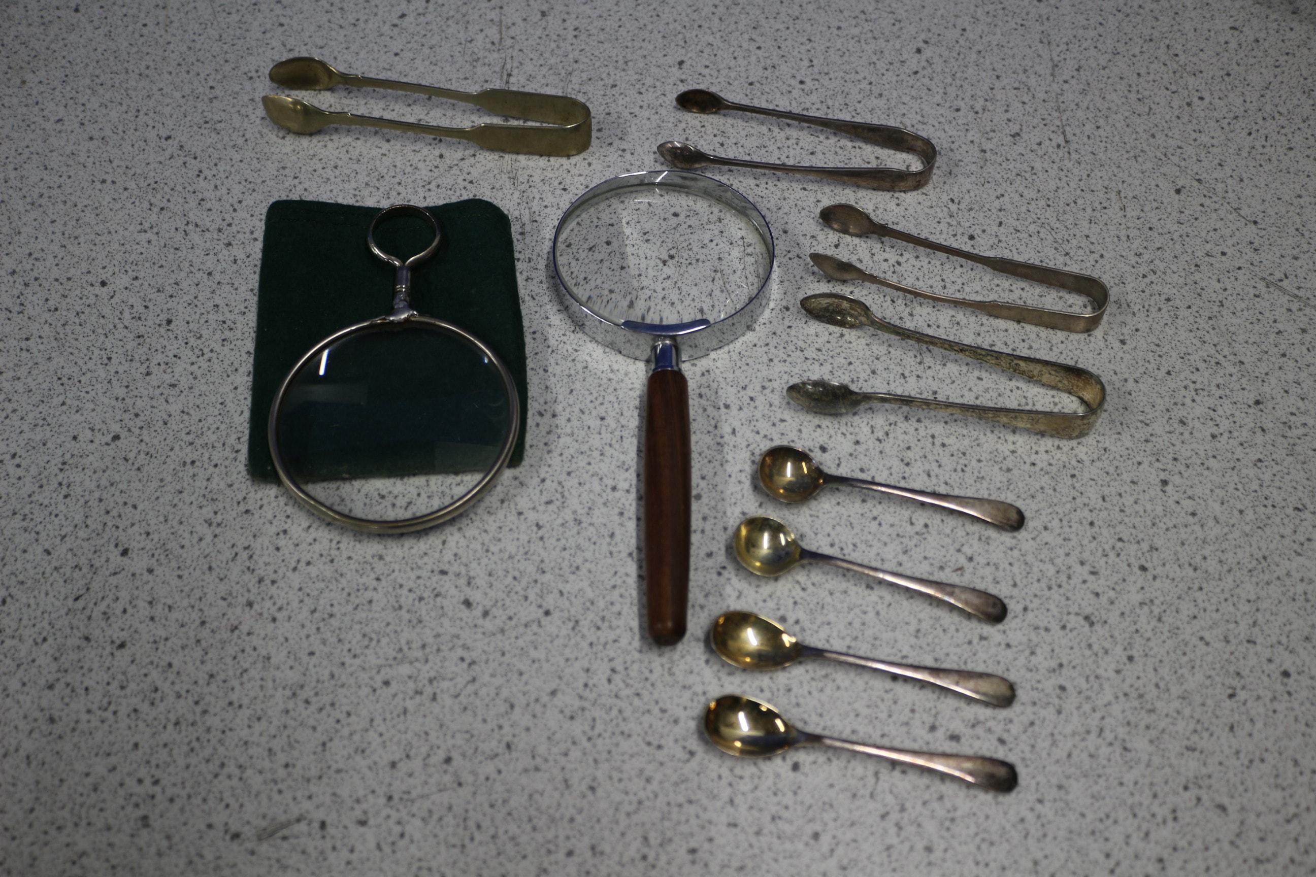 A collection of two magnifying glasses, six pairs of tongs, and eight small spoons in various metals.