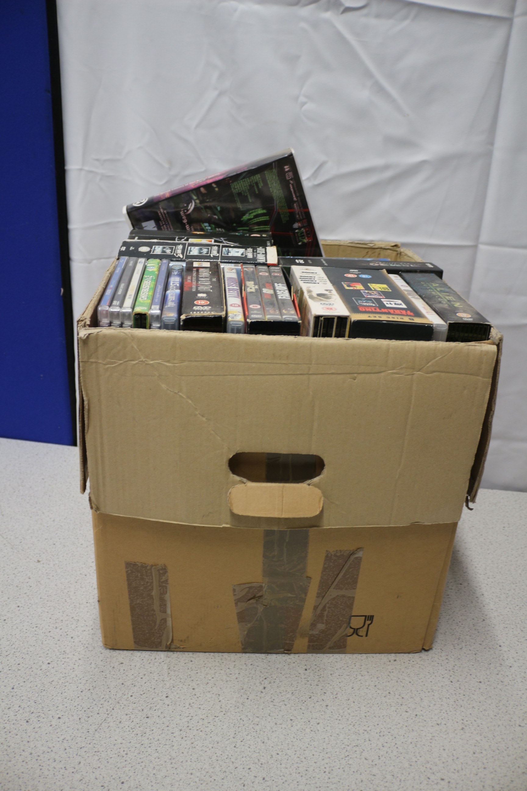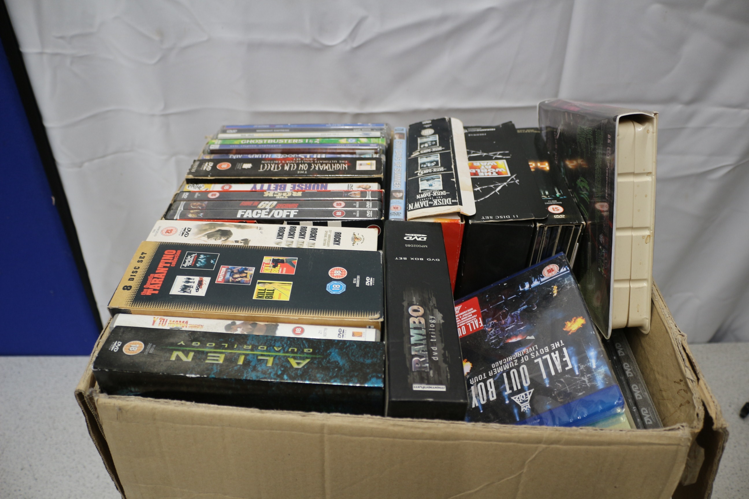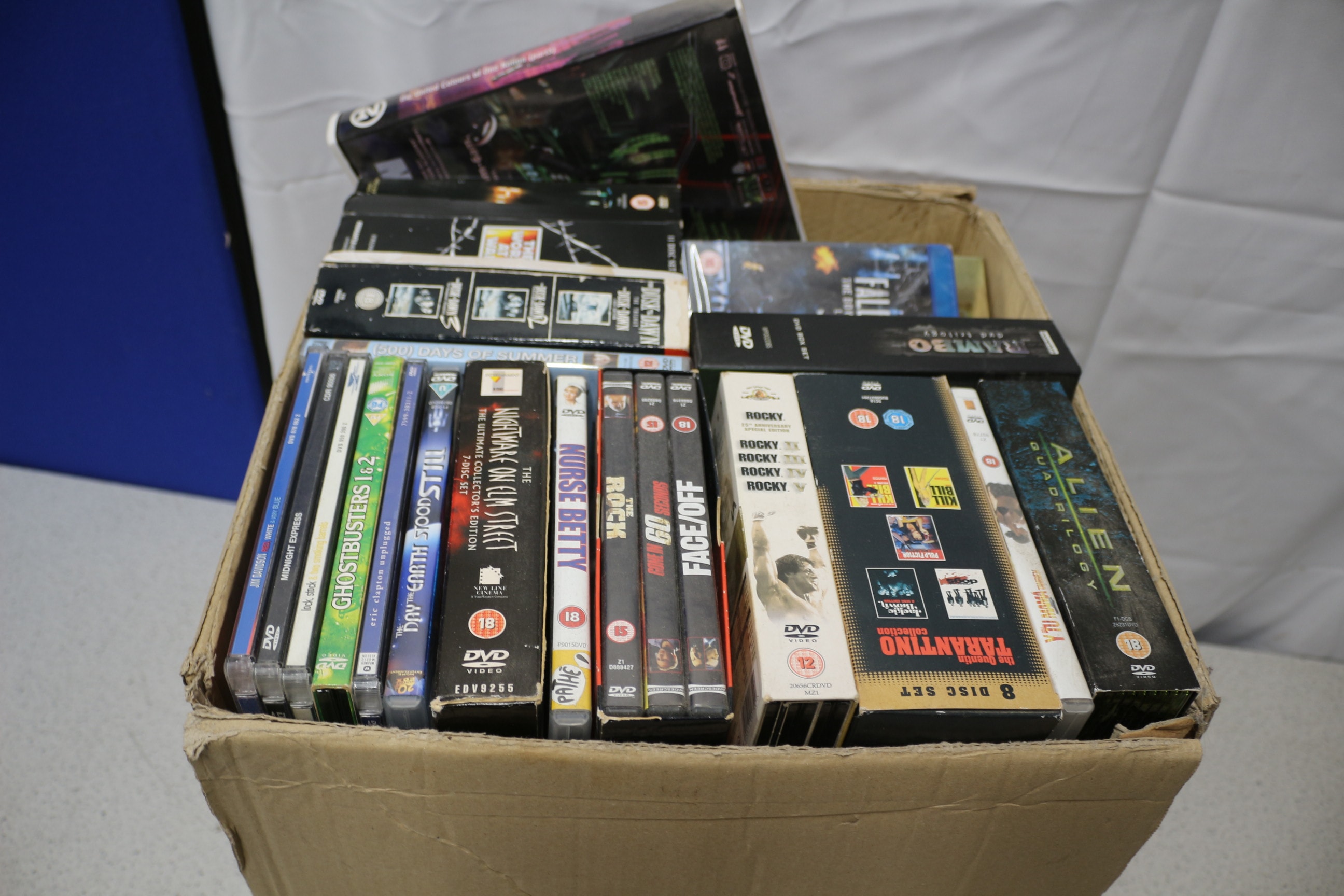A collection of assorted DVD movies, including titles such as Ghostbusters, Rocky, Alien, Rambo, Pulp Fiction, and Kill Bill.