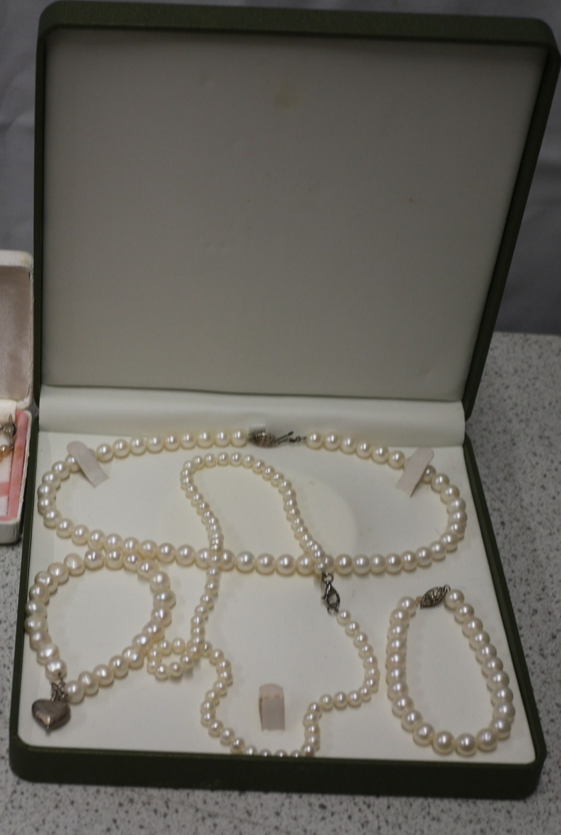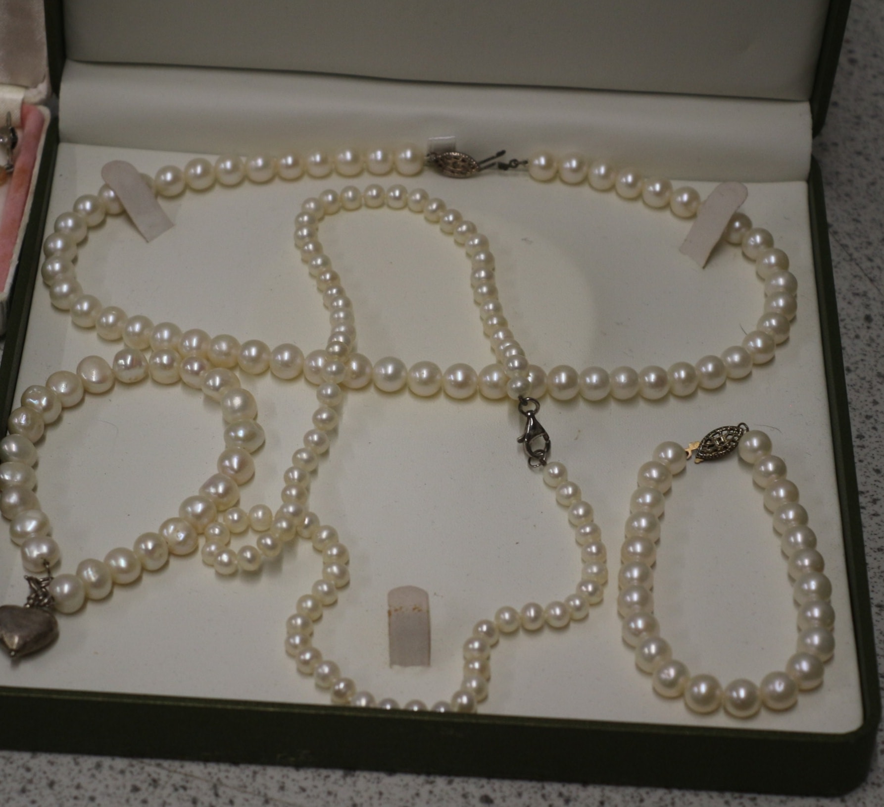 A collection of cream-coloured pearl jewellery pieces, including necklaces and bracelets