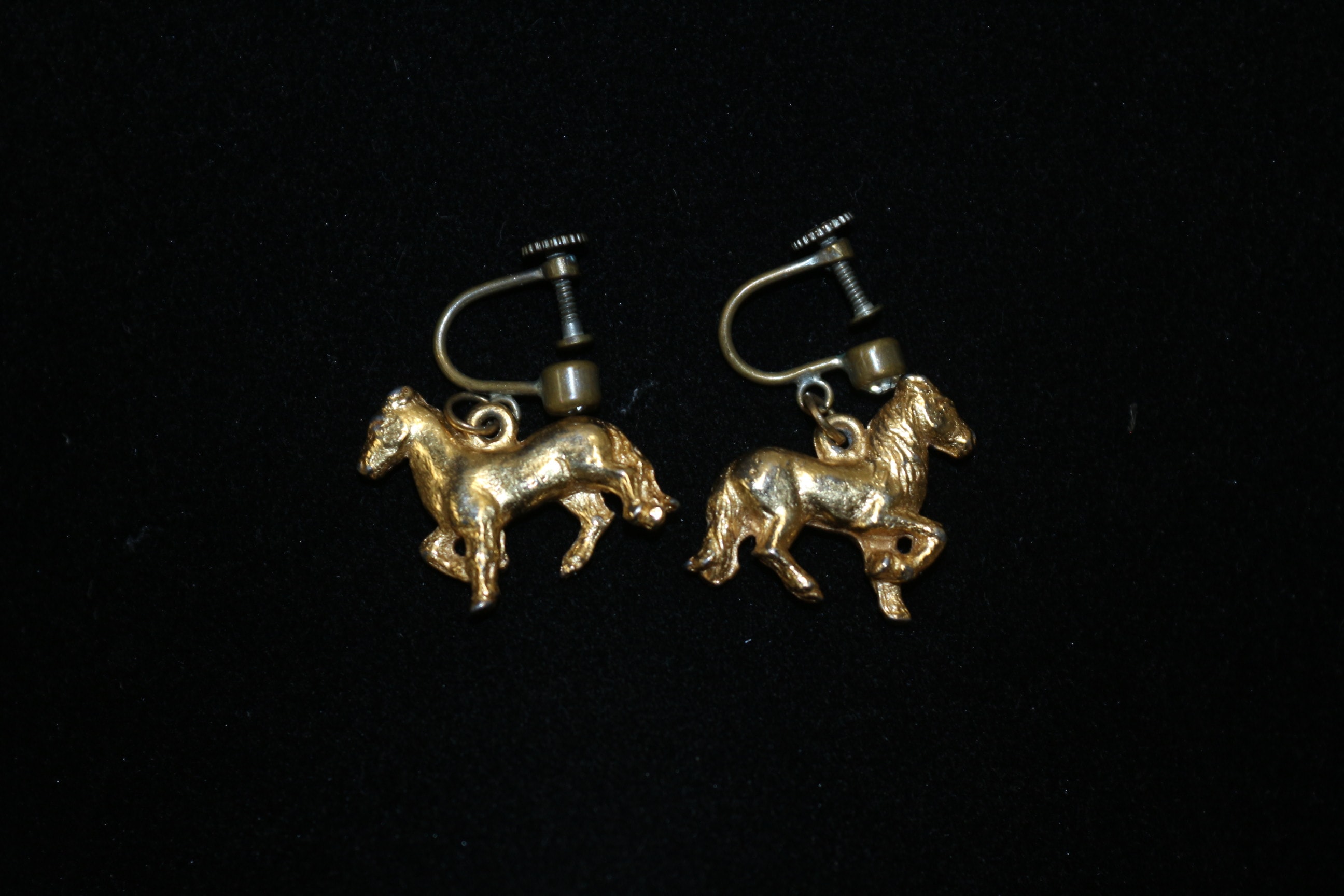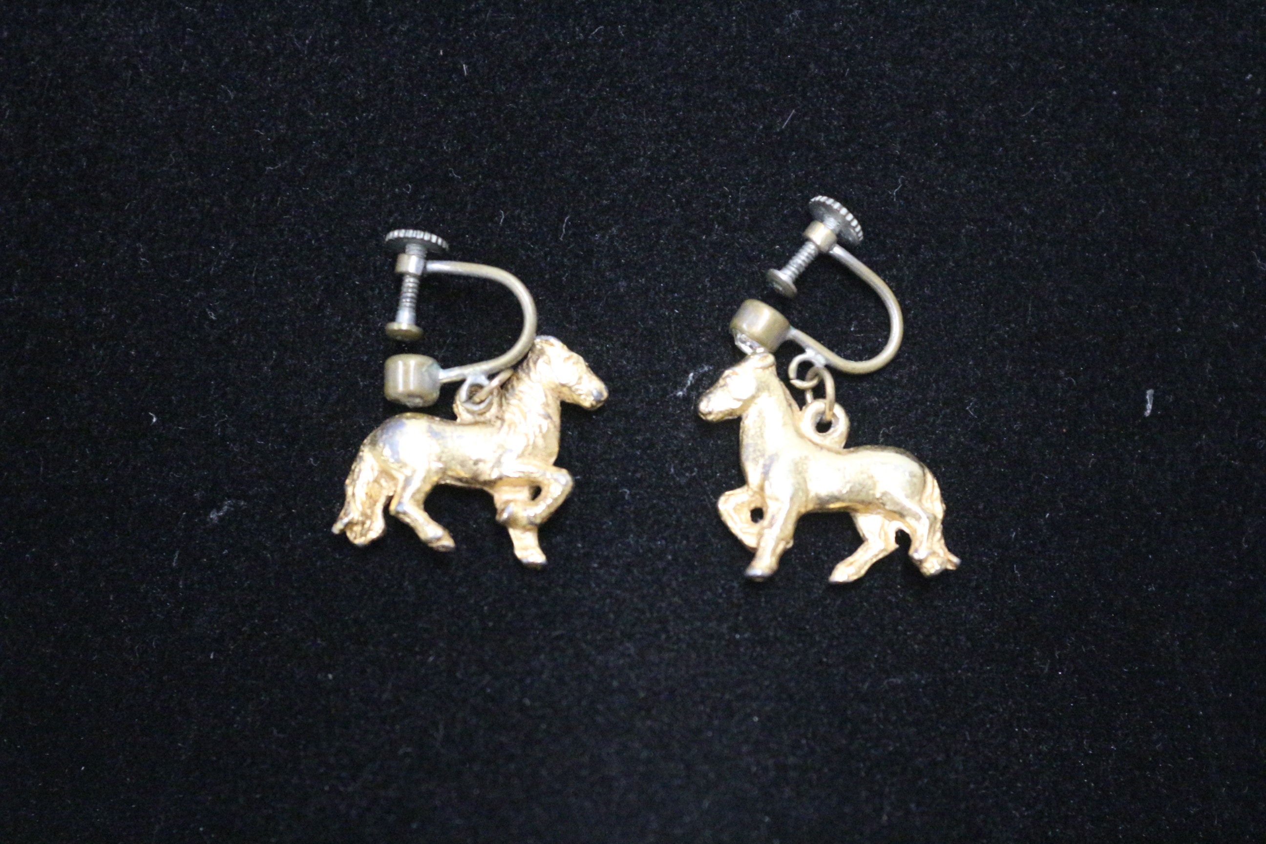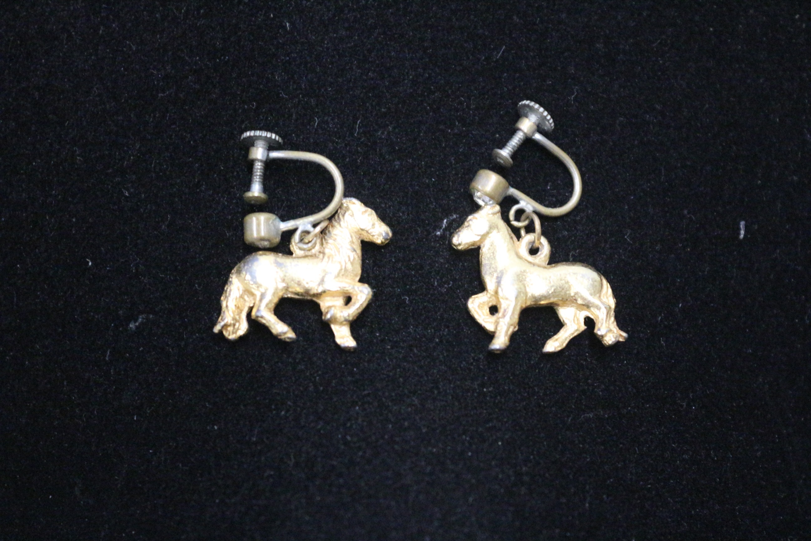 A pair of vintage gold-tone horse-shaped screw-back earrings with silver-tone findings.