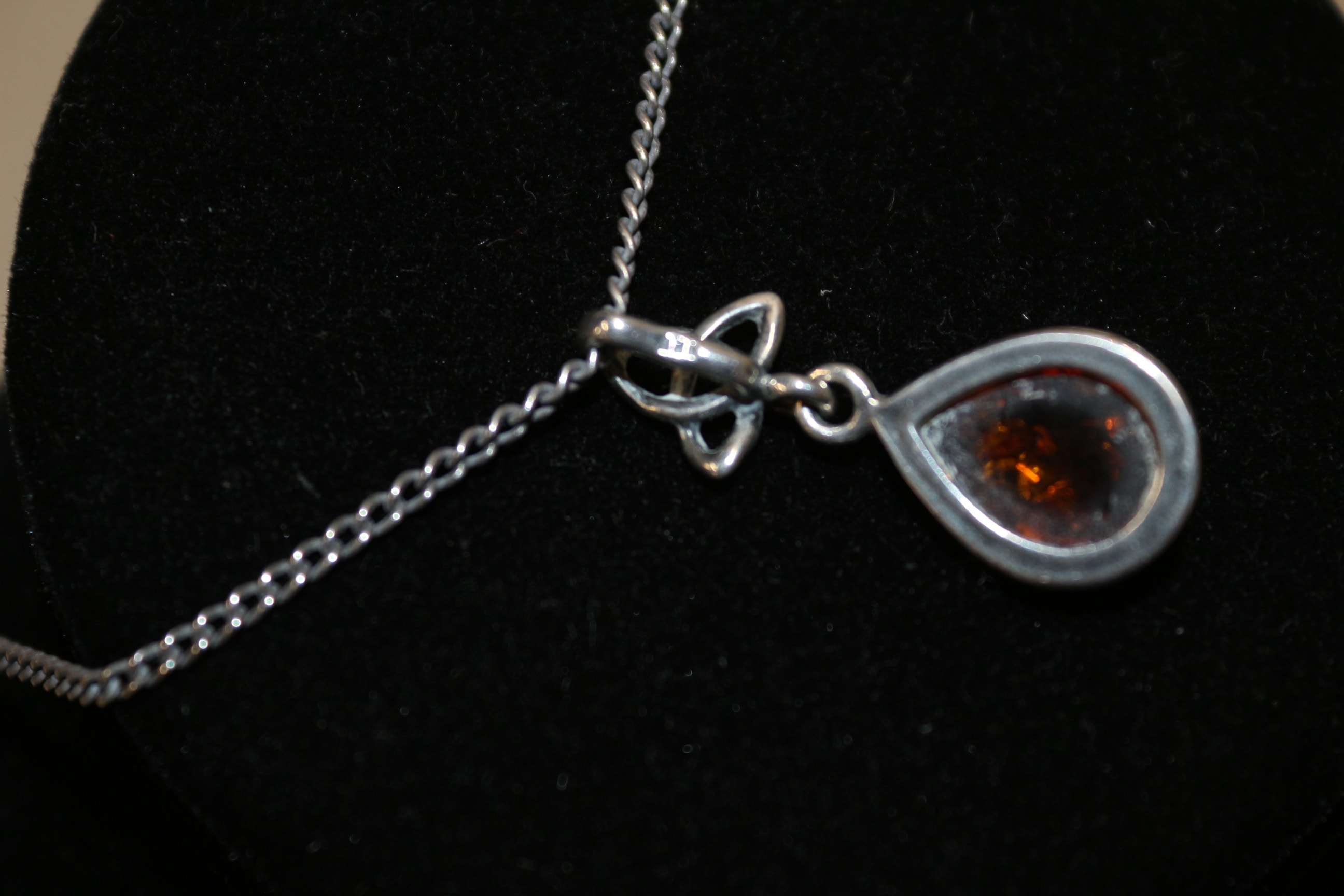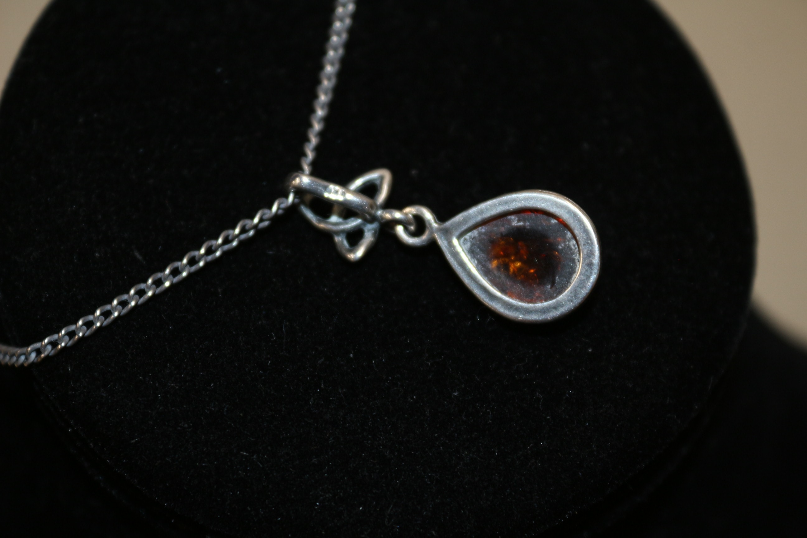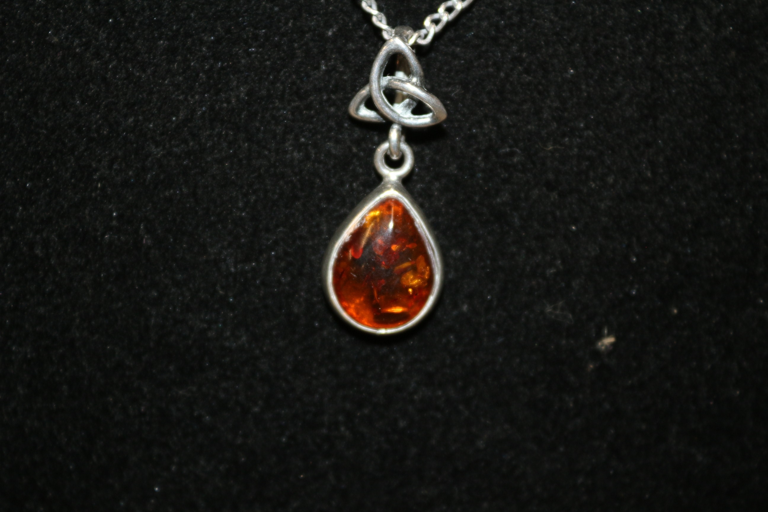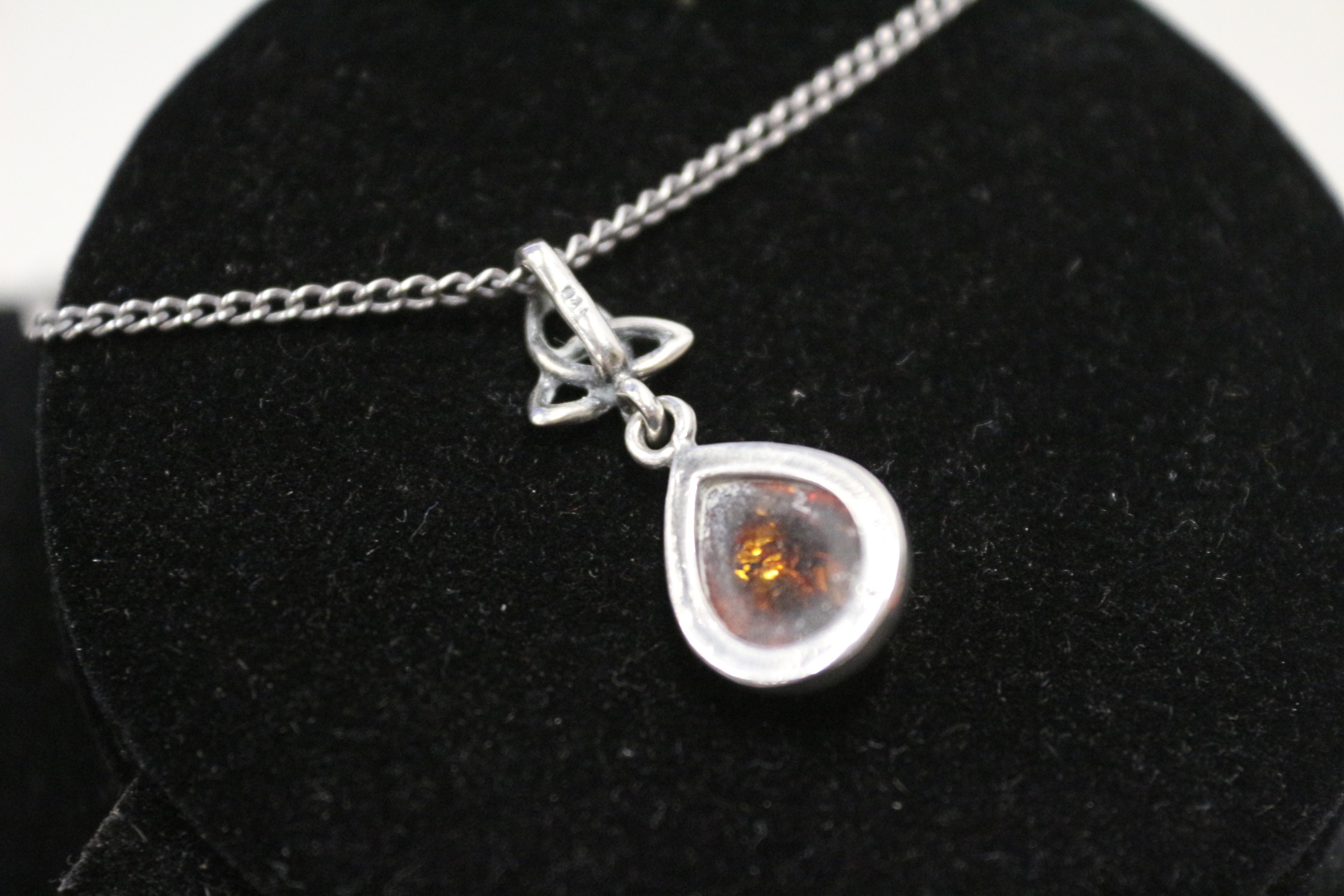 A sterling silver marked 925 necklace with a Celtic knot pendant holding a tear-shaped natural honey amber gemstone.
