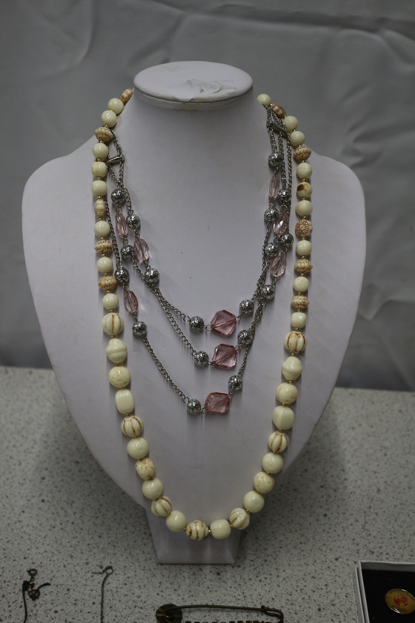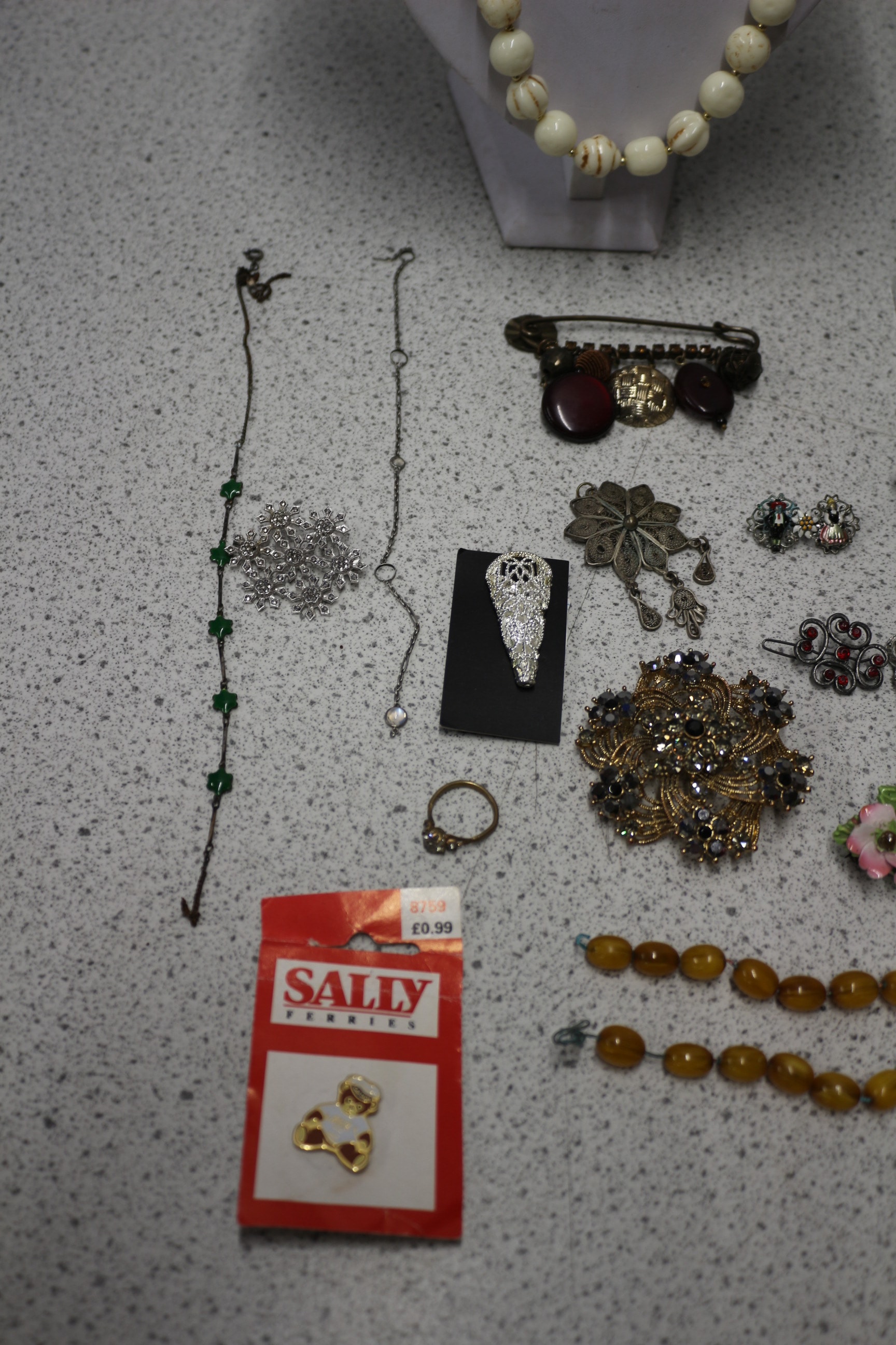 A triple strand faux pearl and silver-toned necklace, accompanied by a group of costume jewellery including two gold-toned Sally Ferries brooches/pins (one shaped like shoes, one abstract), and various other brooches, earrings, and loose beads.