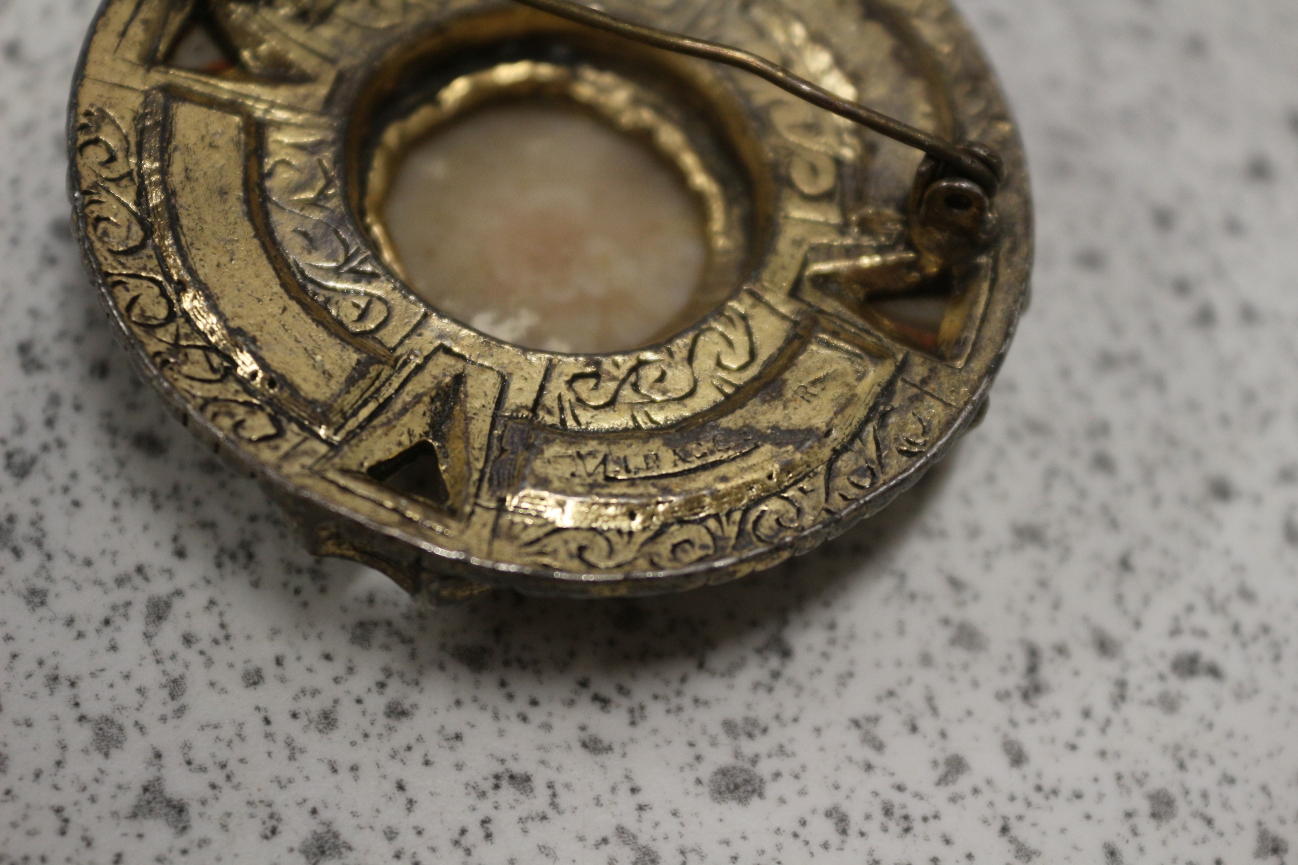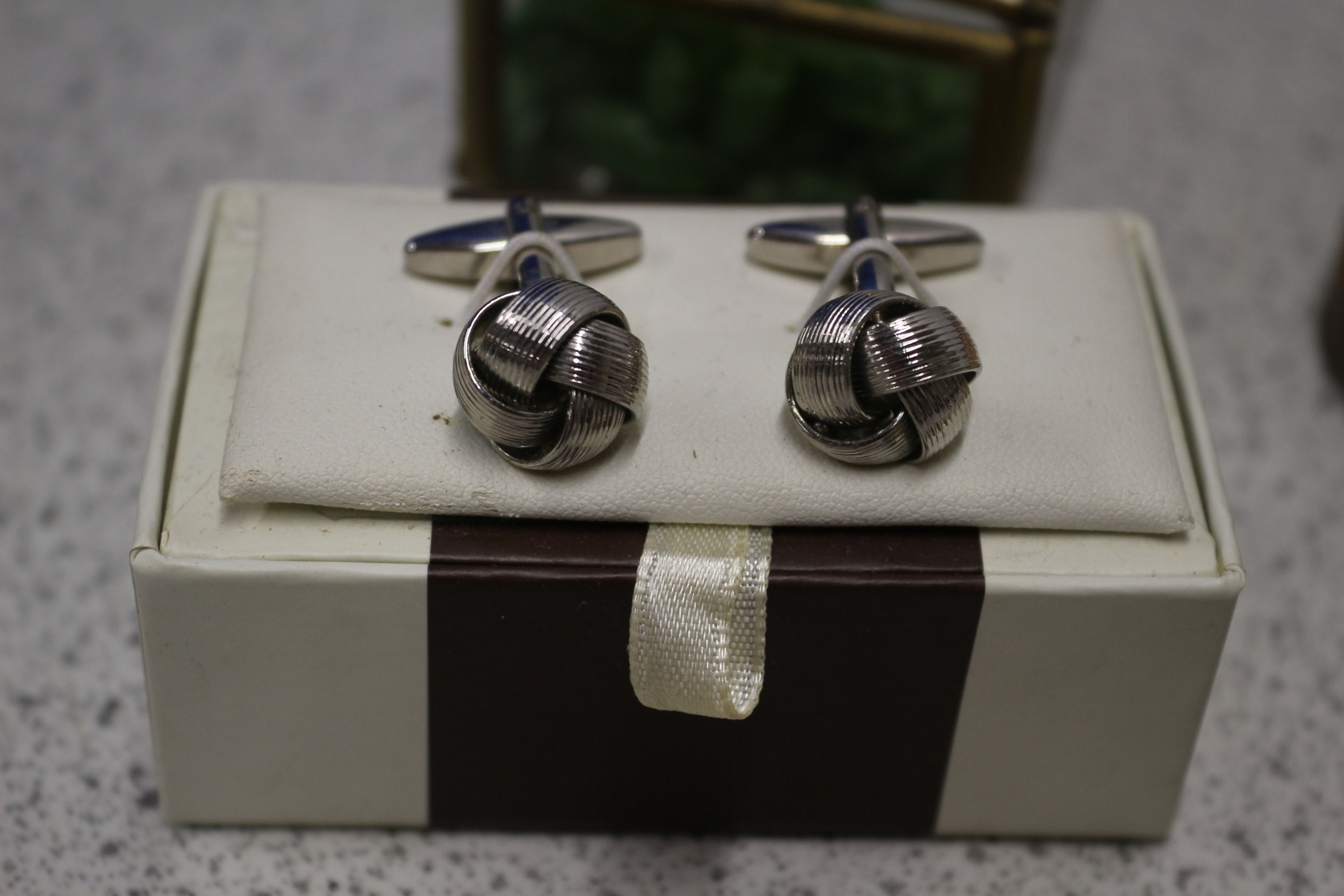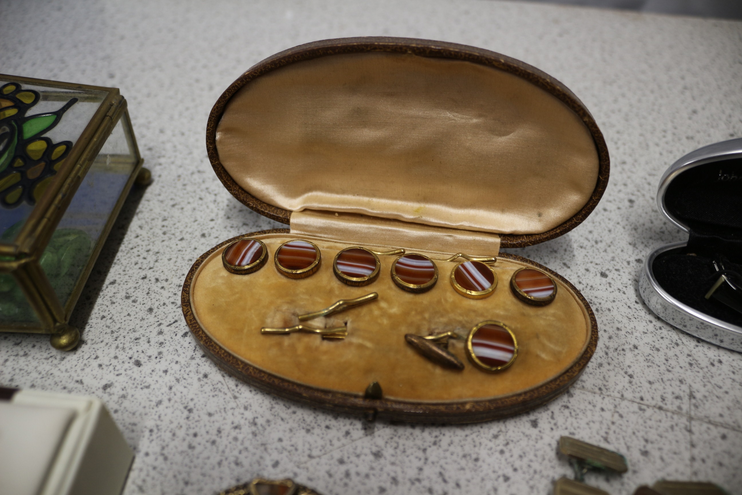 A brown oval presentation case holding six gold-toned shirt studs, two cufflinks, and two small bar accessories, all featuring brown and white banded stones.