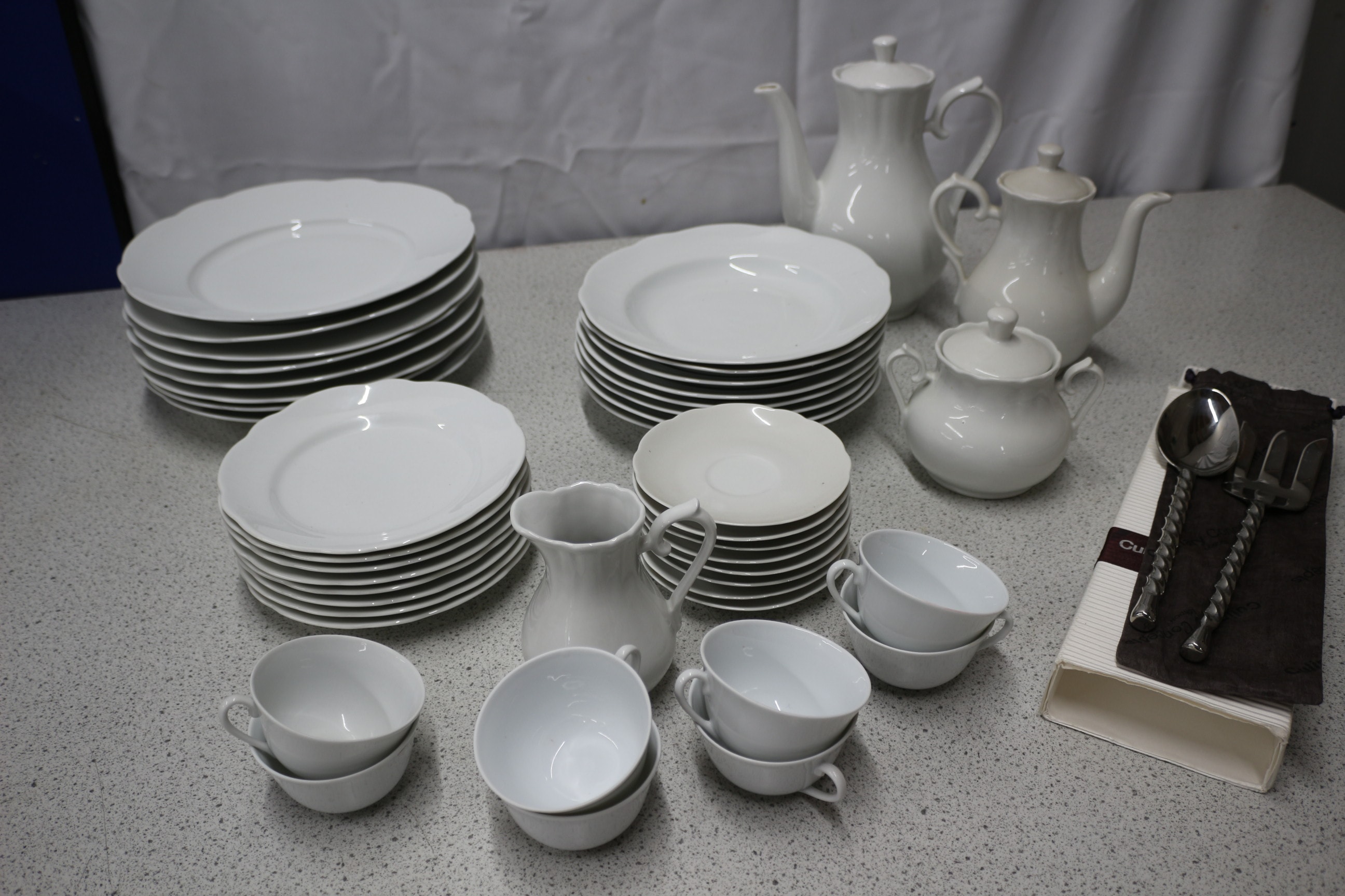 A large collection of white porcelain dinnerware including plates, cups, teapots, a sugar bowl, and a creamer, accompanied by a pair of ‘Culinary Concepts London’ twisted-handle serving utensils.