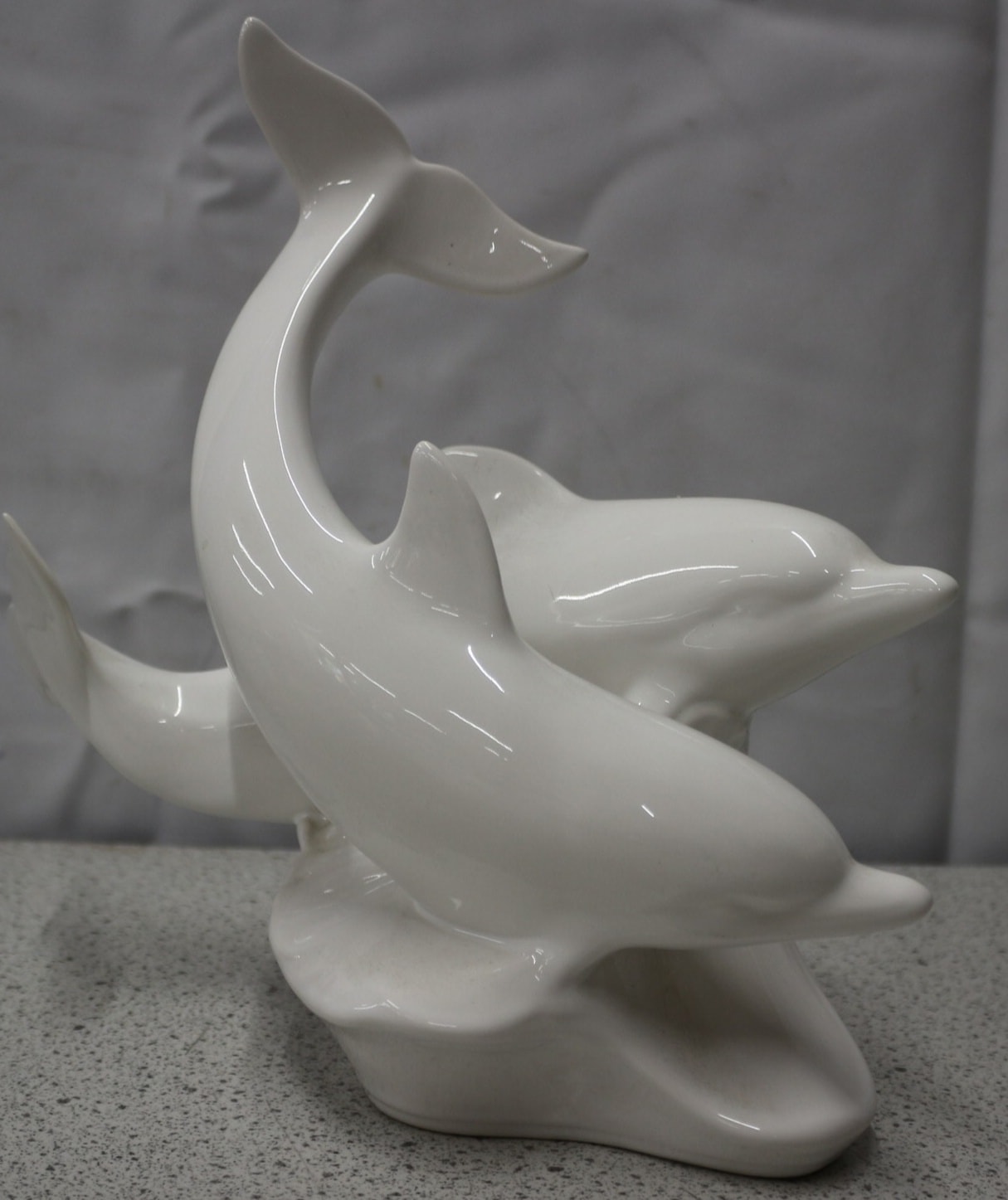 A white glossy ceramic figurine depicting two dolphins, with ‘POOLE ENGLAND’ visible on the base. 25cm Tall