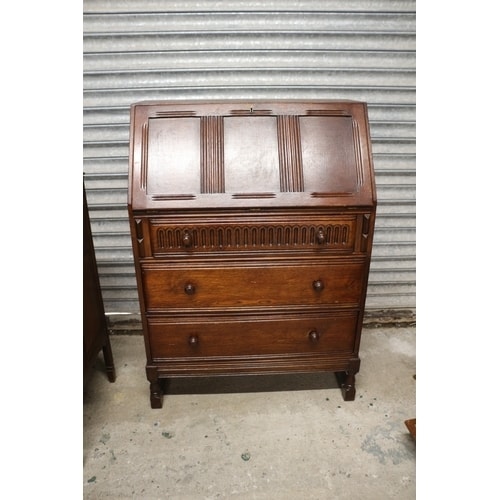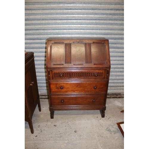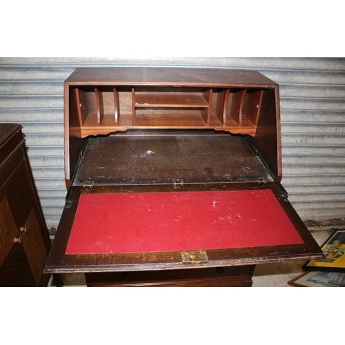 A dark brown wooden bureau with a drop-front desk and a red writing surface. 107cm Tall