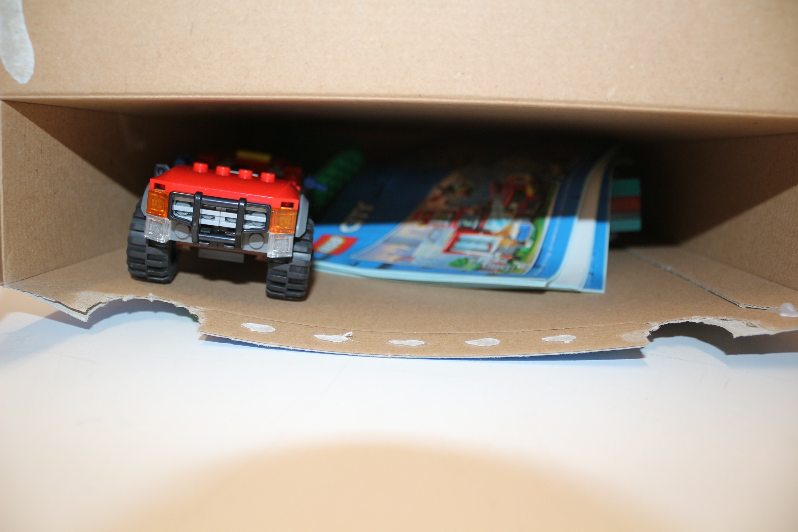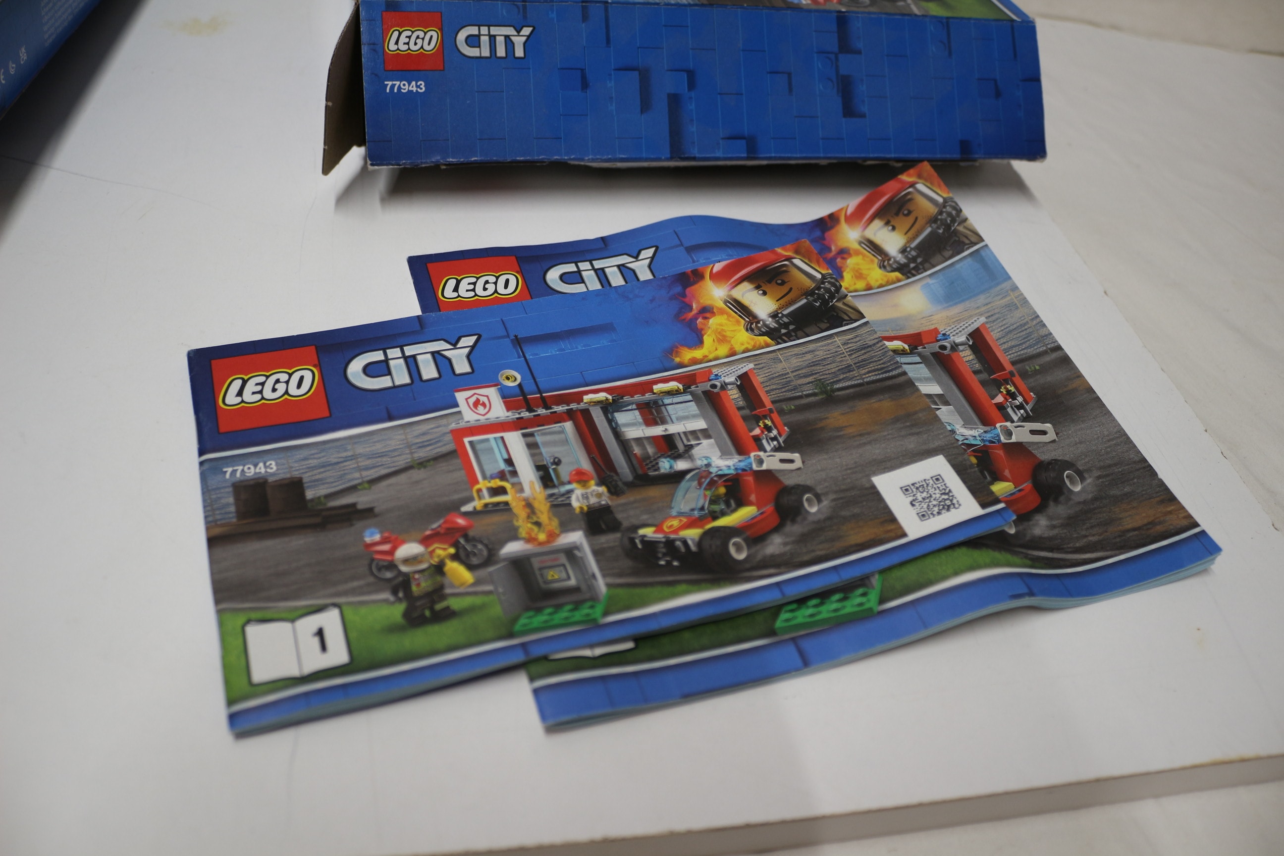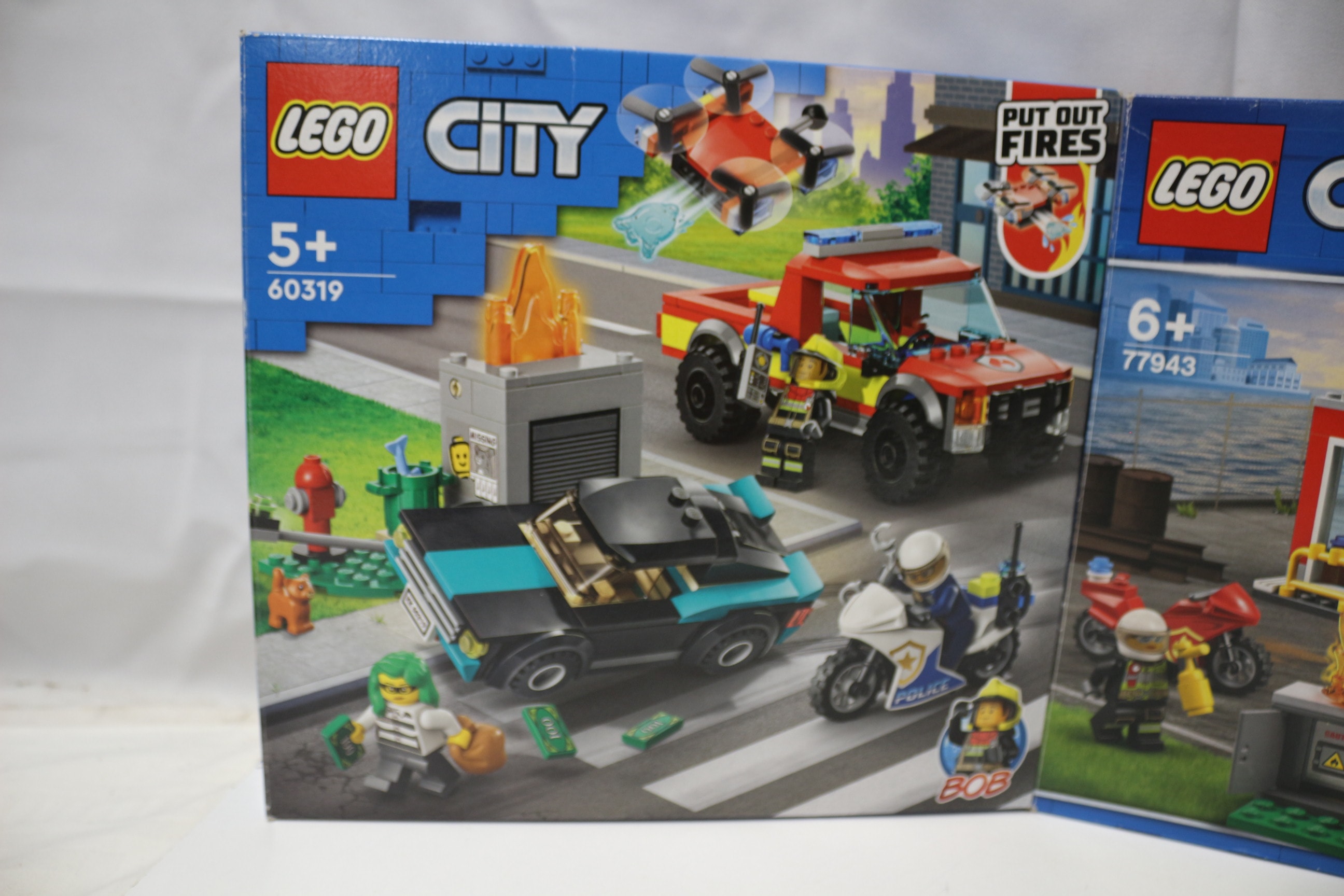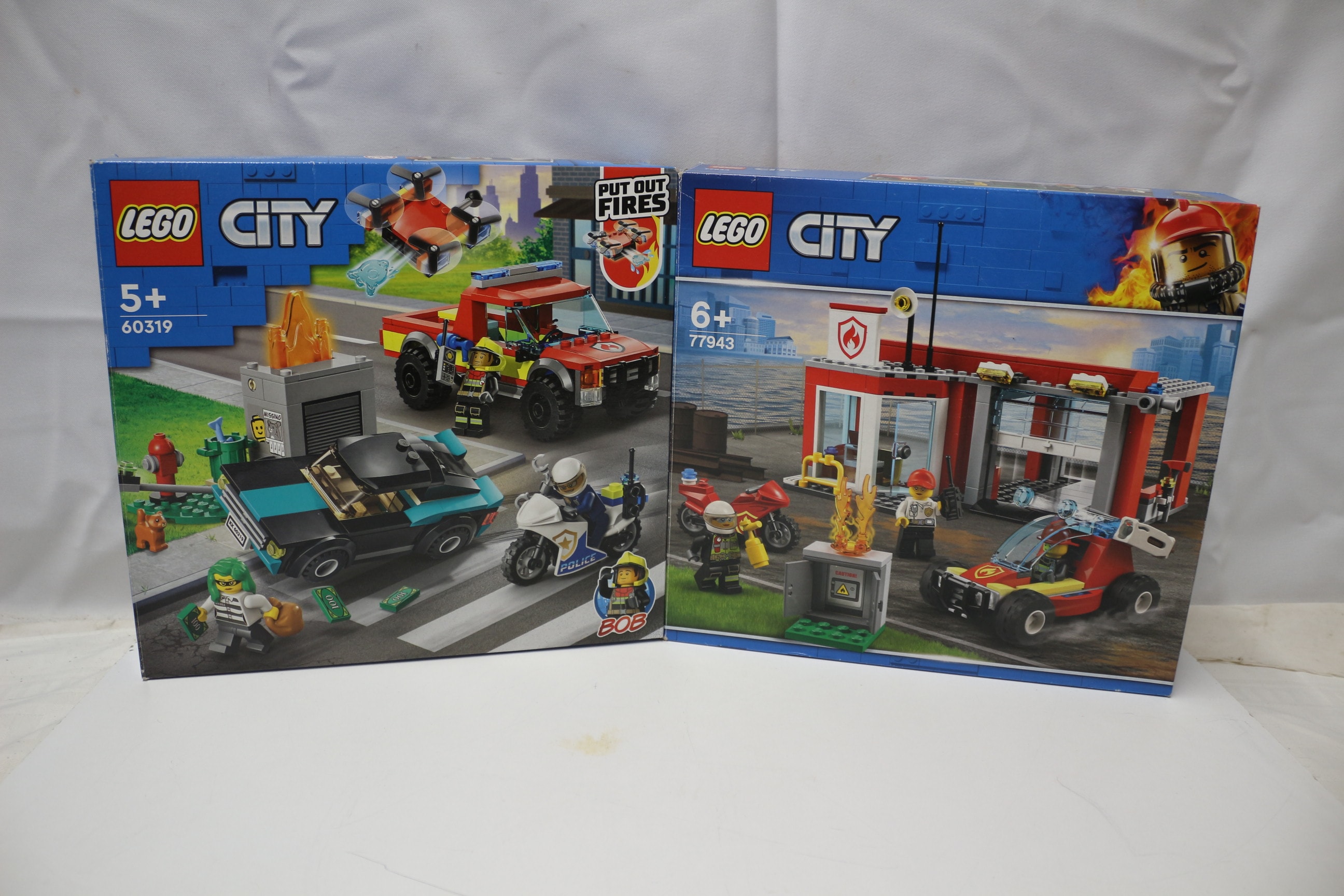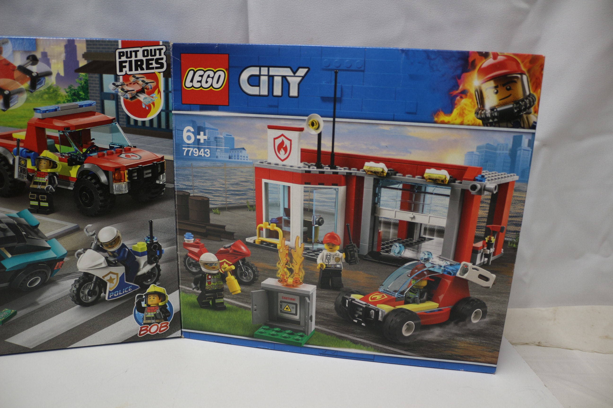 2 x LEGO CITY sets labelled ‘LEGO CITY’ and ‘PUT OUT FIRES’, depicting a colourful scene featuring a fire station, fire buggy, and a motorcycle.