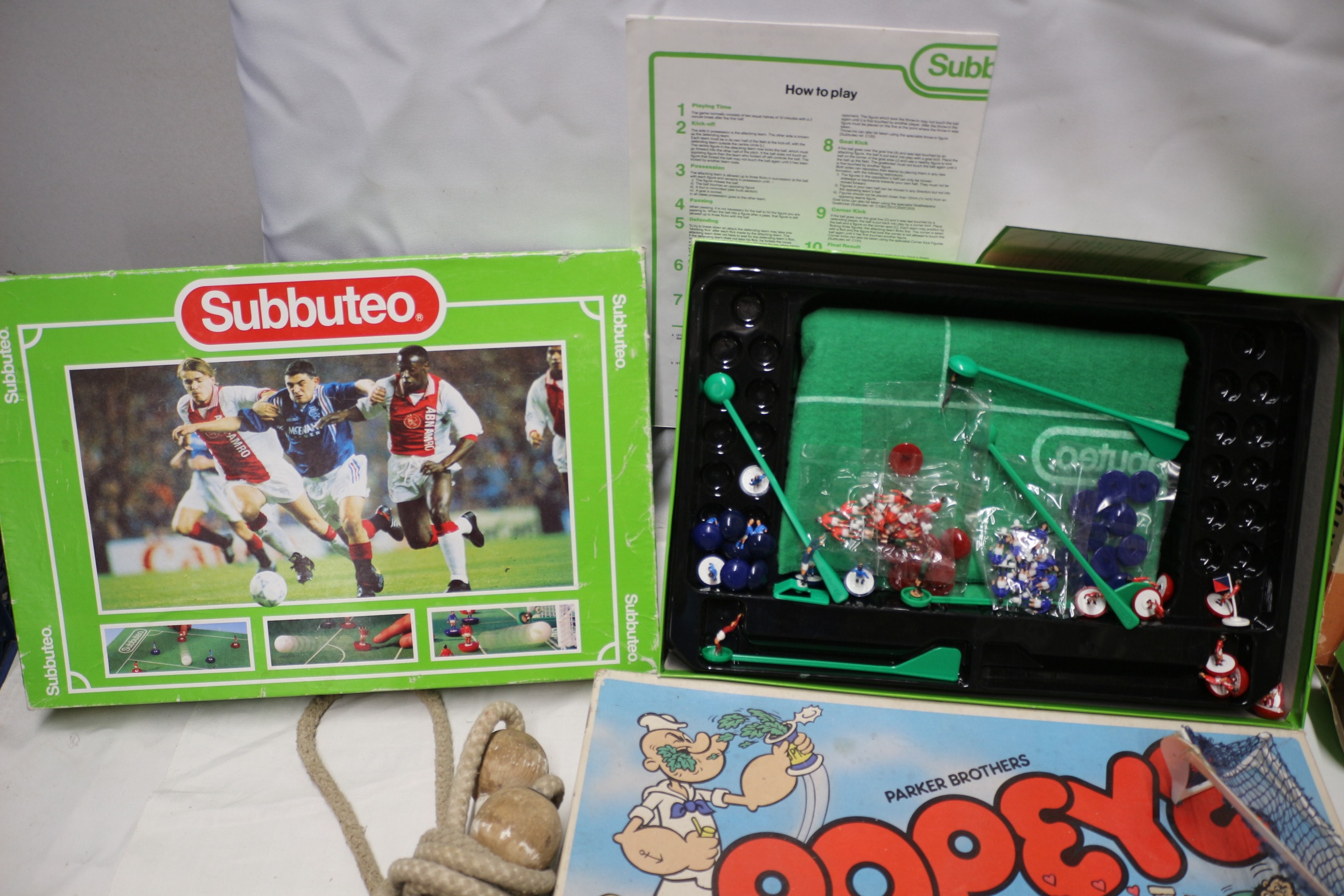 A collection of board and table games features Subbuteo sets with figures and accessories, a blue and white Parker Brothers POPEYE board game, a red and cream MONOPOLY game, green playing mats, goals, assorted balls, a skipping rope, and Subbuteo price lists and manuals from 1966-67 and 1970-71.