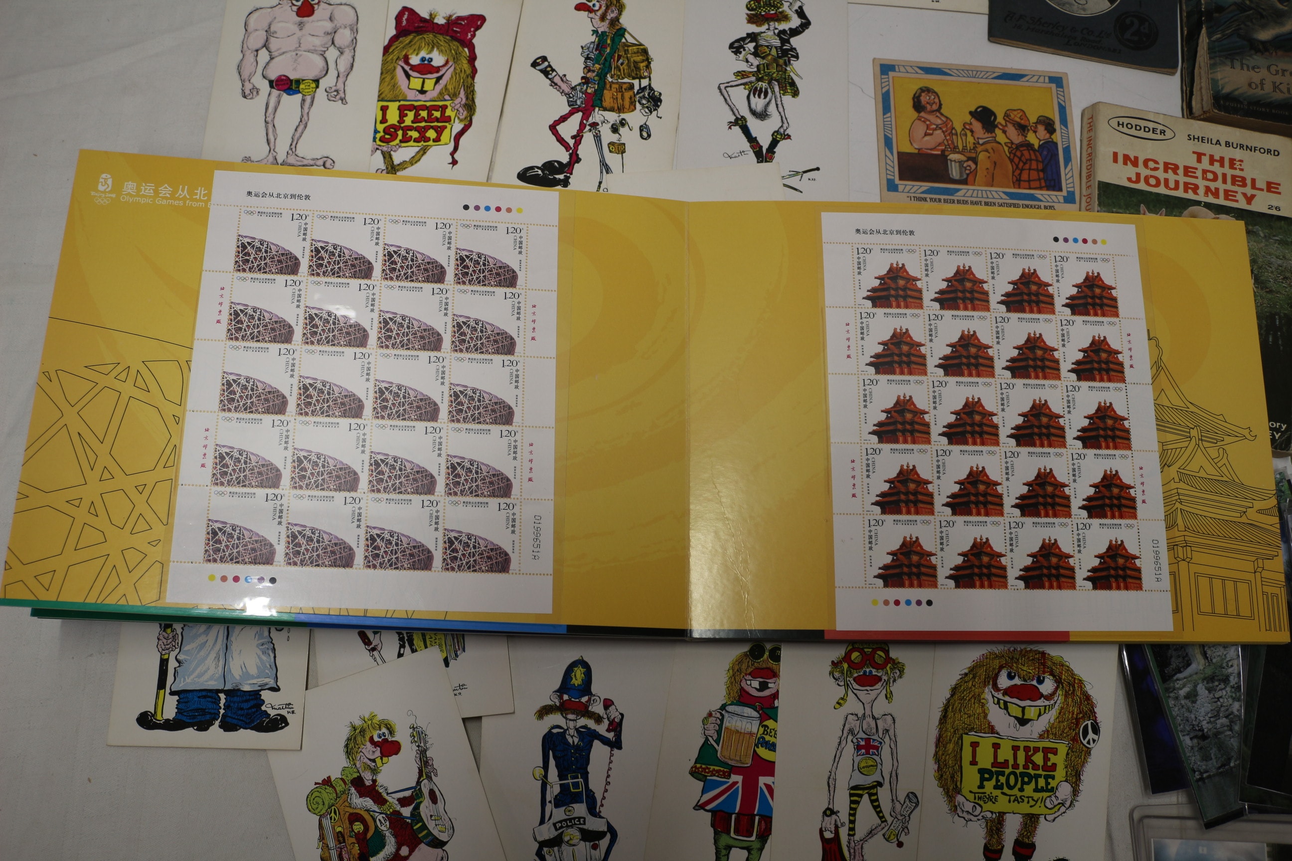 Mixed lot including One large, commemorative stamp album/folder with a red and blue cover, featuring the text “奥林匹克运动会从北京到伦敦” (Olympic Games from Beijing to London), “2008”, “2012”, and the Beijing 2008 Olympic rings logo; it contains multiple sheets of 120-unit postage stamps with Olympic and architectural designs, as well as two “2008 F.D.C.” and “2012 F.D.C.” envelopes with corresponding stamps and “London 2012” cancellations. postcards, costume jewellery and more
