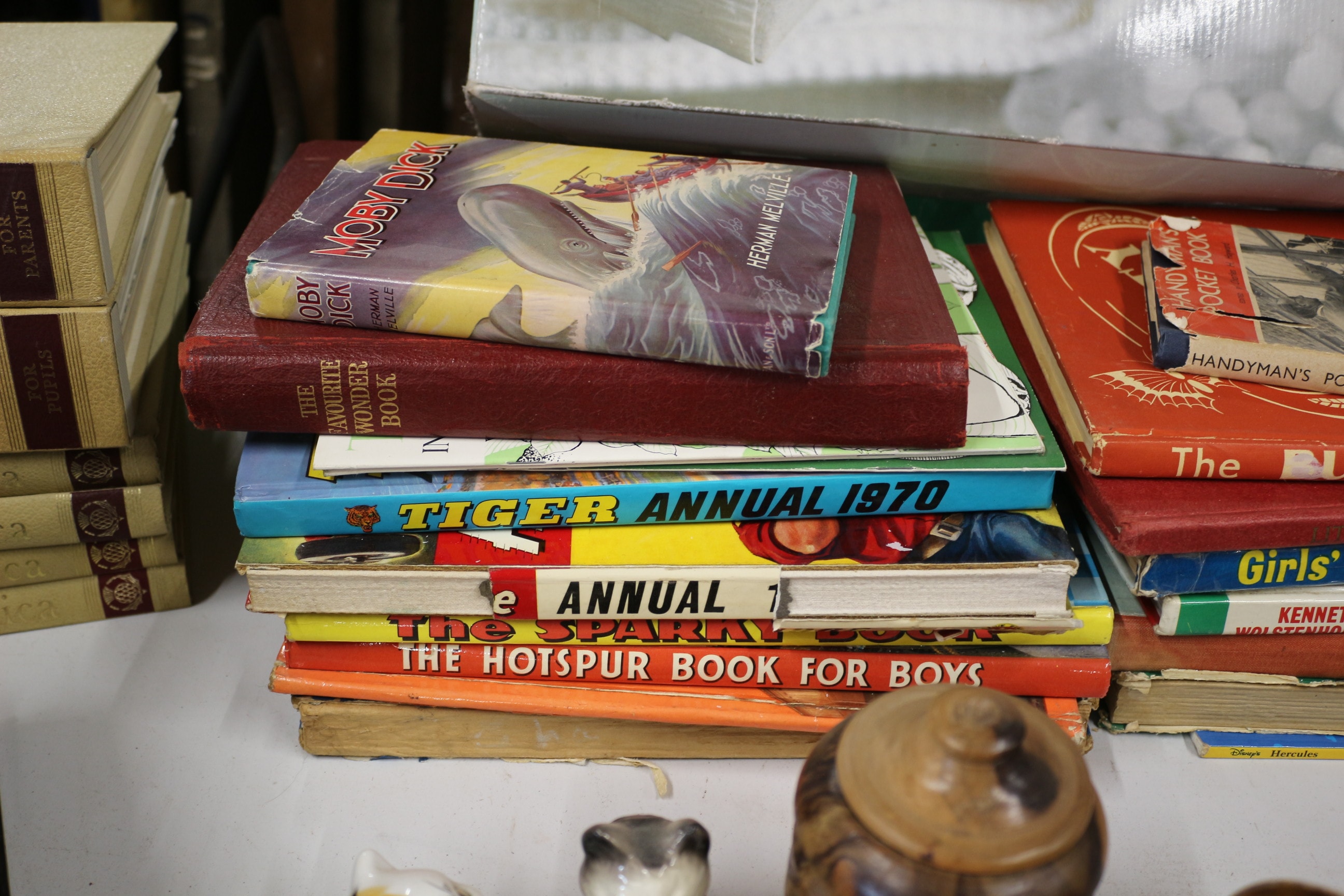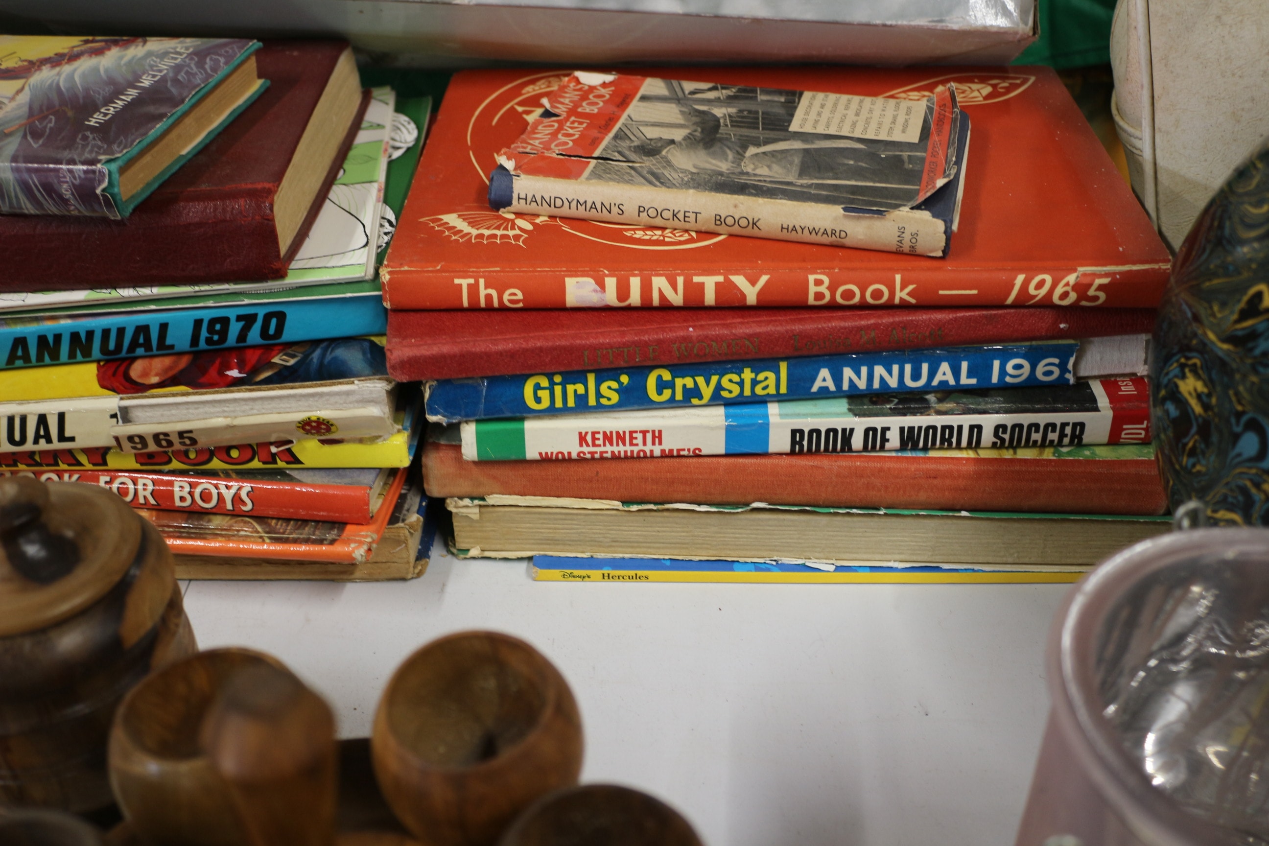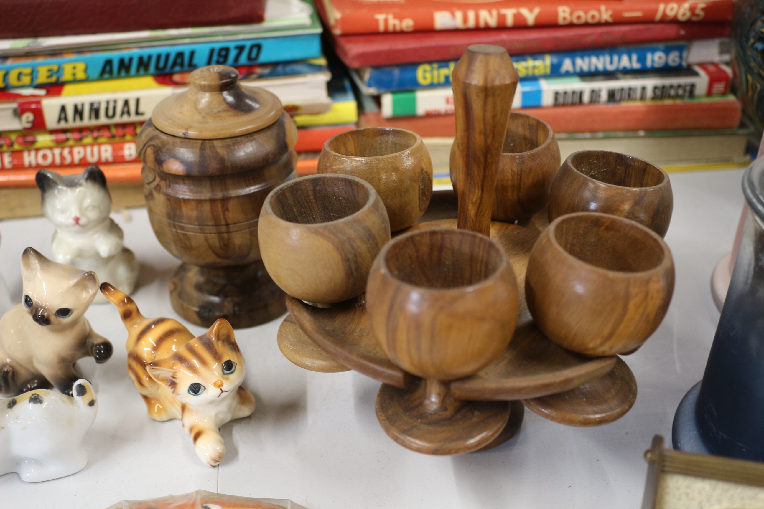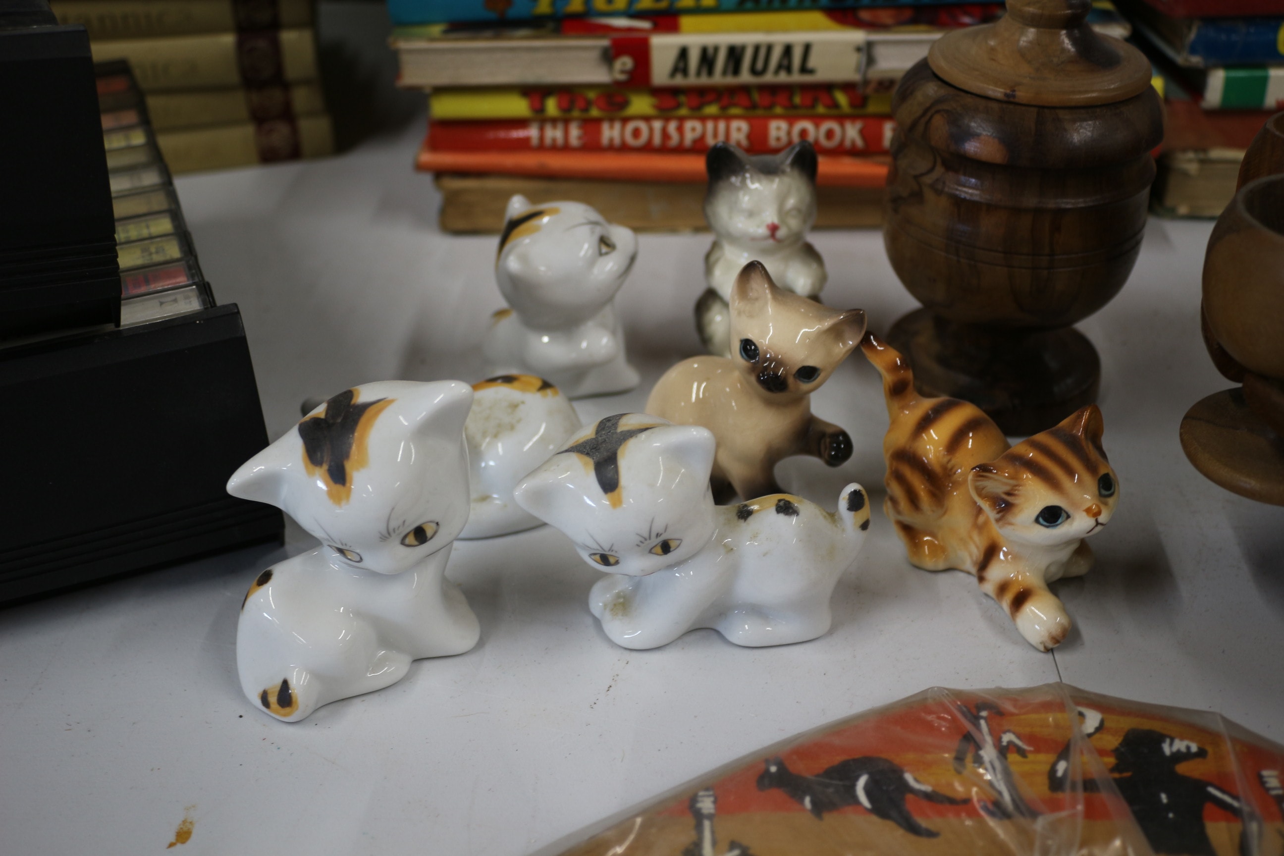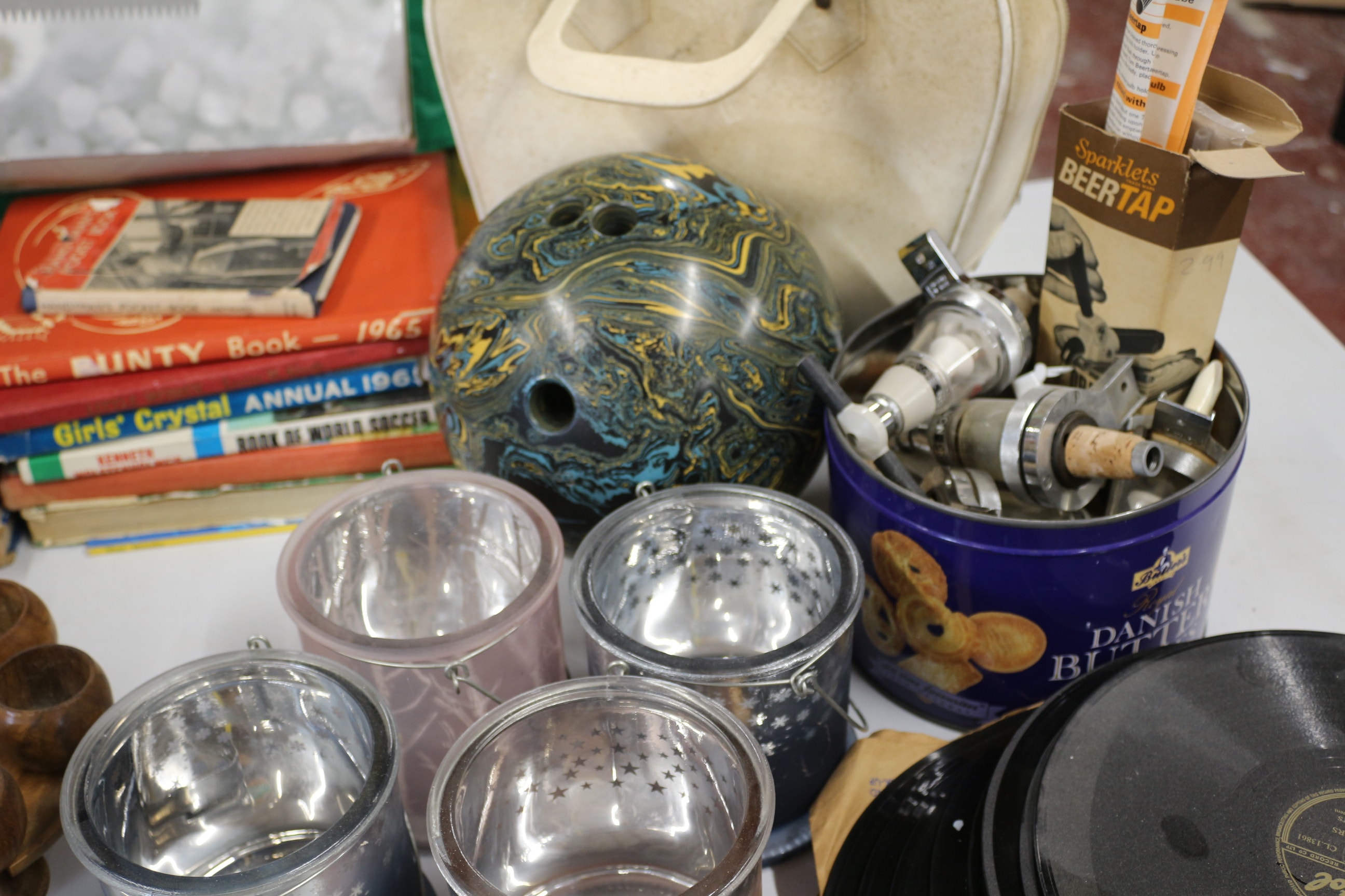 A collection of miscellaneous items including a bowling ball, various books and annuals, ceramic cat figurines, woodenware, vinyl records, and other household goods.