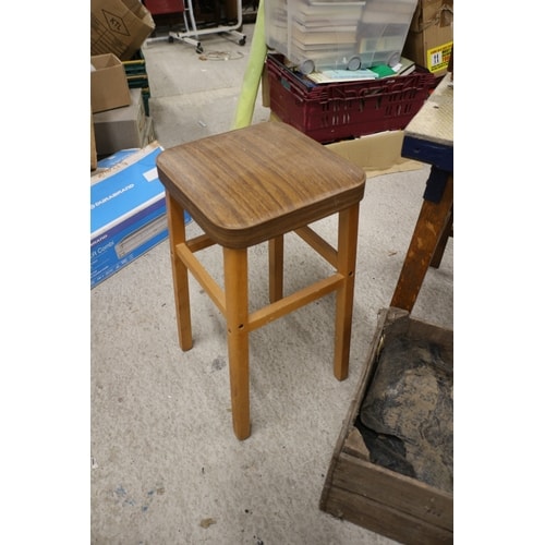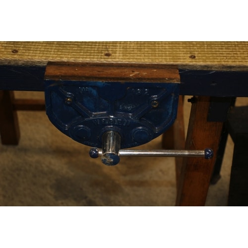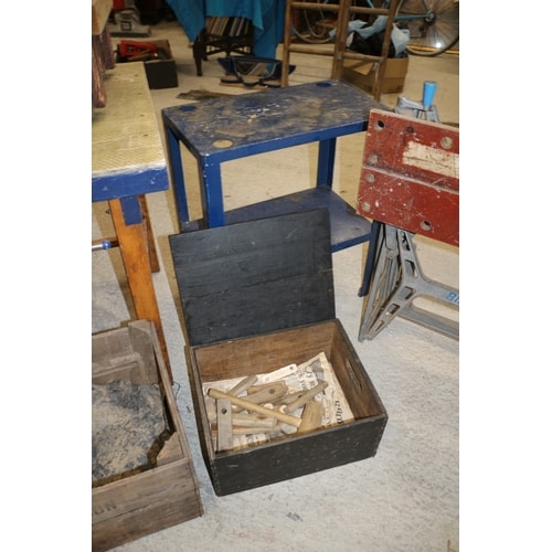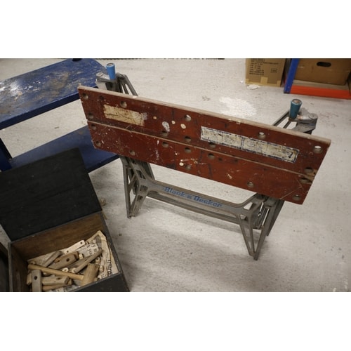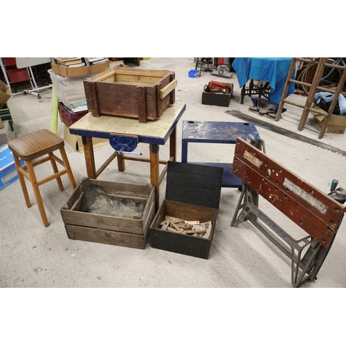 A collection comprising a red and silver/grey Black & Decker WORKMATE portable workbench, a wooden stool, a blue workbench with a vice, a small blue table, a wooden crate with a liner, a black wooden box containing wooden mallets/pegs, and a ‘Merrolson’ wooden crate.