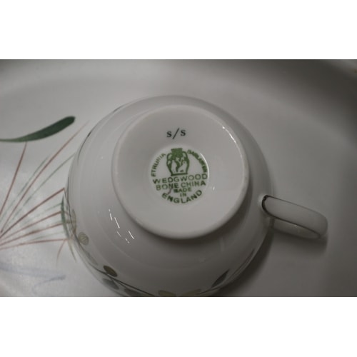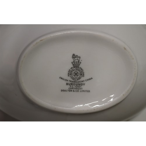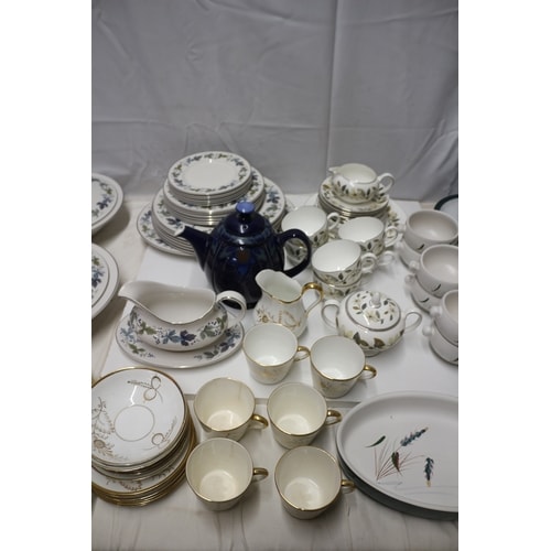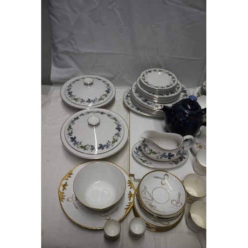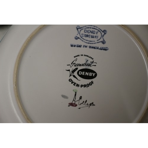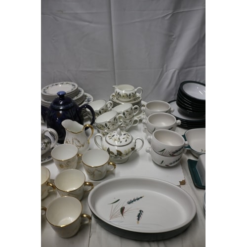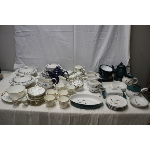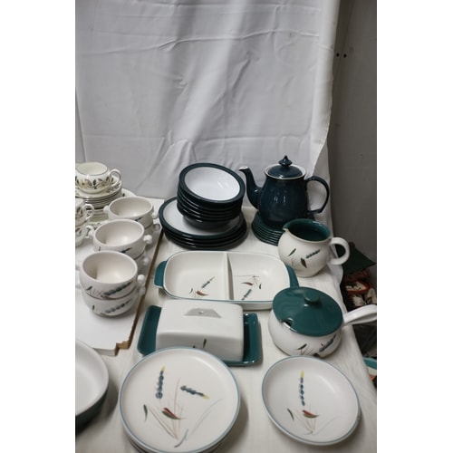 A large assortment of ceramic dinnerware and serving pieces, predominantly white with blue, green, and gold accents, including Denby “Greenwheat” stoneware (oven-proof), Wedgwood “Etruria” bone china, and Royal Doulton “Burgundy” English translucent china, all marked “Made in England.” Approx 100 pieces