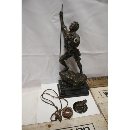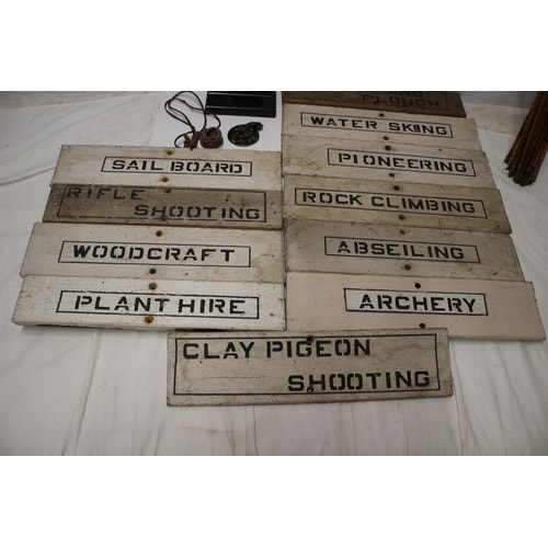 Lot 122: Scouting and Outdoor Pursuits Bundle of Arrows, and Eleven Handmade Wooden Signs, Baden-Powell Figurine AF