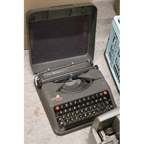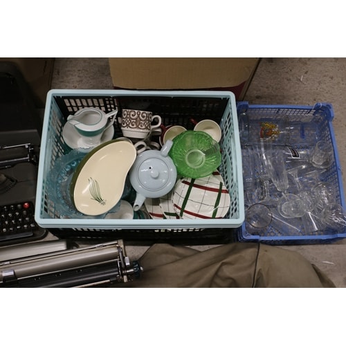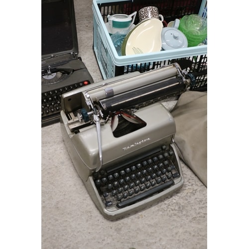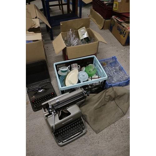 Mixed lot of china, glass and a dark grey Remington Rem-Rand typewriter with red keys and a light grey/silver Adler typewriter.