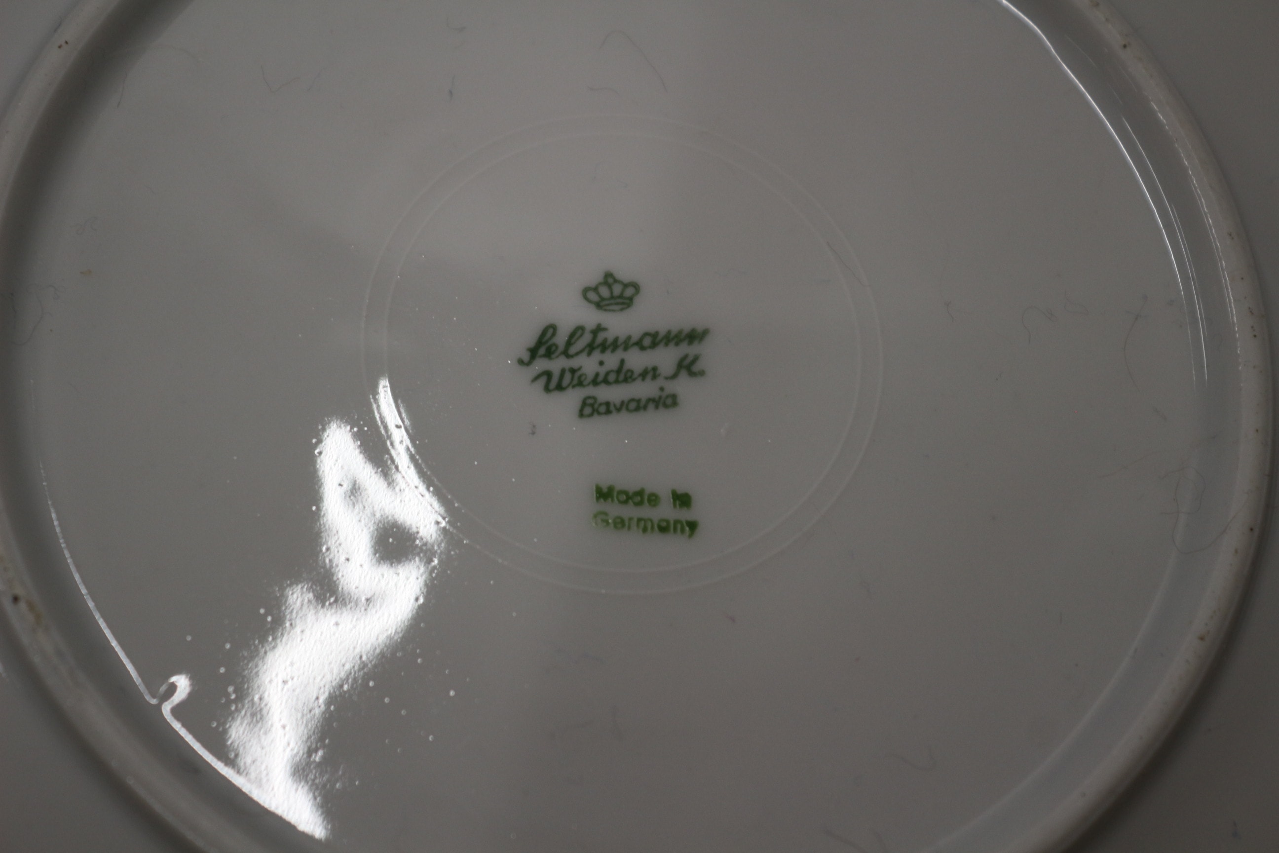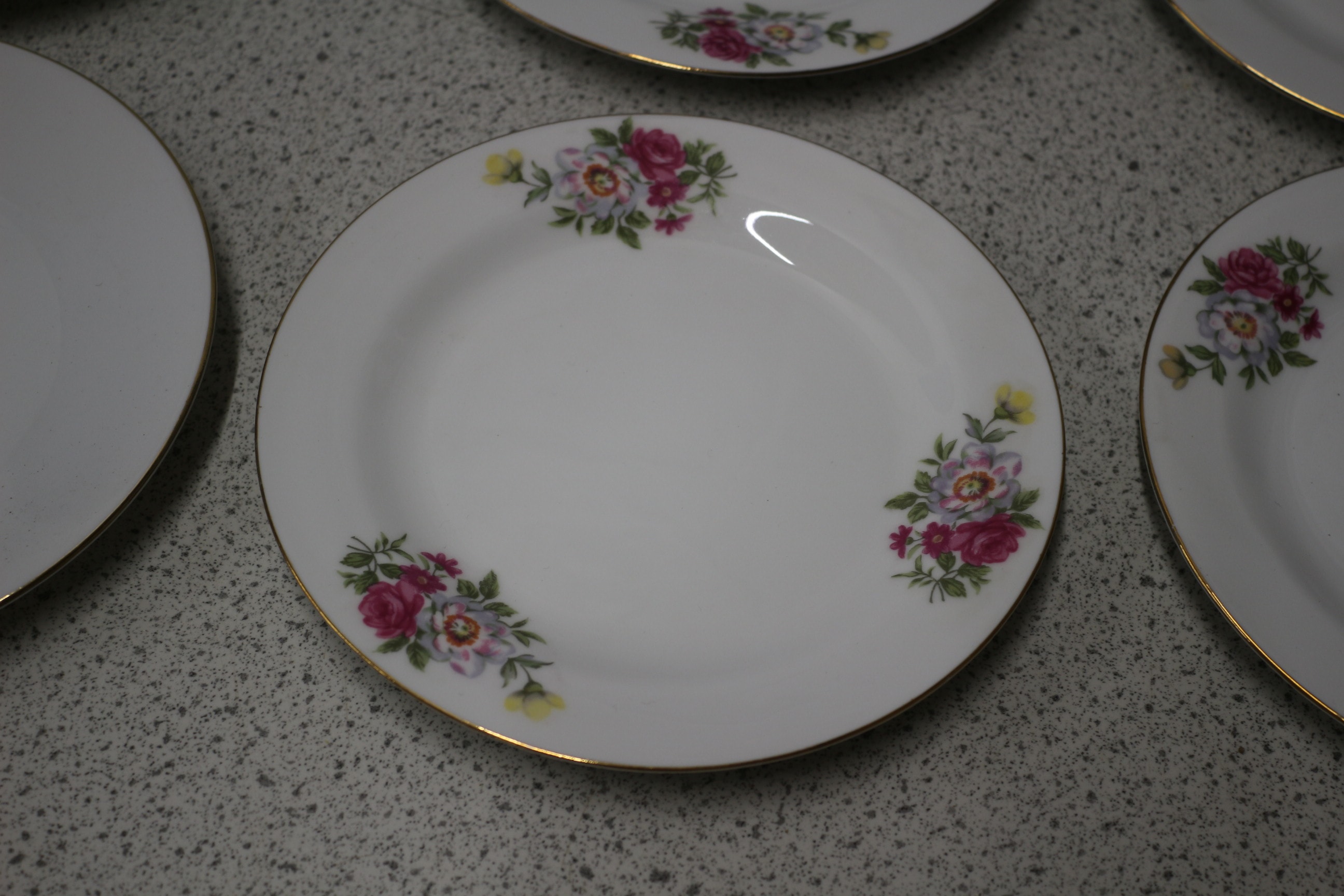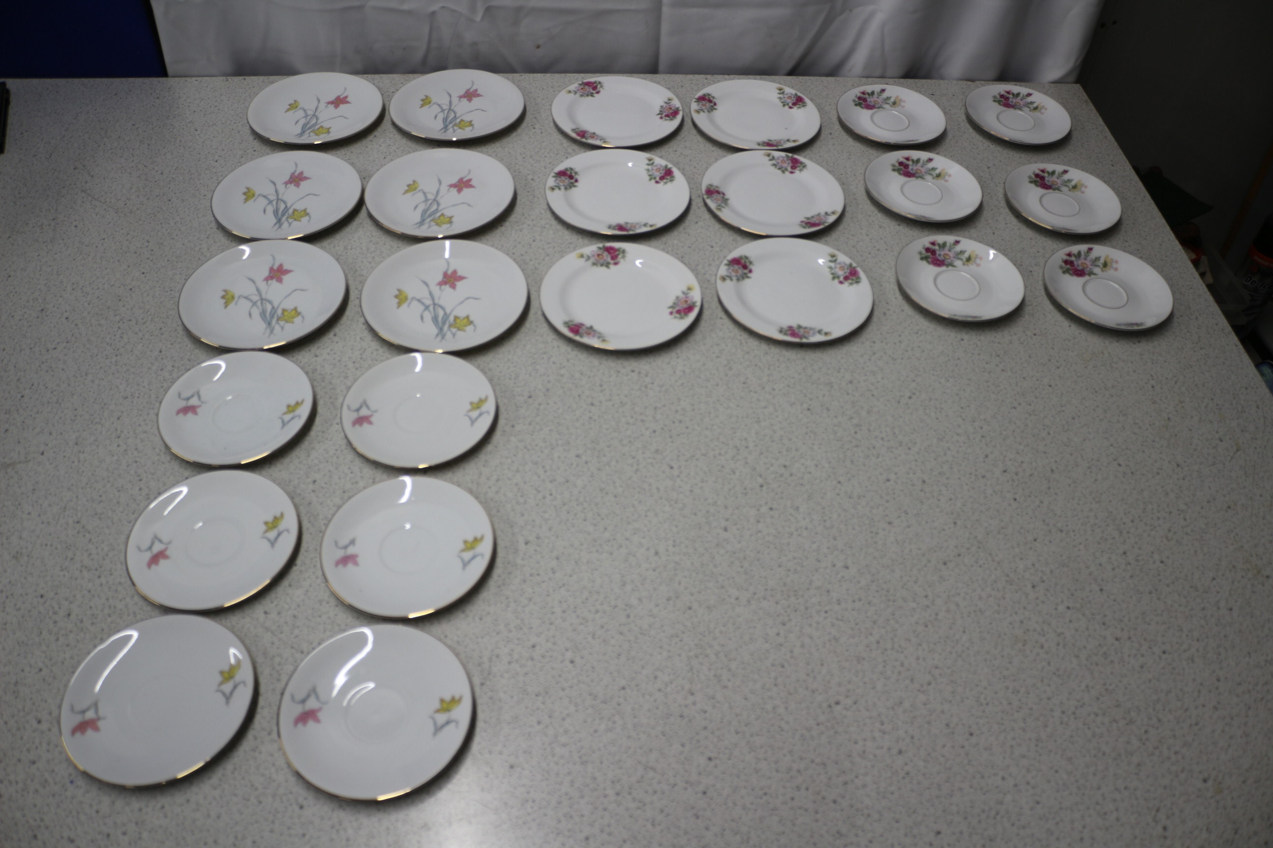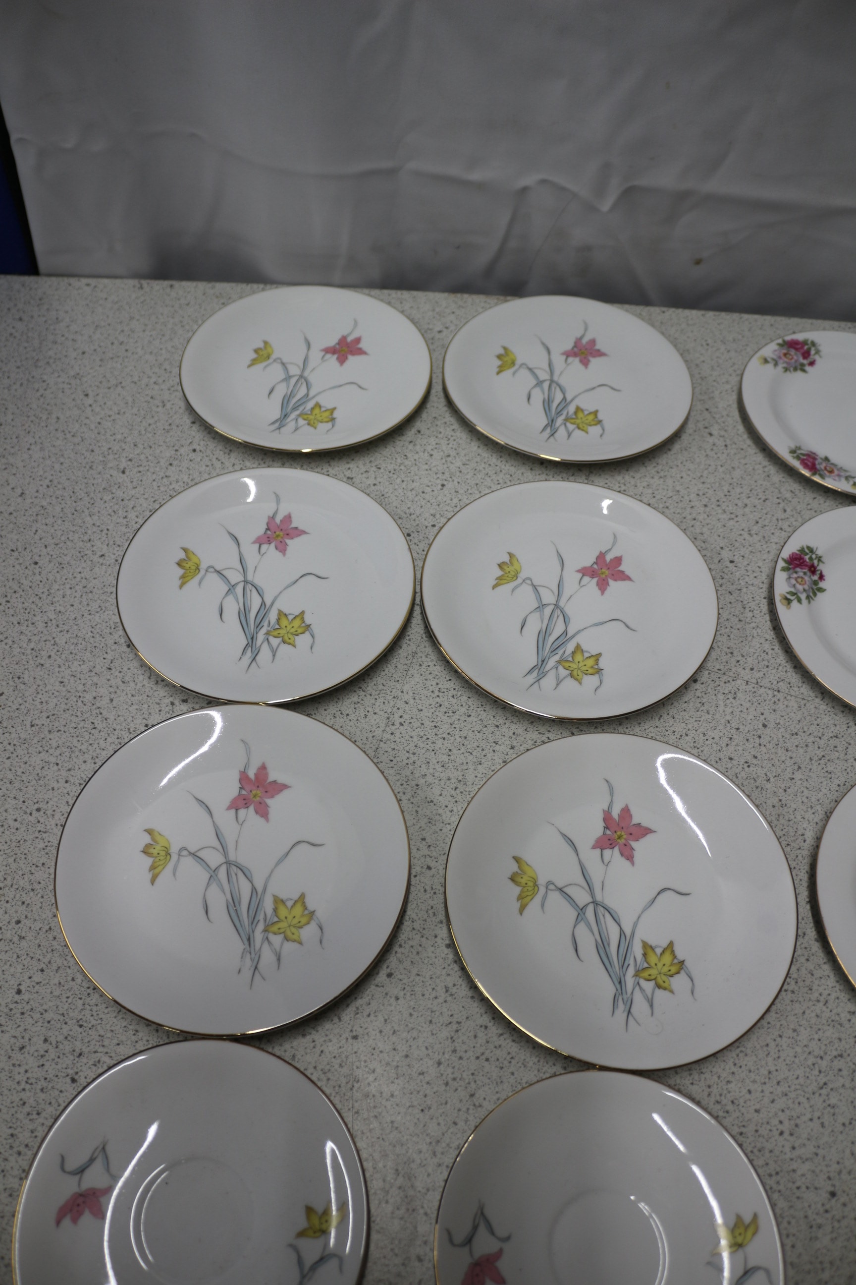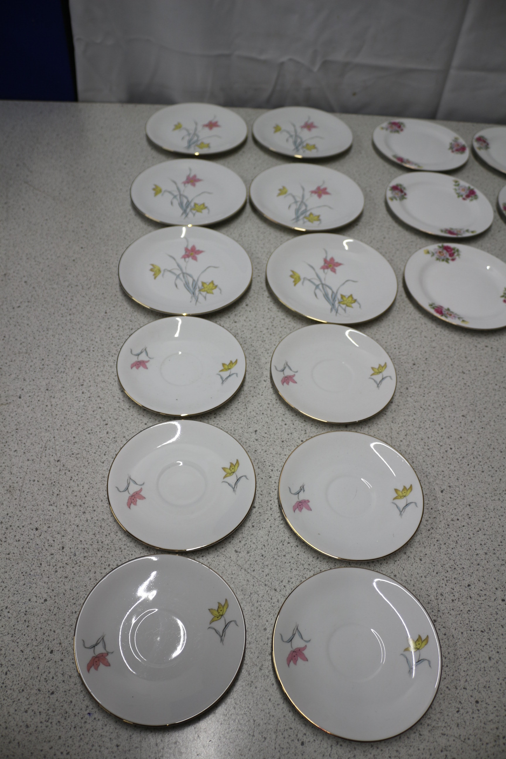 Assorted white ceramic plates and saucers with gold trim, including 14 pieces with a pink and yellow lily design marked “Made in China” and 14 pieces with a multicoloured rose cluster design marked “feltmann Weiden K. Bavaria Made in Germany”.