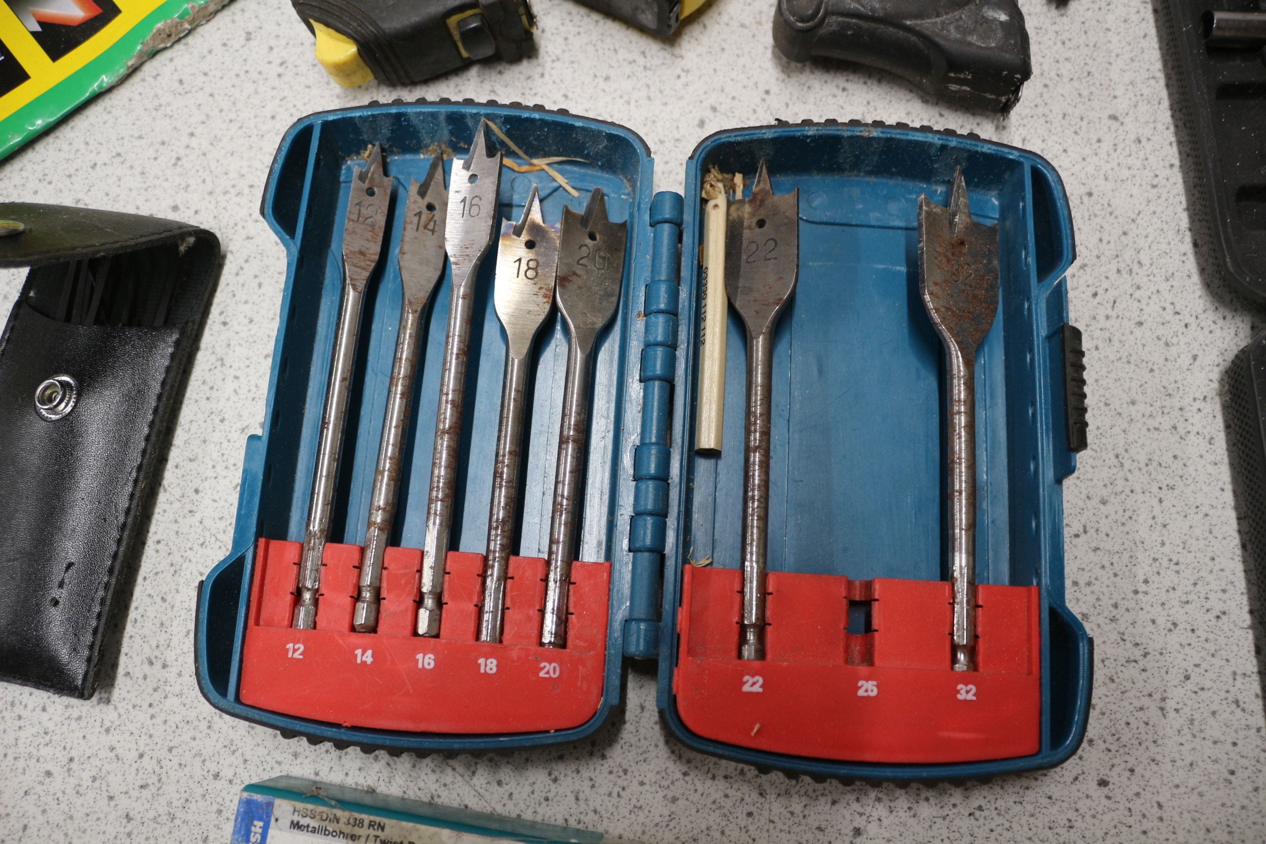 A diverse collection of tools and accessories including Black & Decker power drill and jigsaw, STANLEY handsaw, Makita drill bit set, three tape measures, a toolbox, and traffic cones.