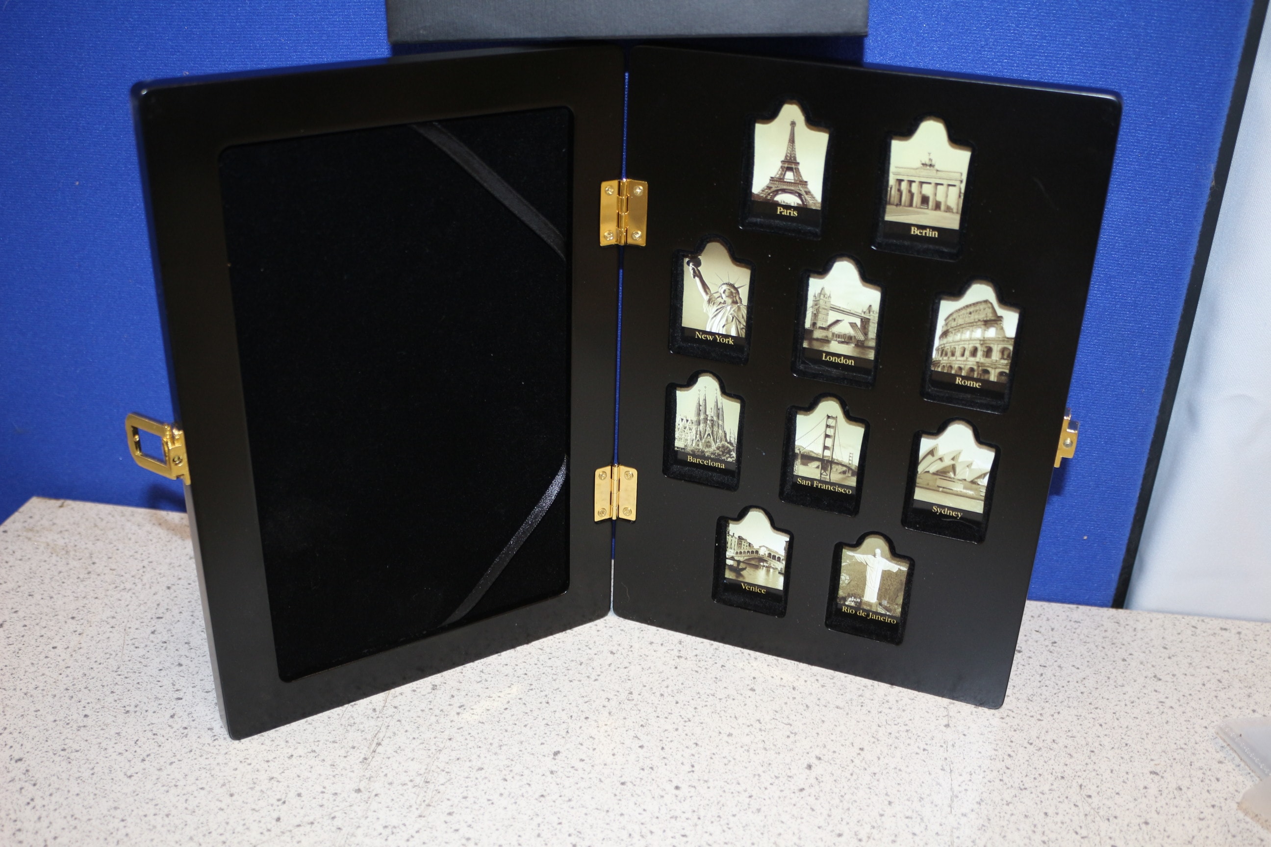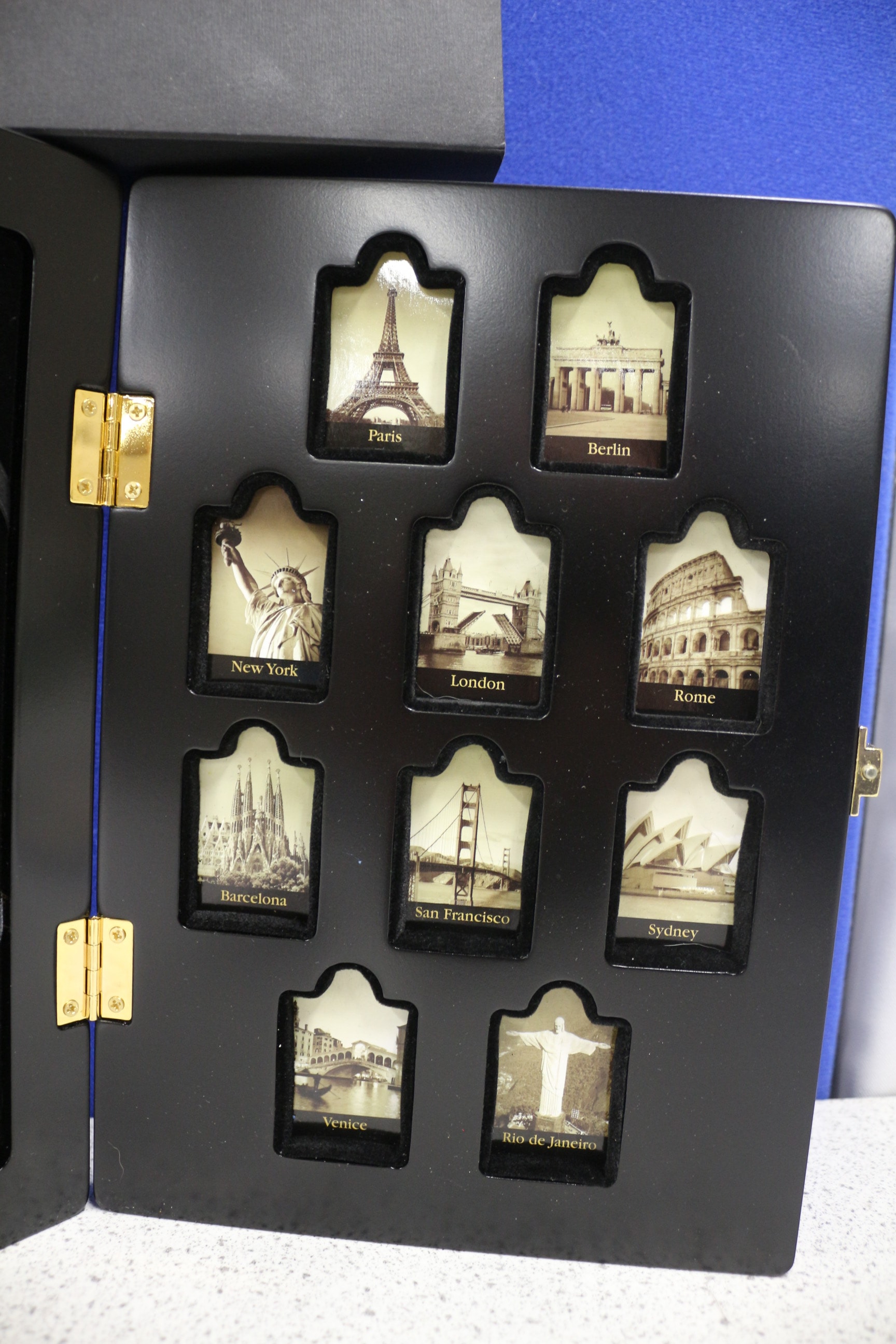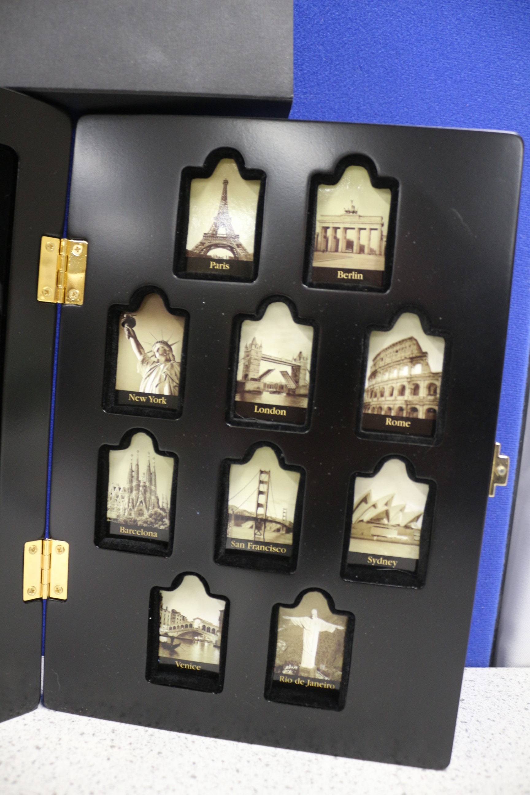 An empty case for ten commemorative coin-bars or medallions, each featuring a famous world landmark and its city name.