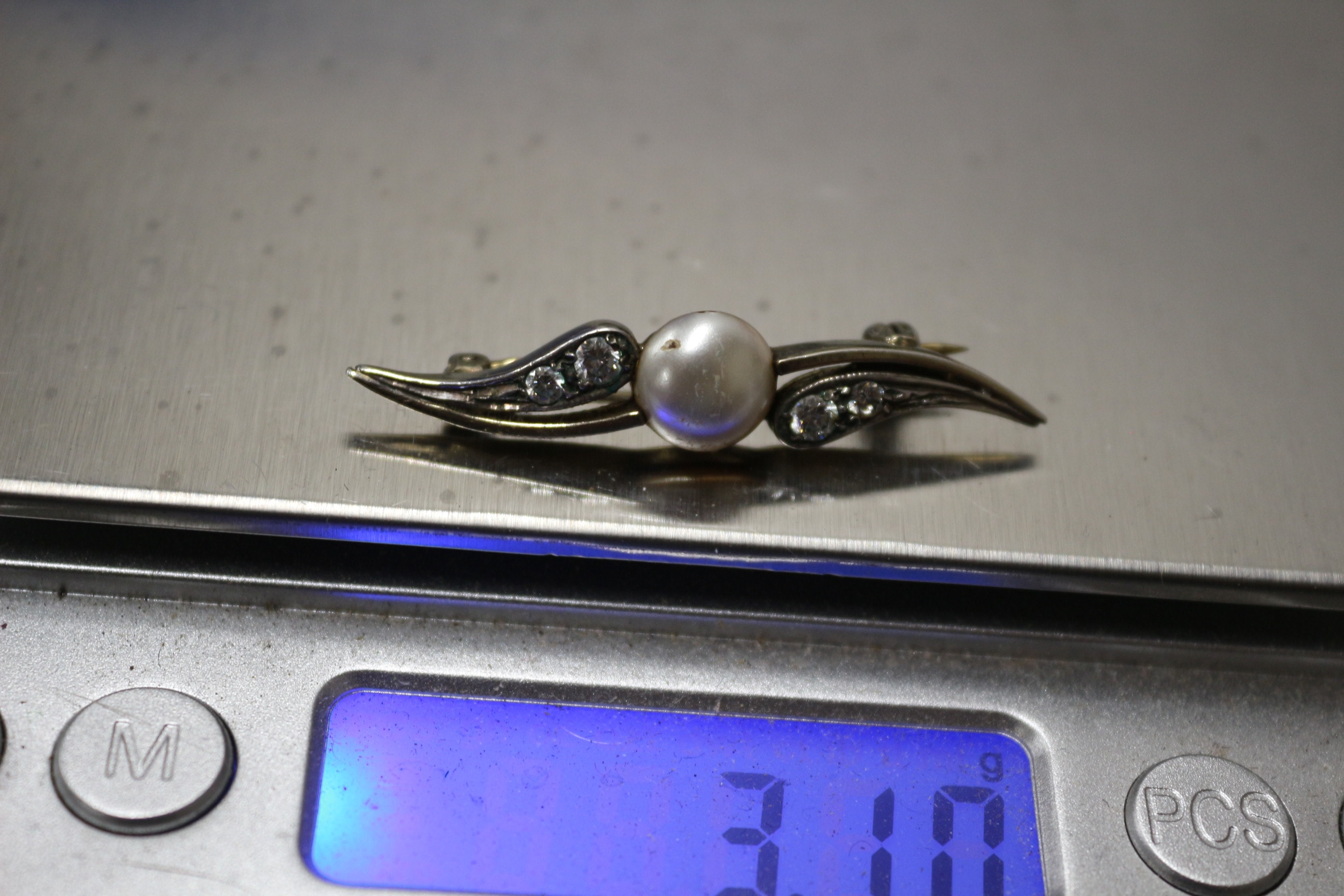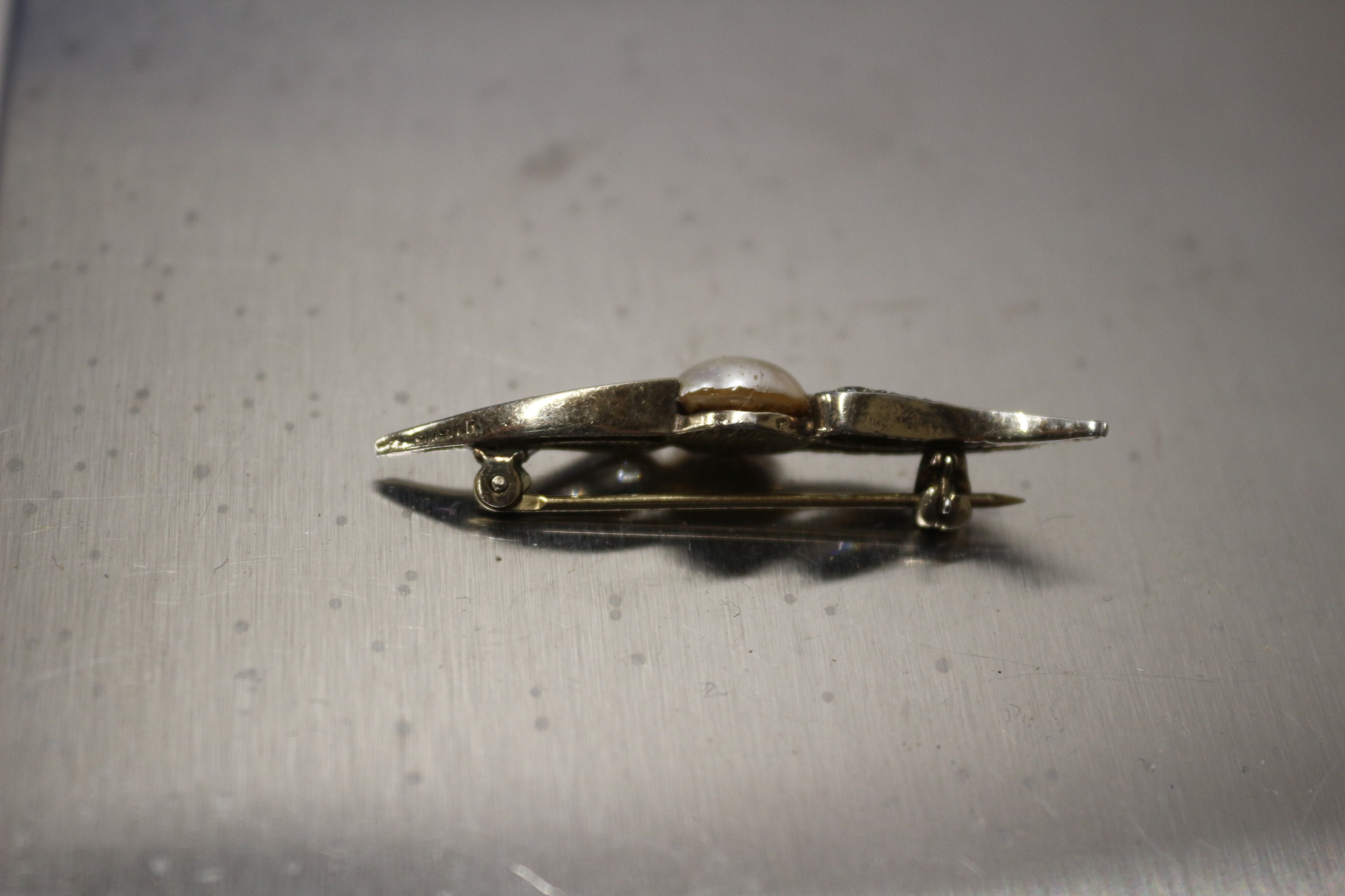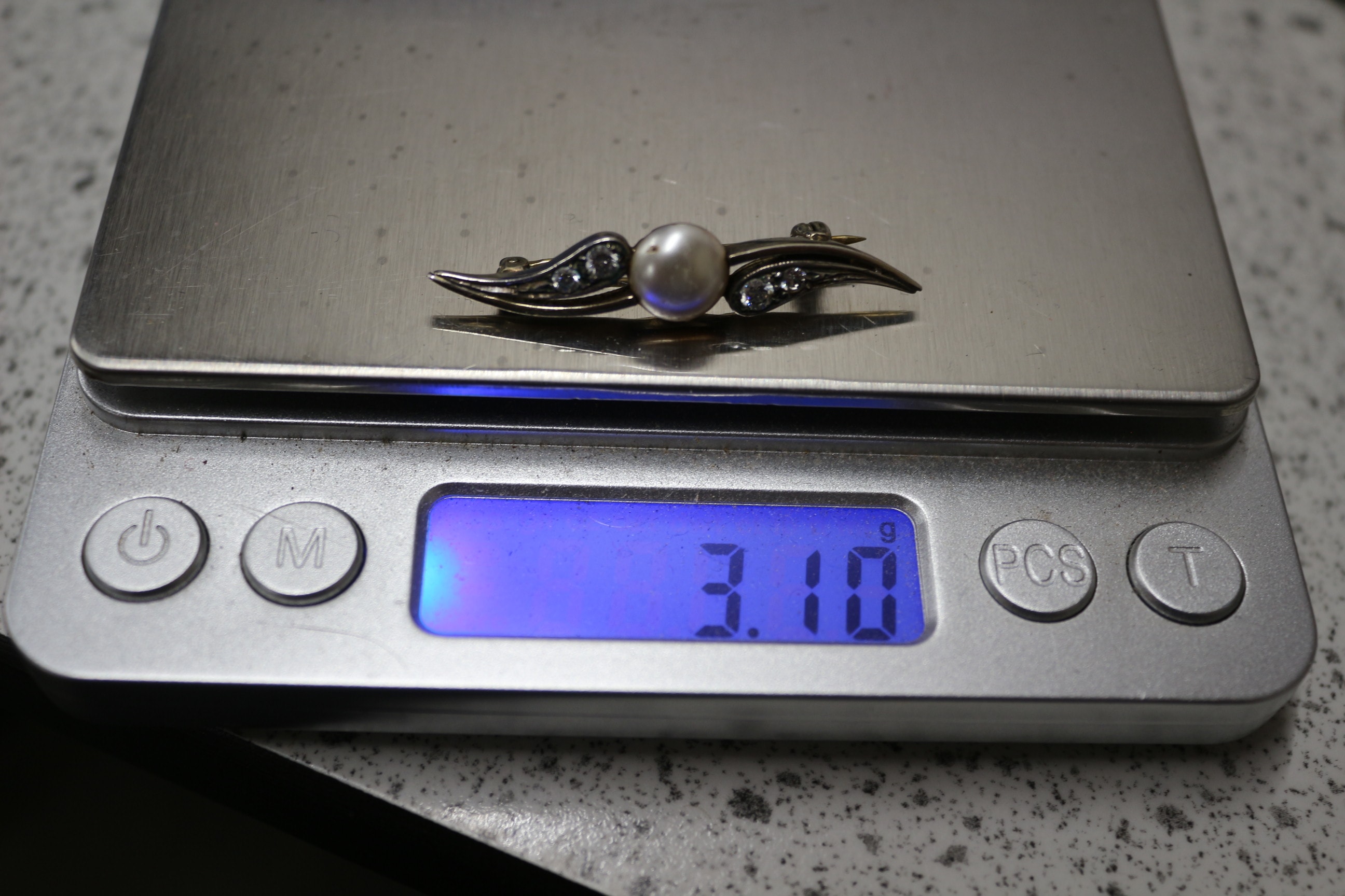 Marked as Silver, brooch featuring a central white pearl and clear accent stones, weighing 3.10 g.