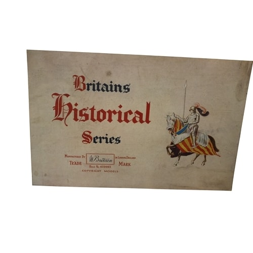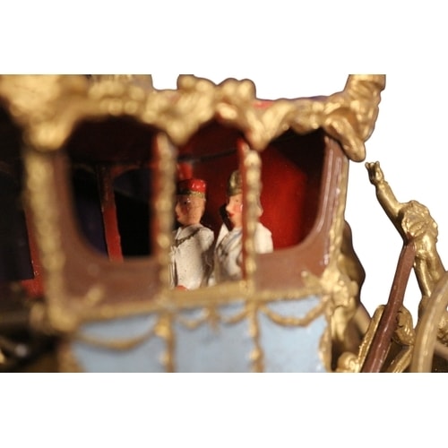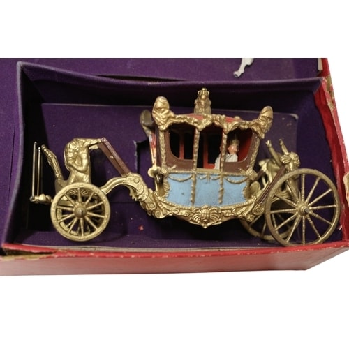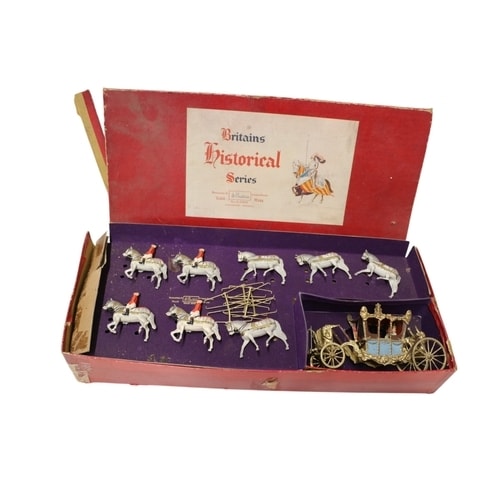 A vintage boxed set of Britains Historical Series toy figures, featuring one ornate gold, blue, and red ceremonial coach with two white-uniformed figures, eight white horses, and harness parts.