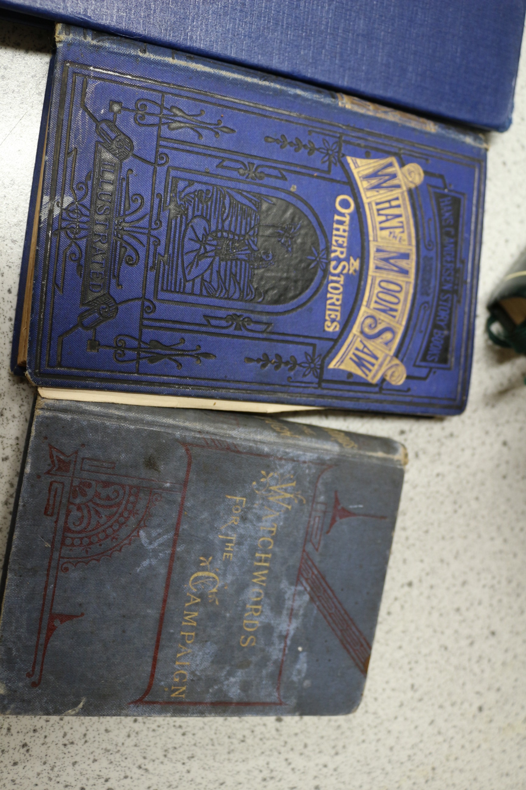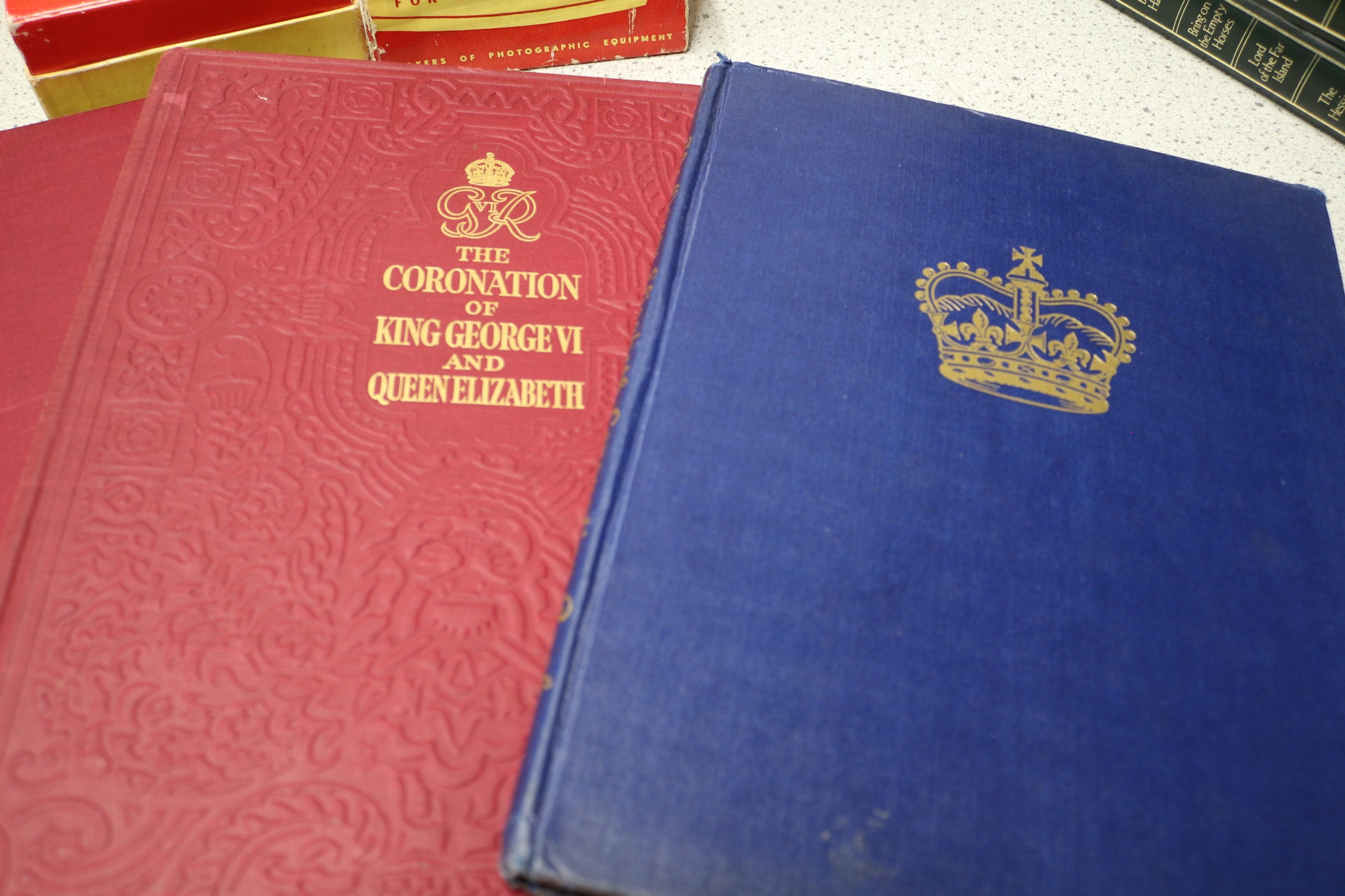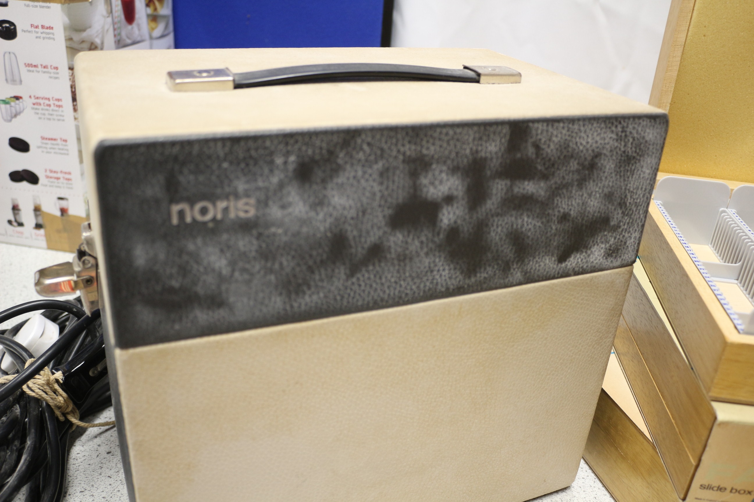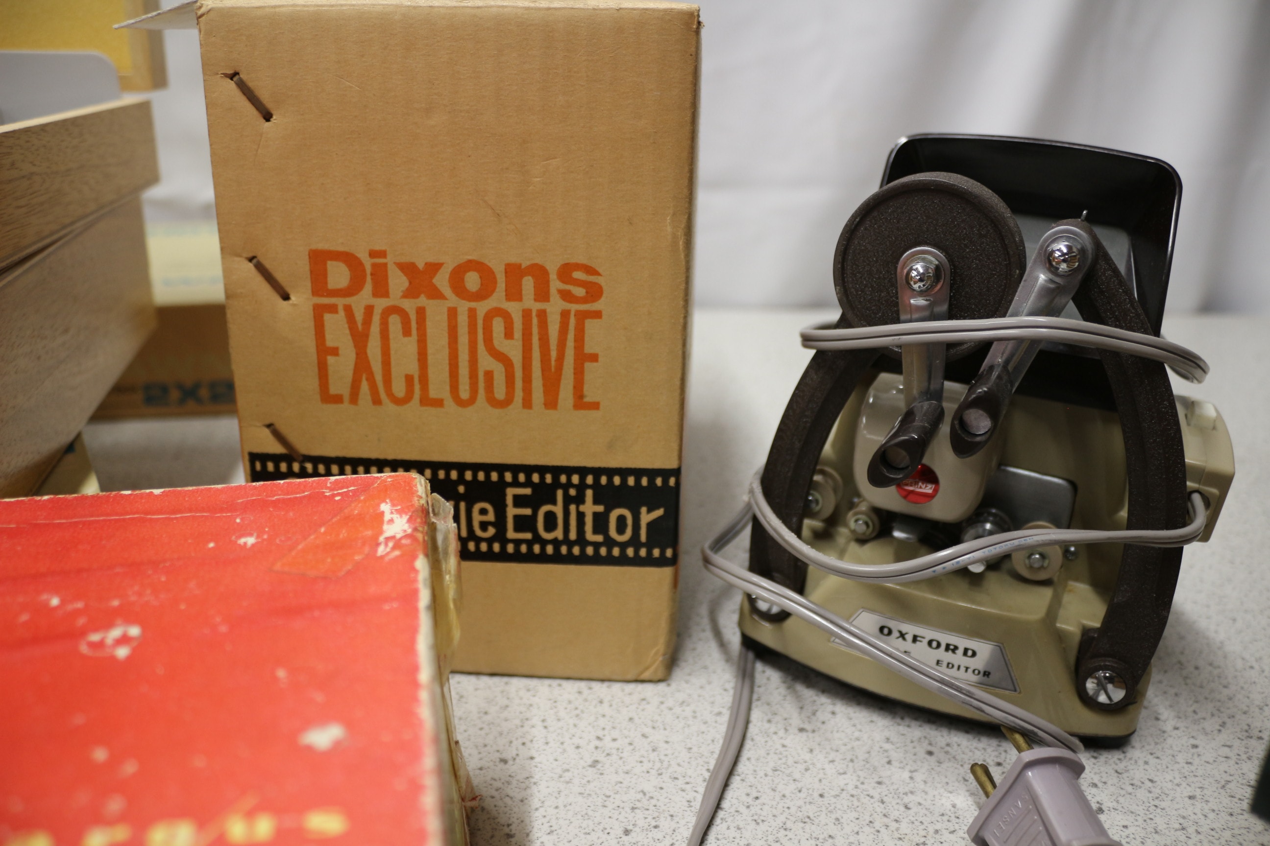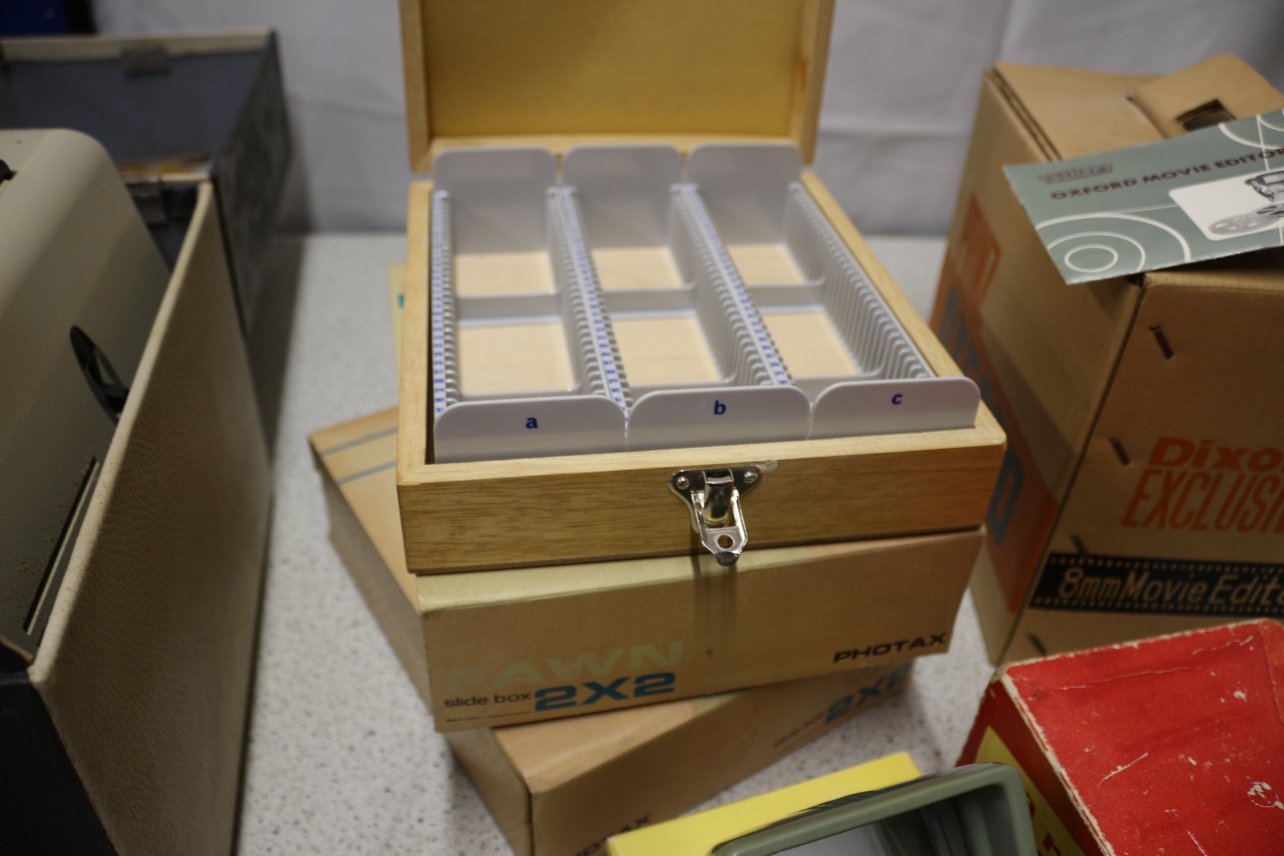 A Noris slide projector, an Oxford 8mm movie editor, an Argus slide viewer, slide storage boxes, and a collection of various hardcover books and comics are included.