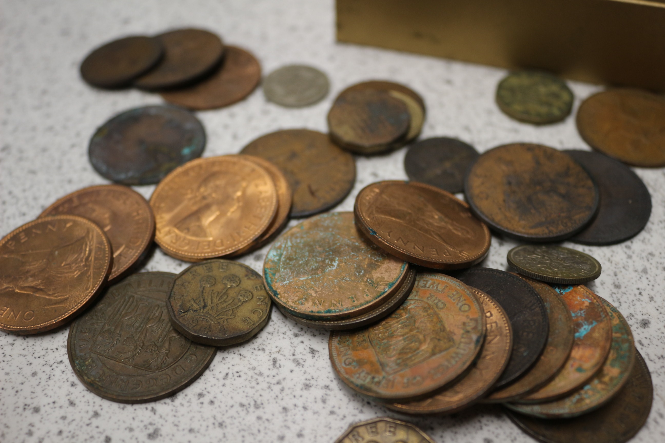 A substantial collection of numerous assorted vintage coins, primarily in bronze and copper tones with some silver-coloured pieces, featuring visible inscriptions such as “ONE PENNY 1967”, “ELIZABETH II”, “DEI GRATIA REGINA F:D:”, “1940”, “GEORGE VI KING EMPEROR”, “TWO SHILLINGS 1947”, “SOUTH AFRICA”, and “1/2 PENNY”.