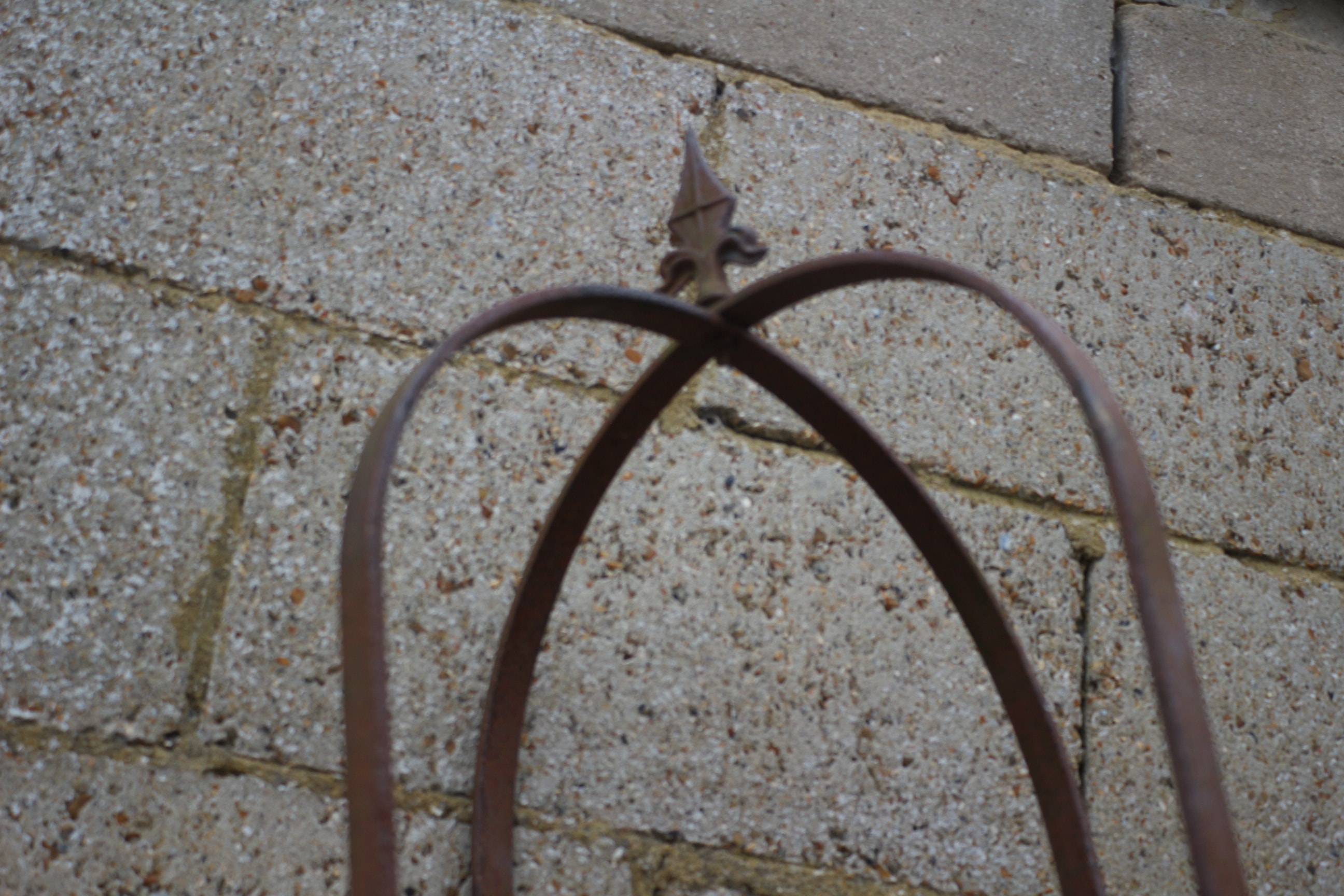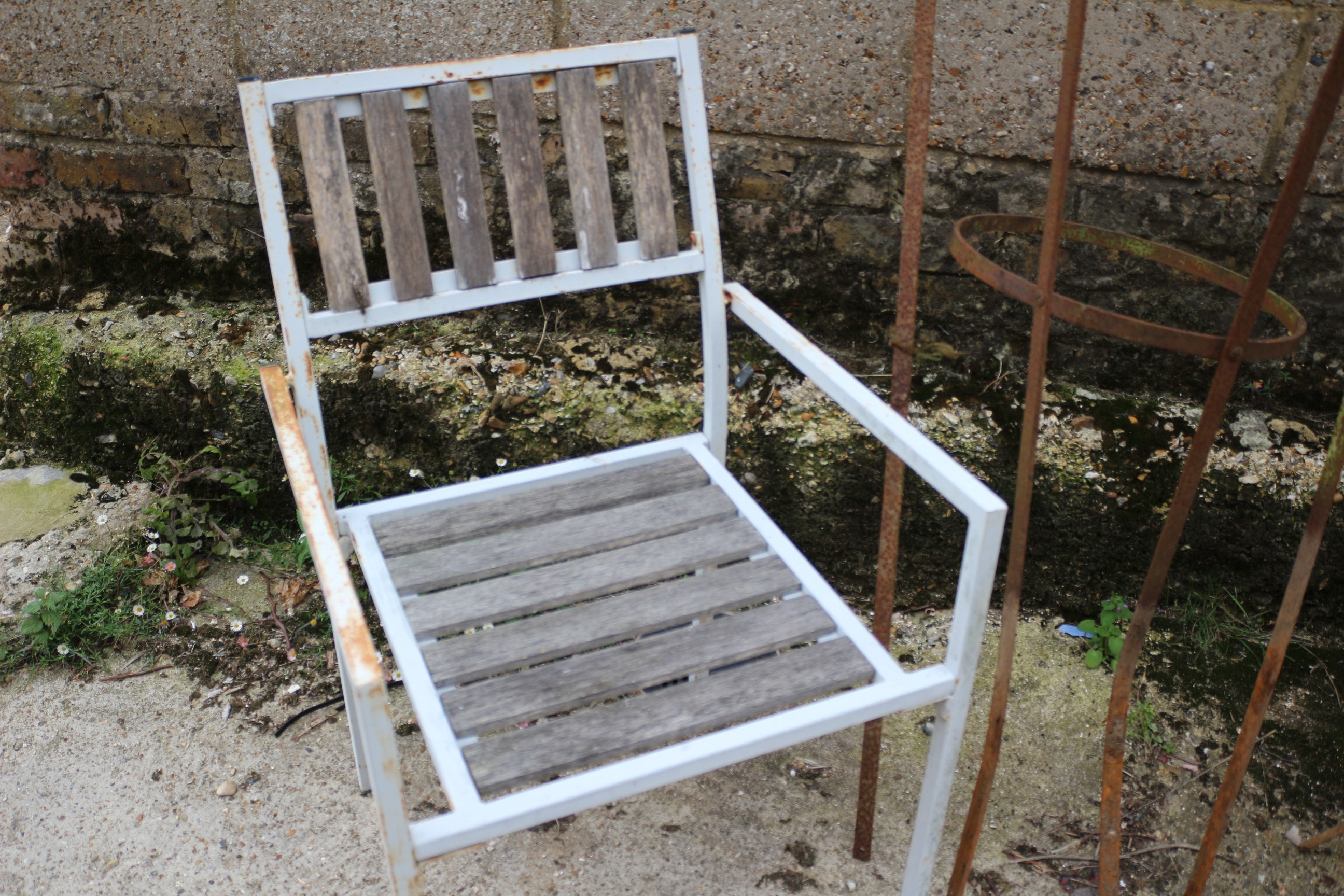 Two white metal-framed outdoor chairs with weathered grey/brown wooden slats and two tall cast iron garden plant obelisks. All AF.