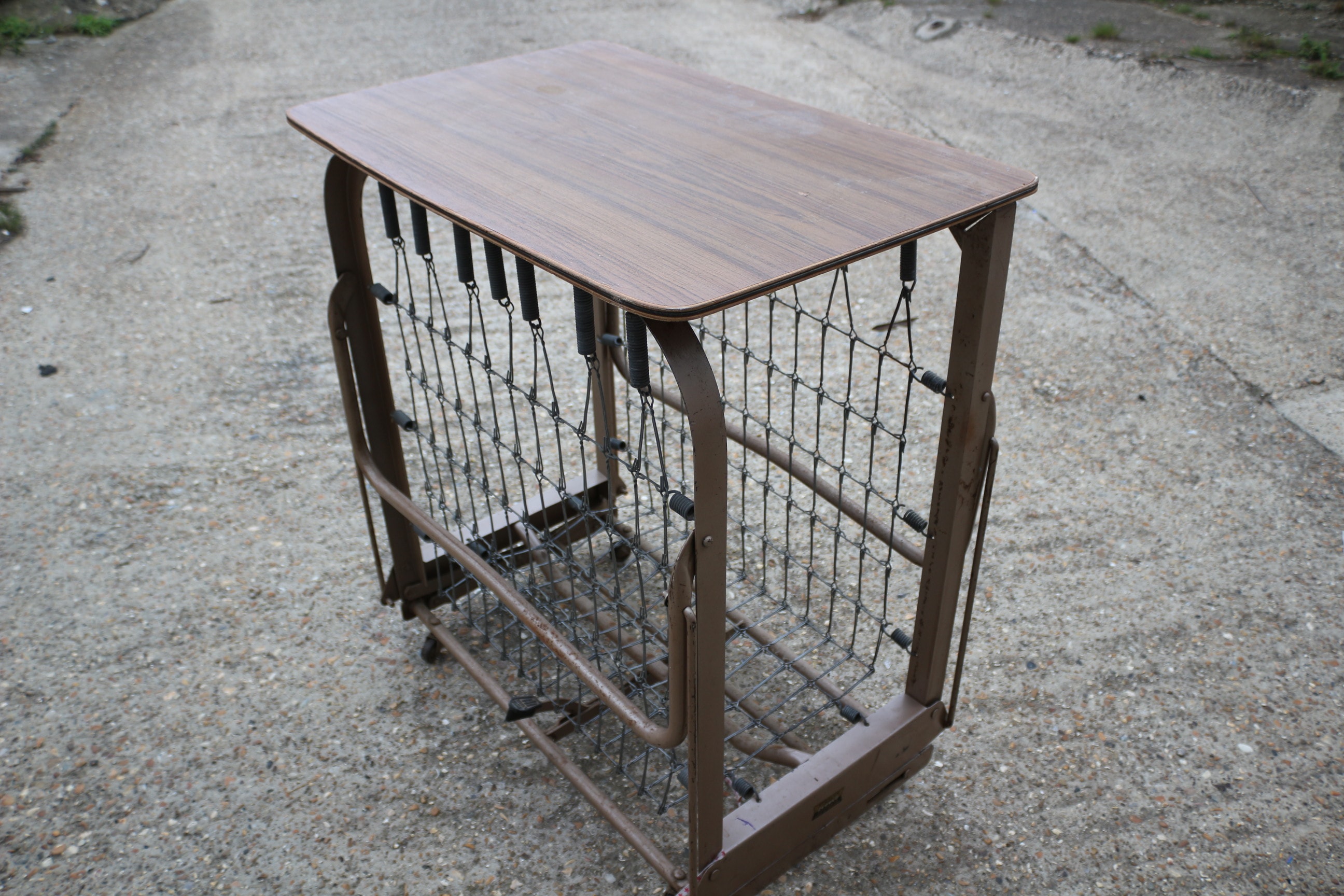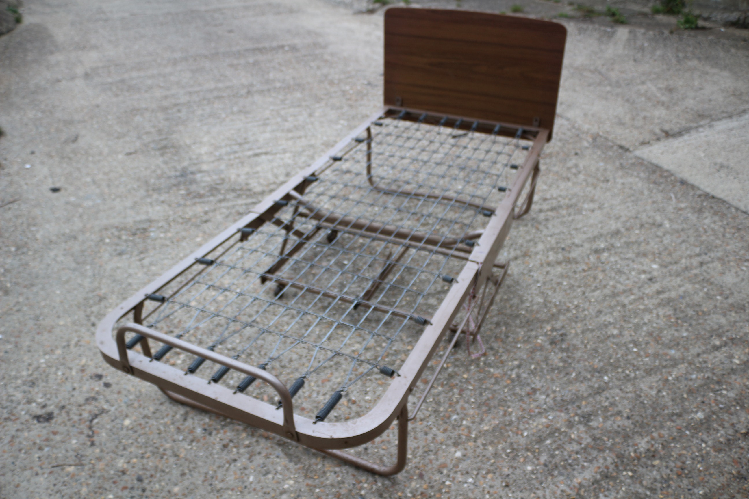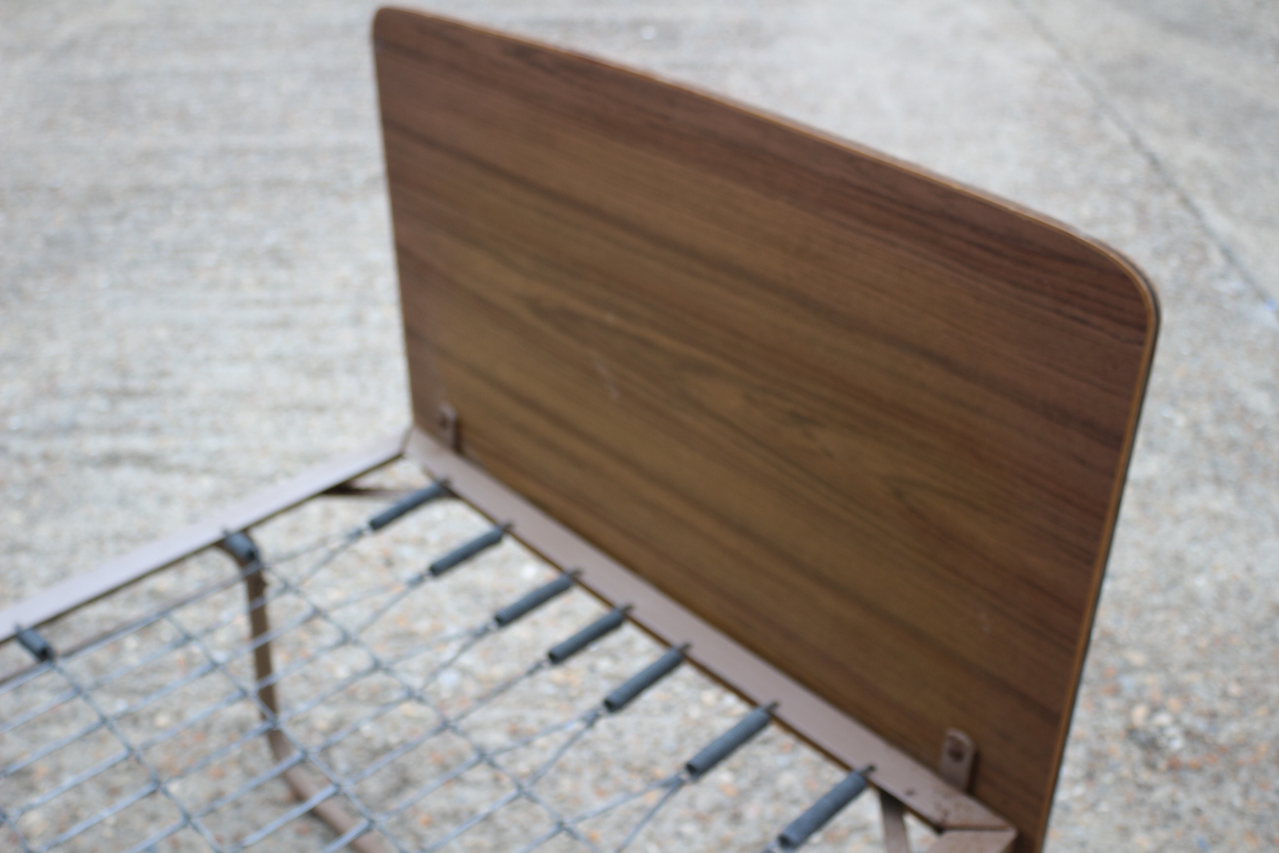 A brown/tan metal folding bed frame with a wood-look headboard, labeled ‘STEELUX LONDON ZEDBED PRODUCTS MADE IN ENGLAND’.
