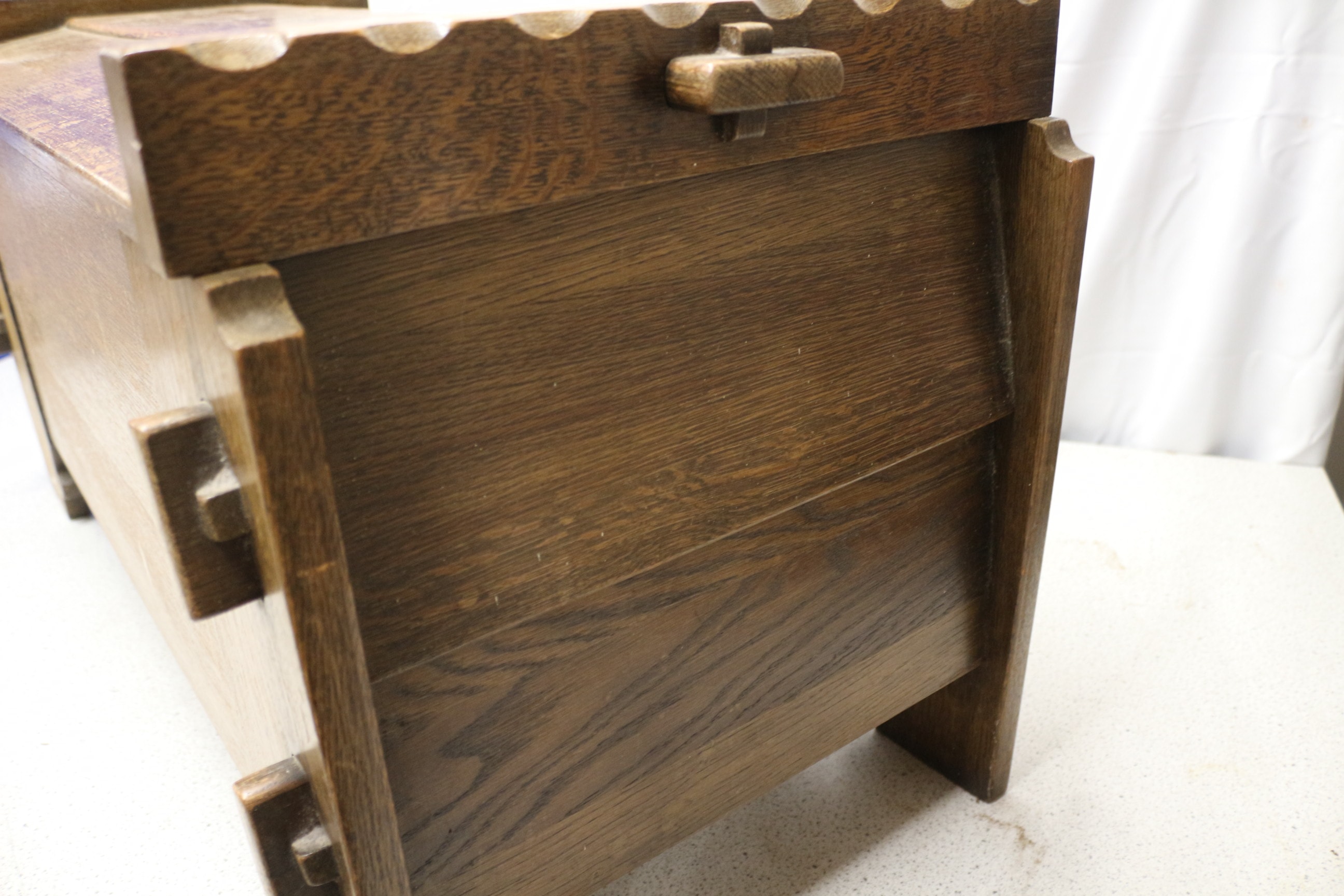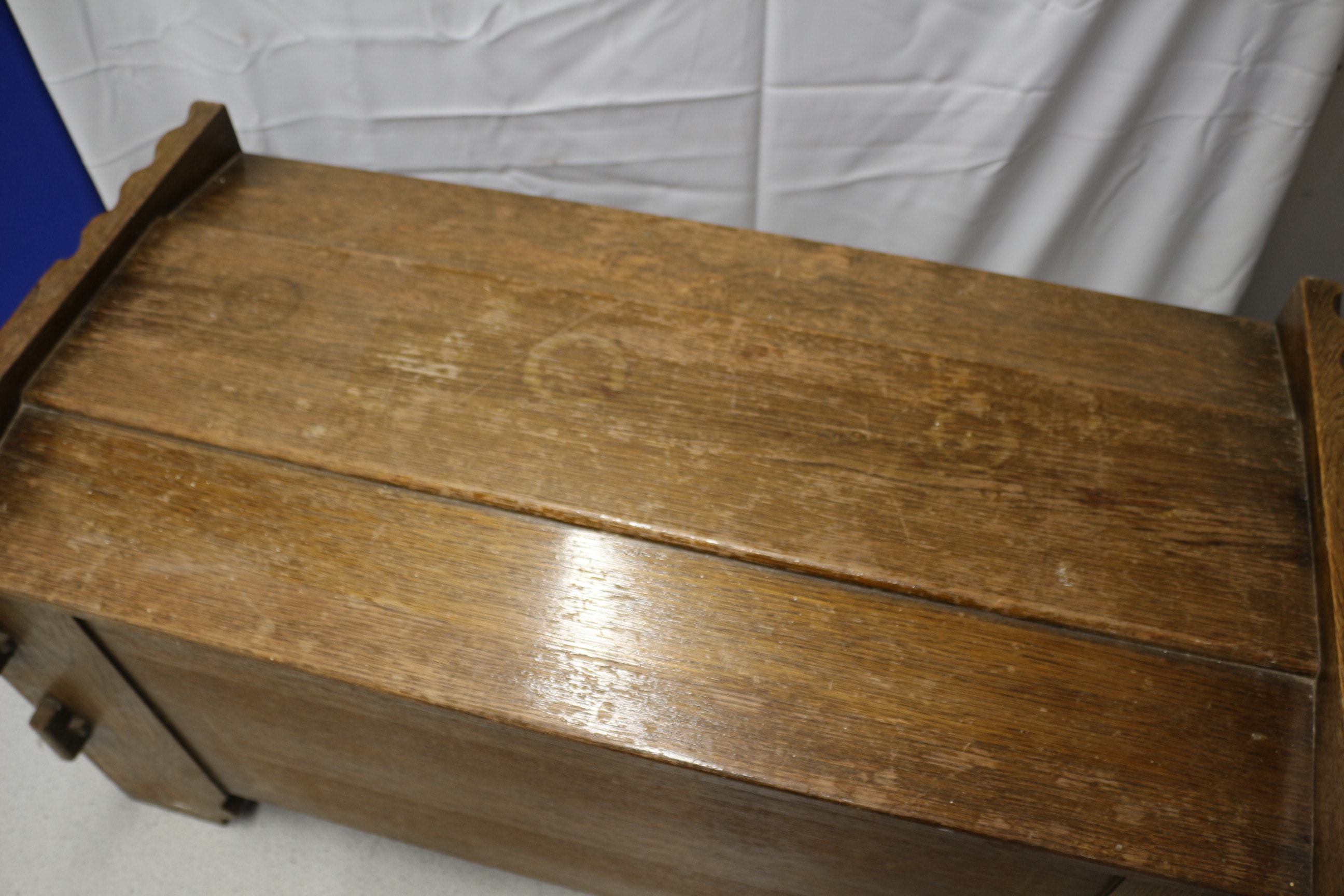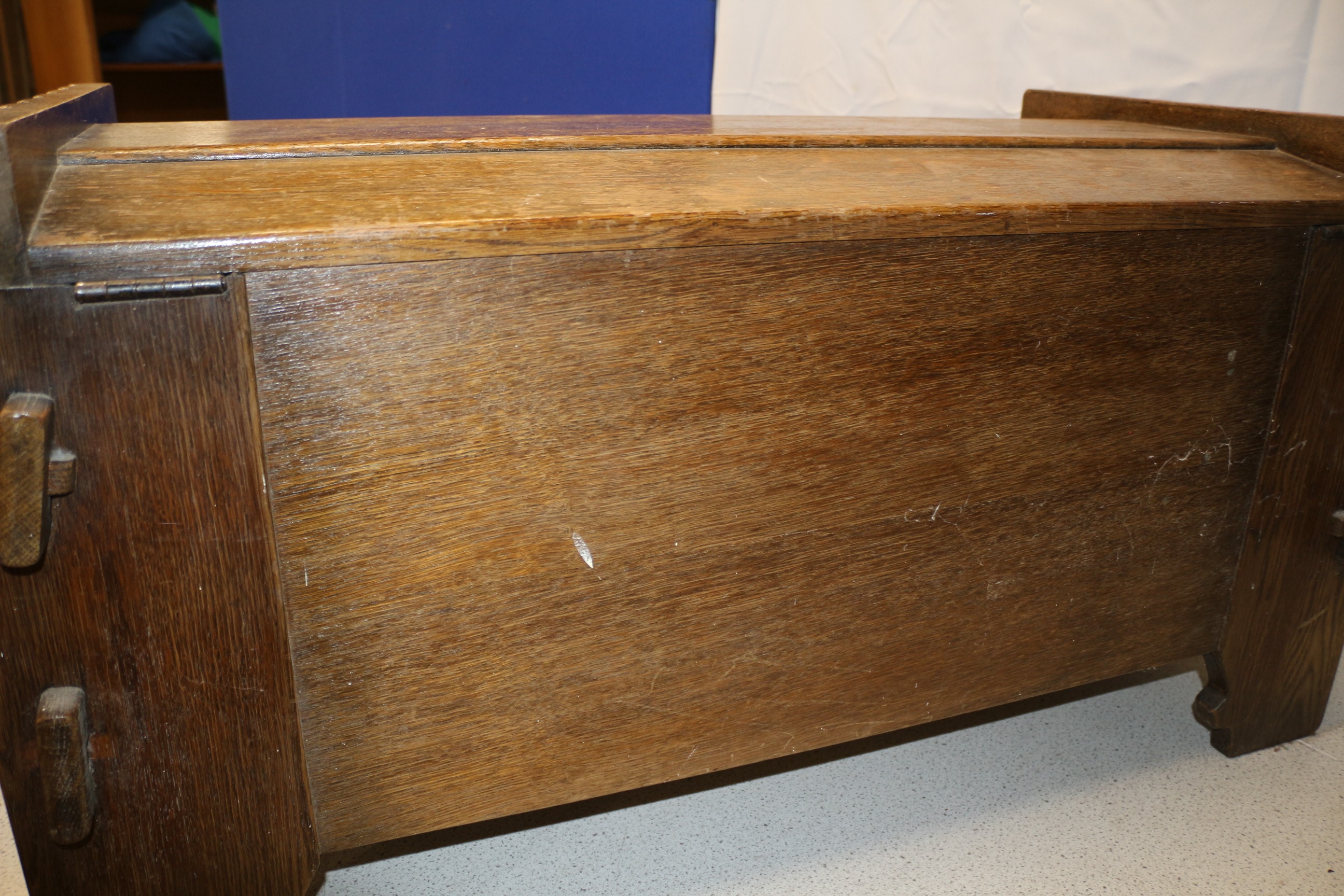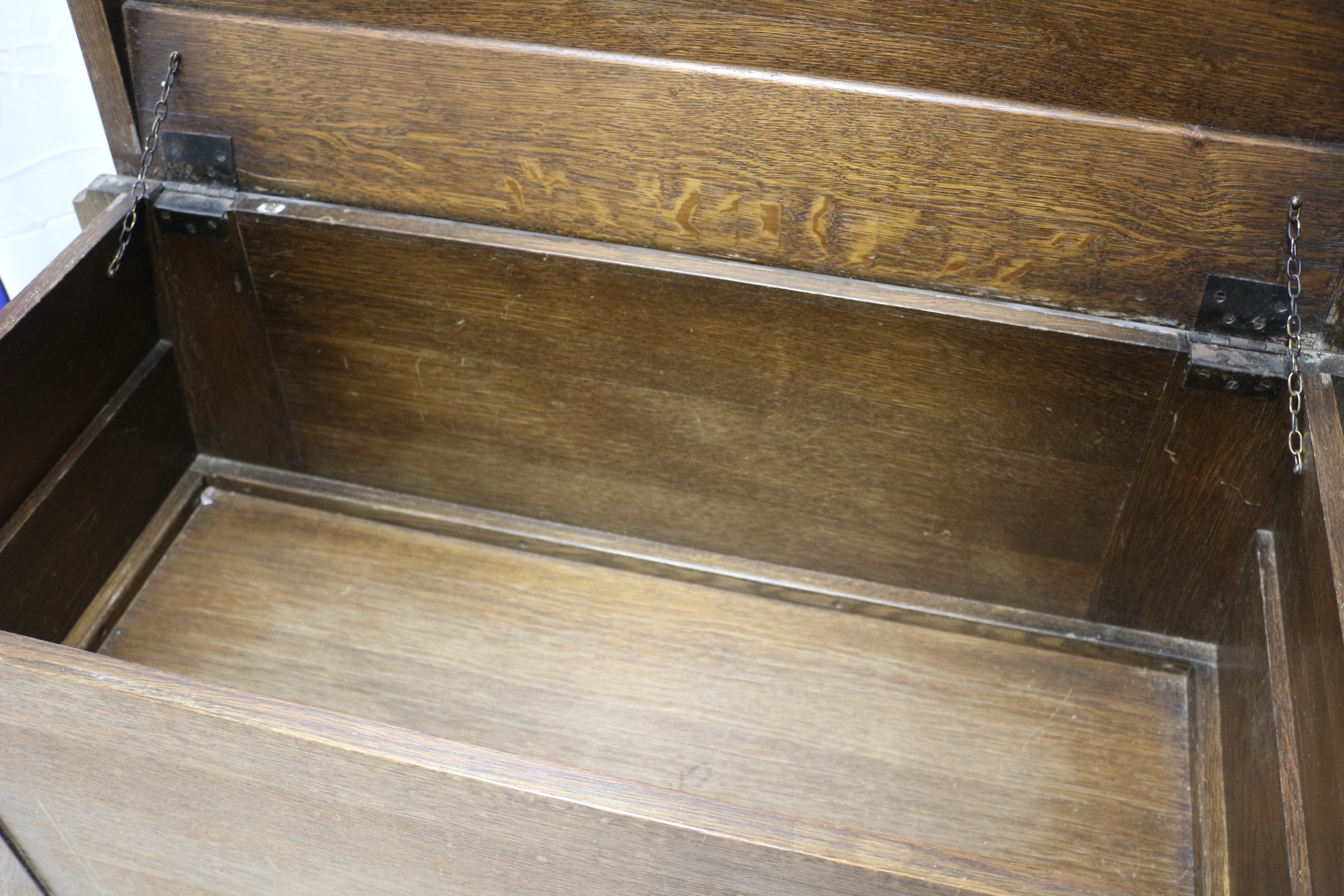A medium brown wooden Arts and Crafts style chest with an opening lid. 98.5x50cm, 52cm Tall
