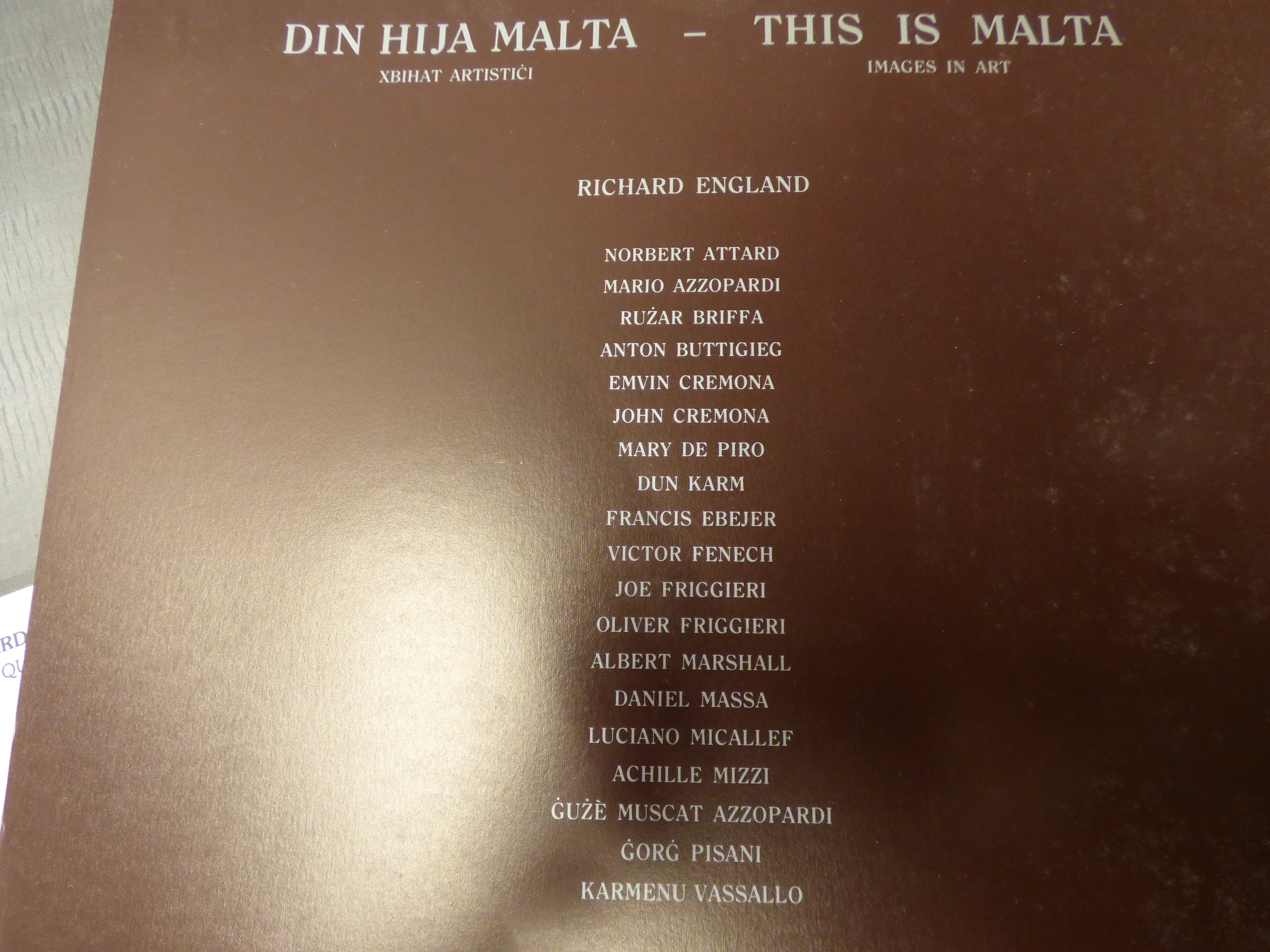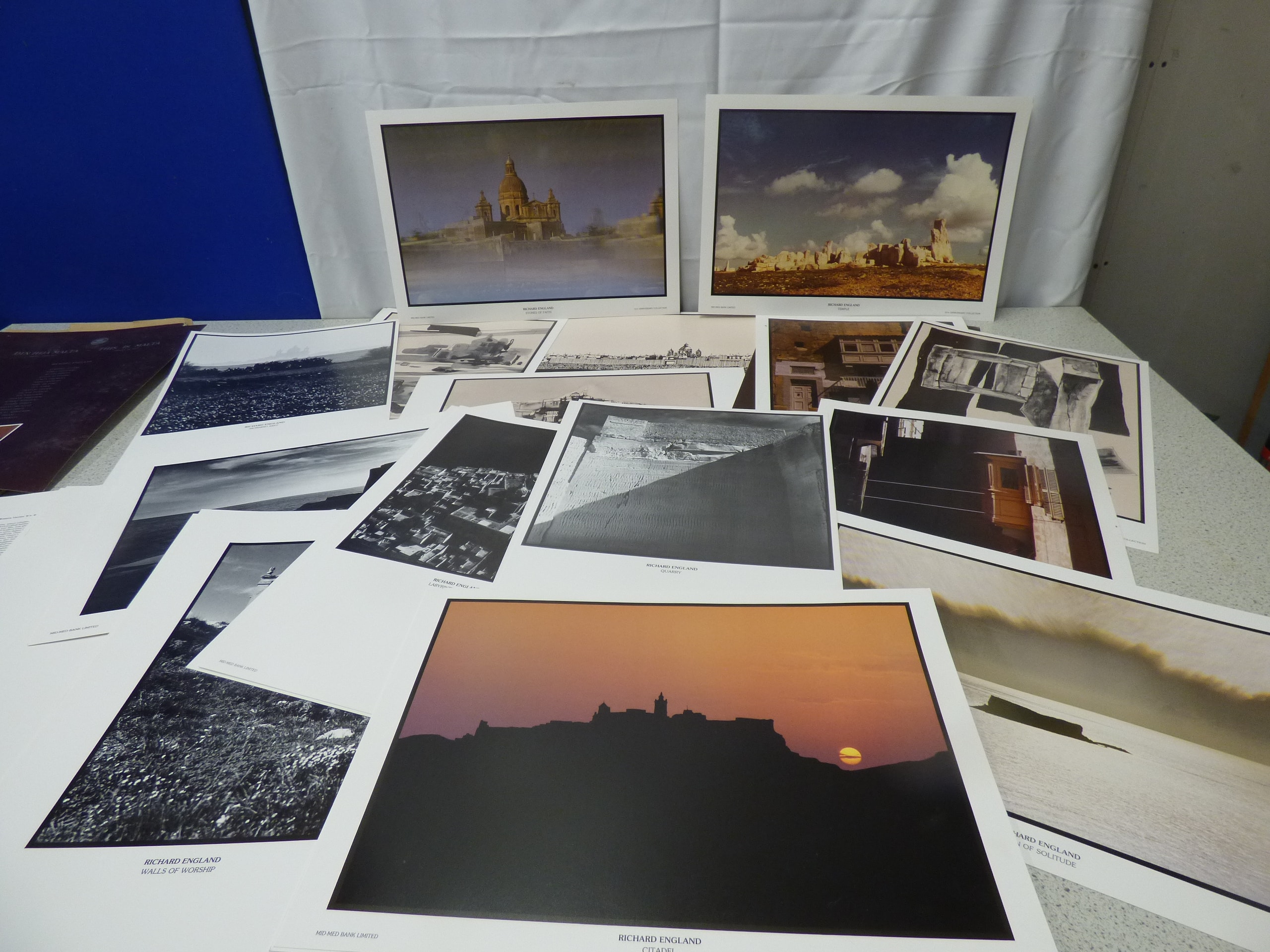A collection of art prints from the ‘This Is Malta – Images in Art’ 10th Anniversary Collection for Med. Med. Bank Limited, featuring various artists including Luciano Micallef and Richard England.