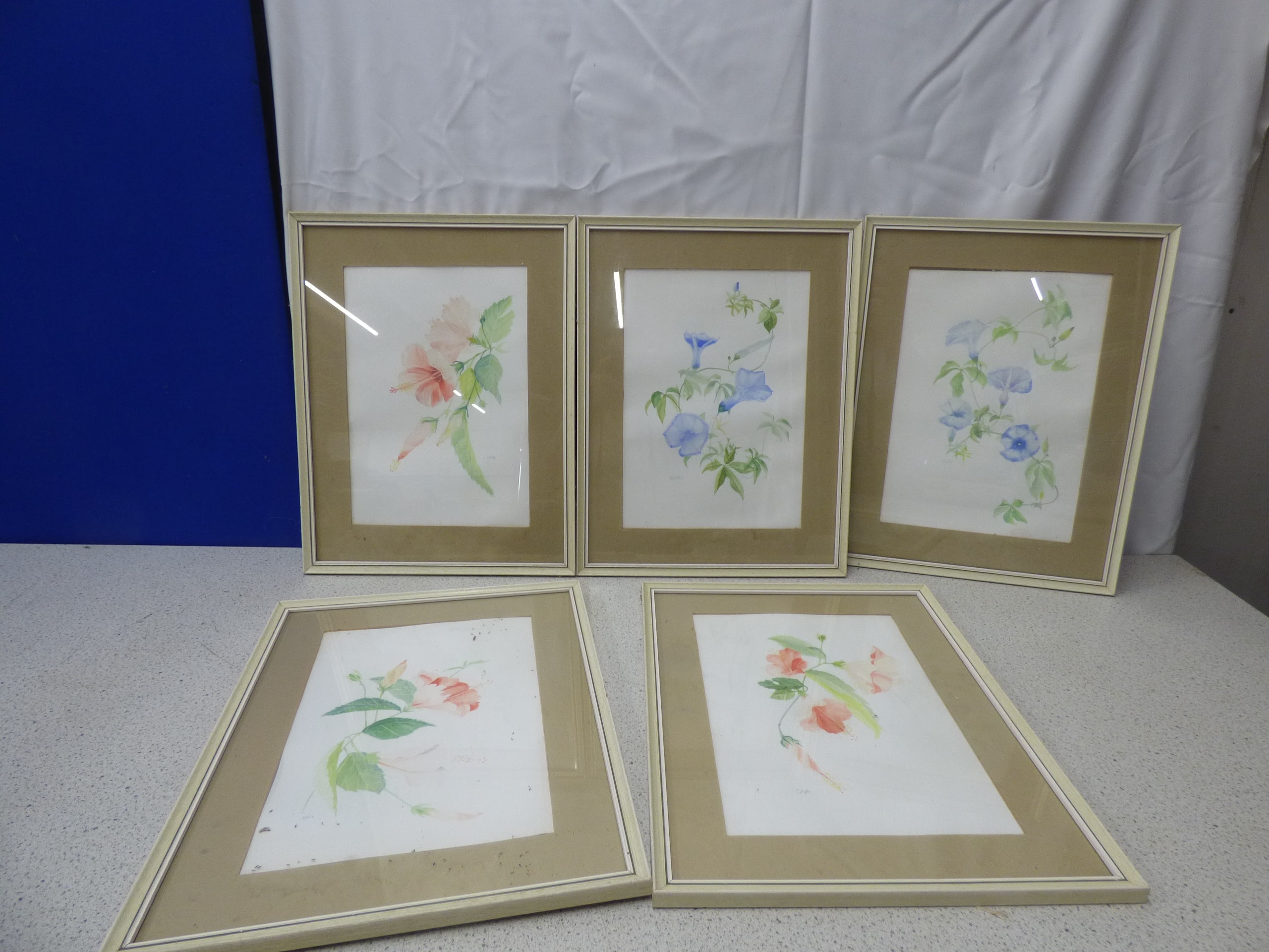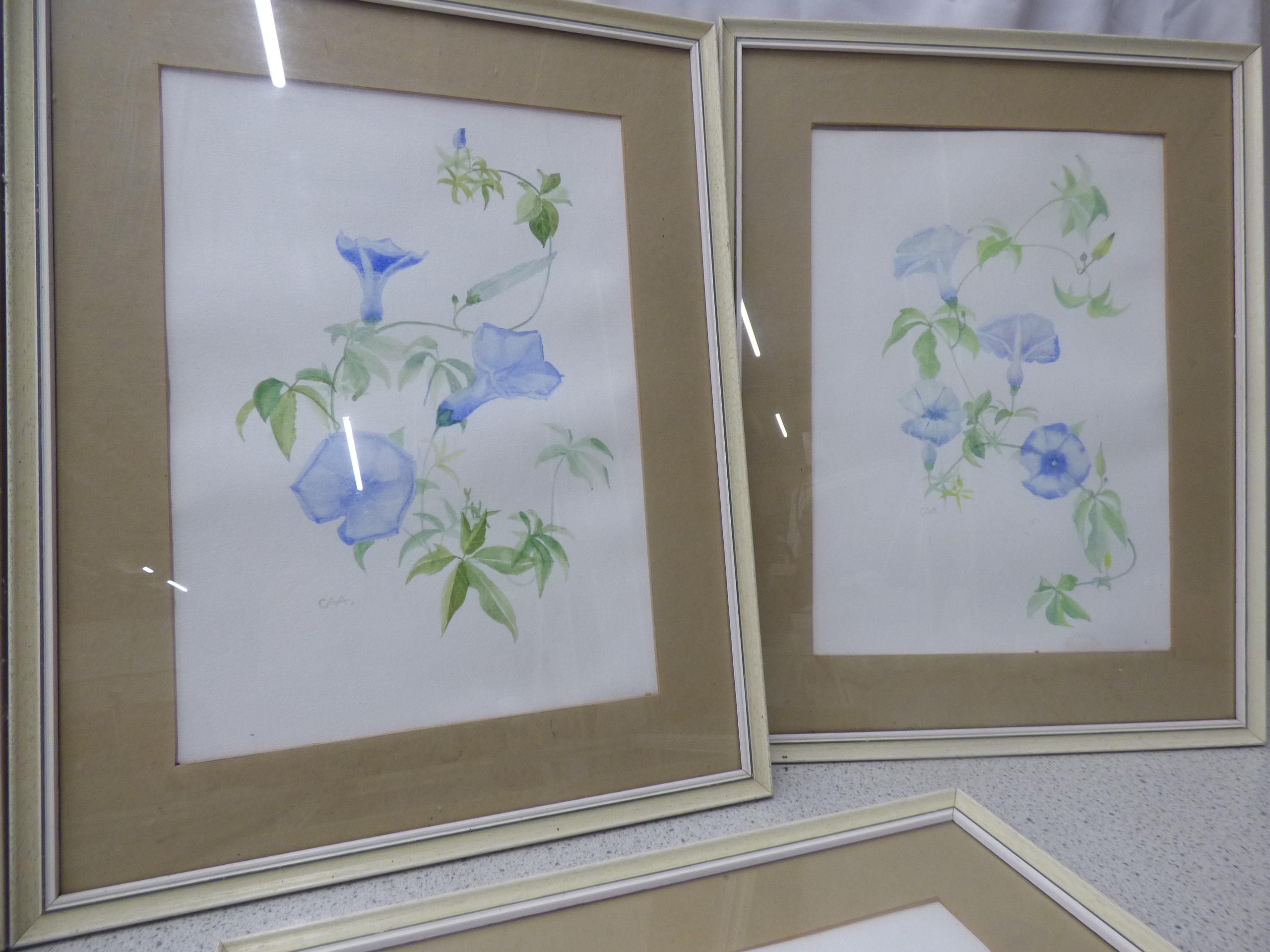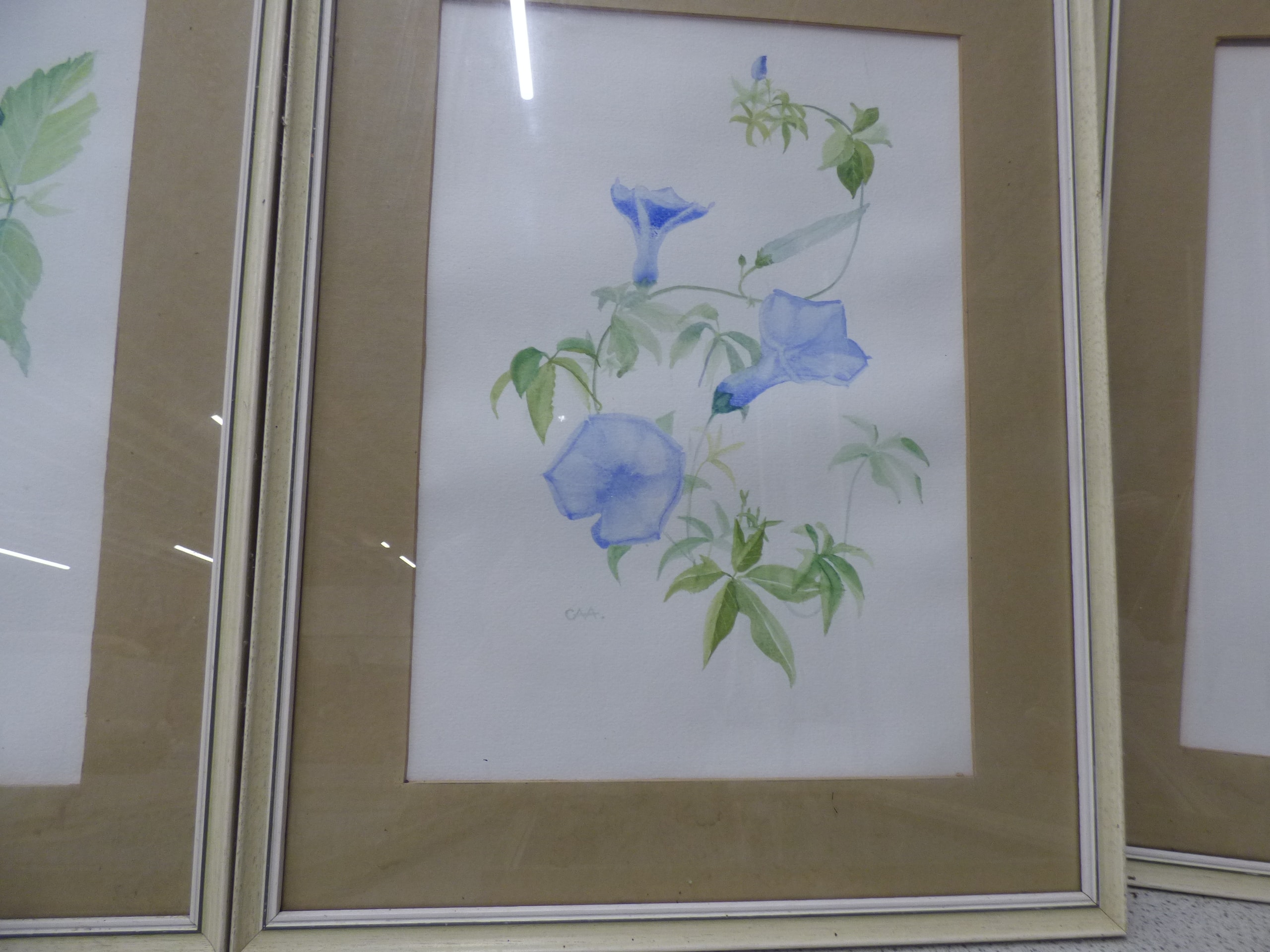 Five framed floral watercolor paintings featuring various flowers in shades of pink, red, and blue with green leaves; two are signed ‘CAA.’ Carole Andrews. 47x37cm AF