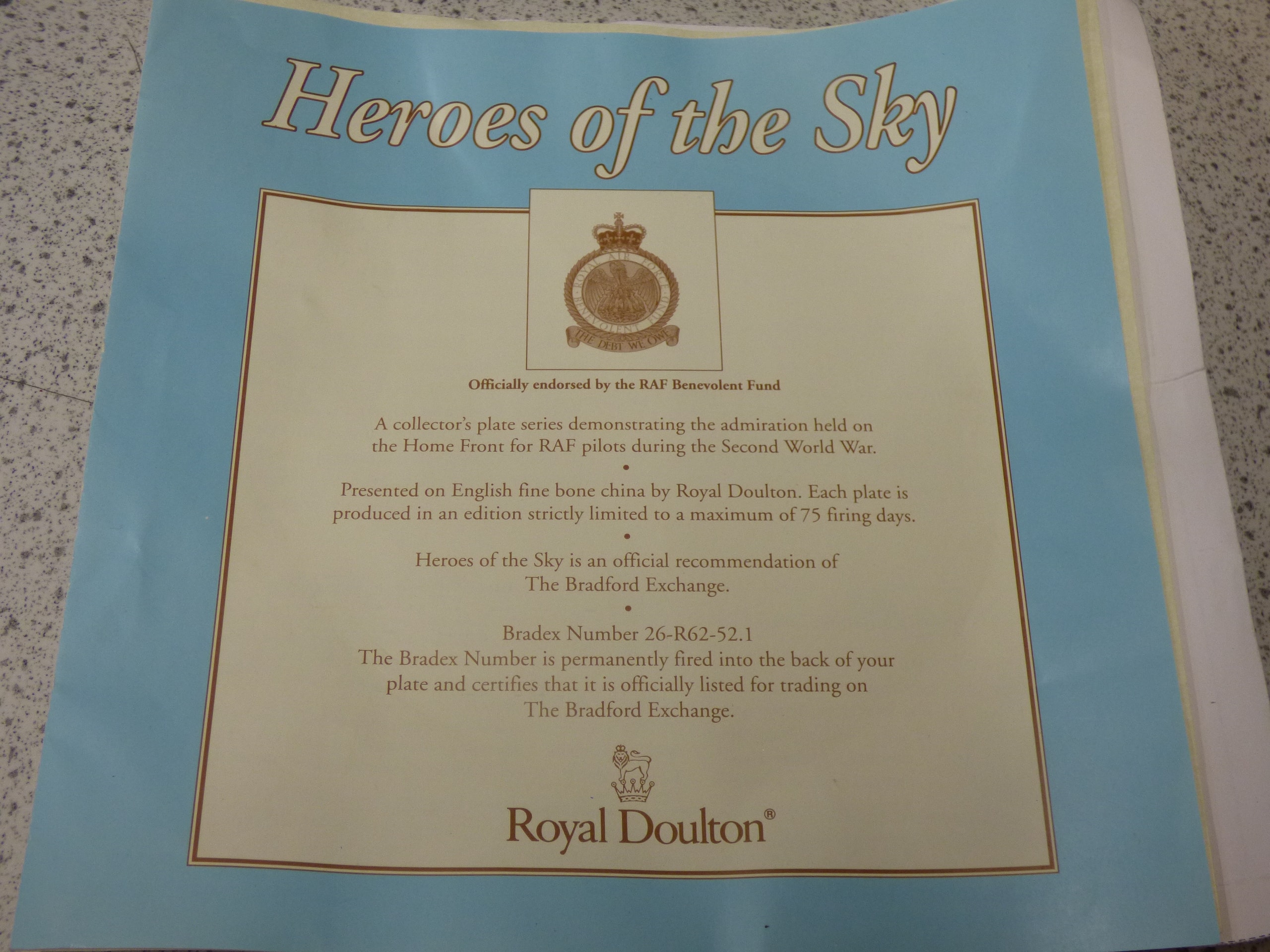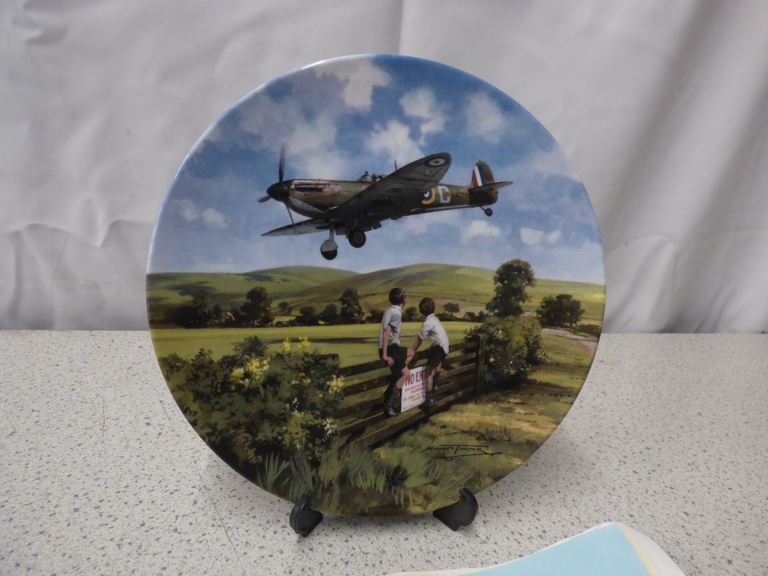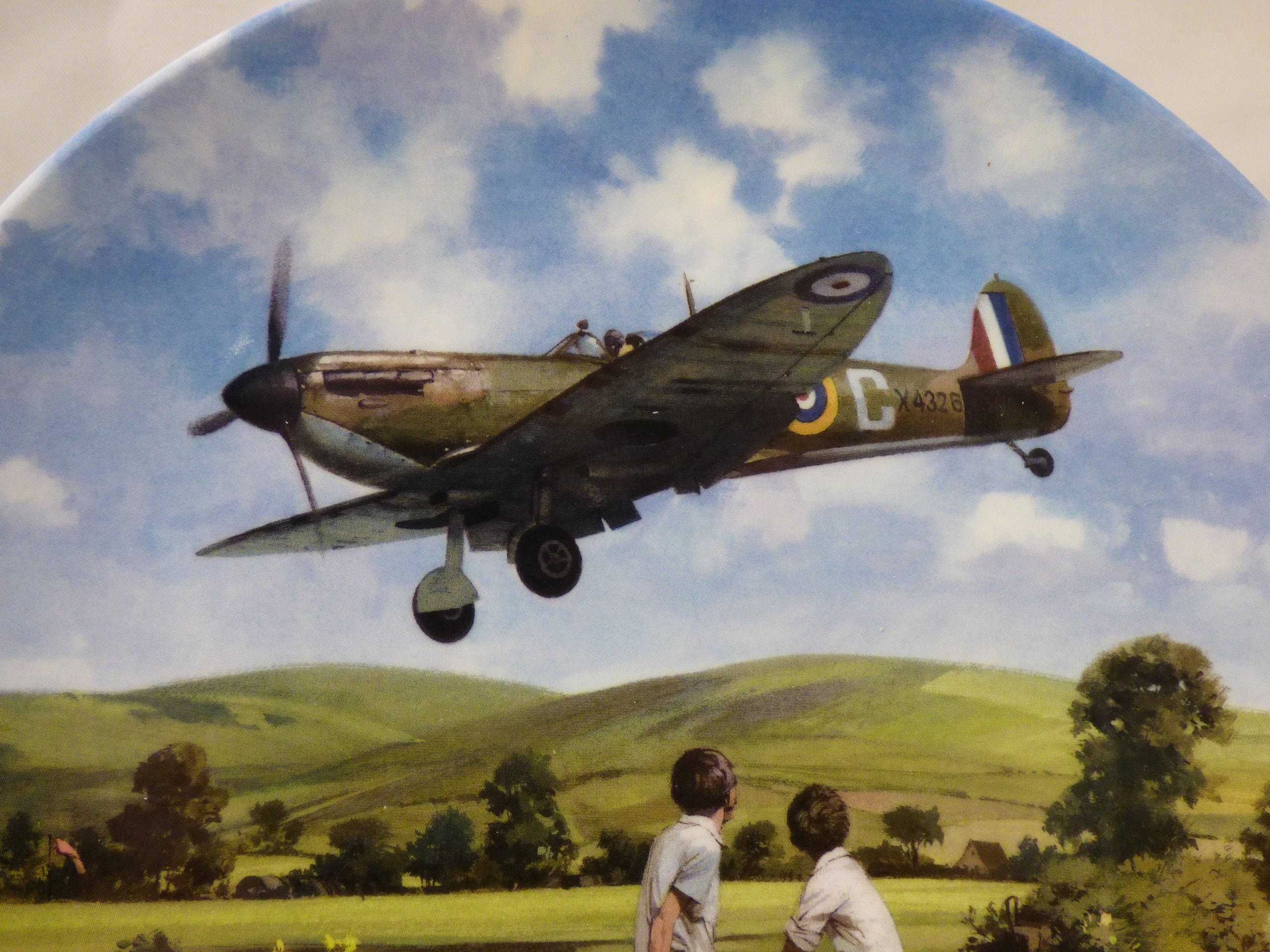 A multi-colour Royal Doulton collector’s plate, ‘Spitfire Coming Home’ from the ‘Heroes of the Sky’ series, depicting a green and brown Spitfire flying over a landscape with two boys, numbered 4160 G, Bradex No. 26-R62-52.1, dated MCMXCIII, reproducing artwork by Michael Turner, and includes a matching certificate.