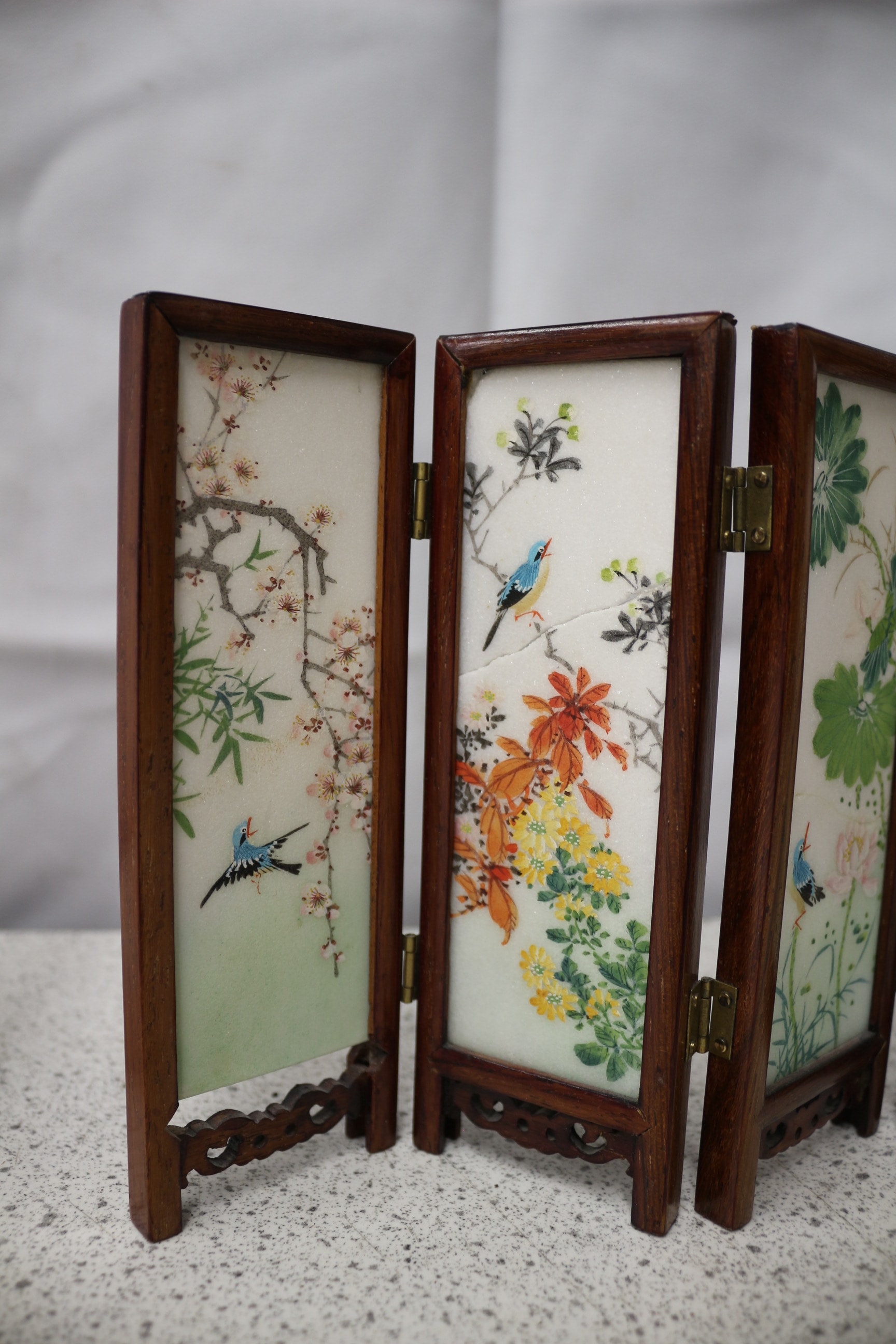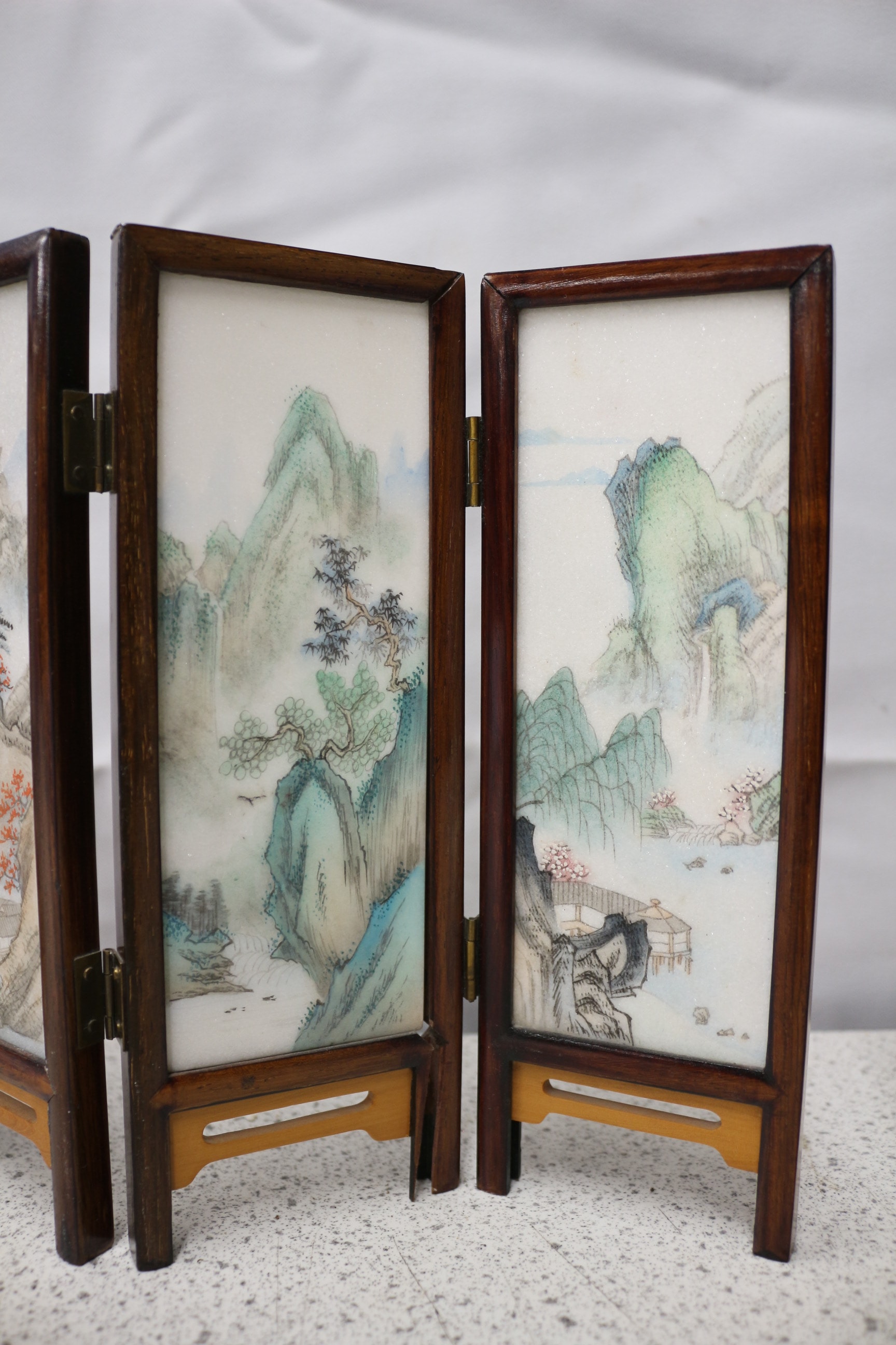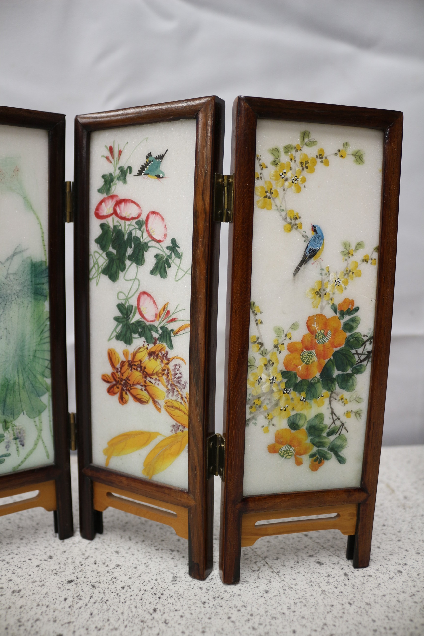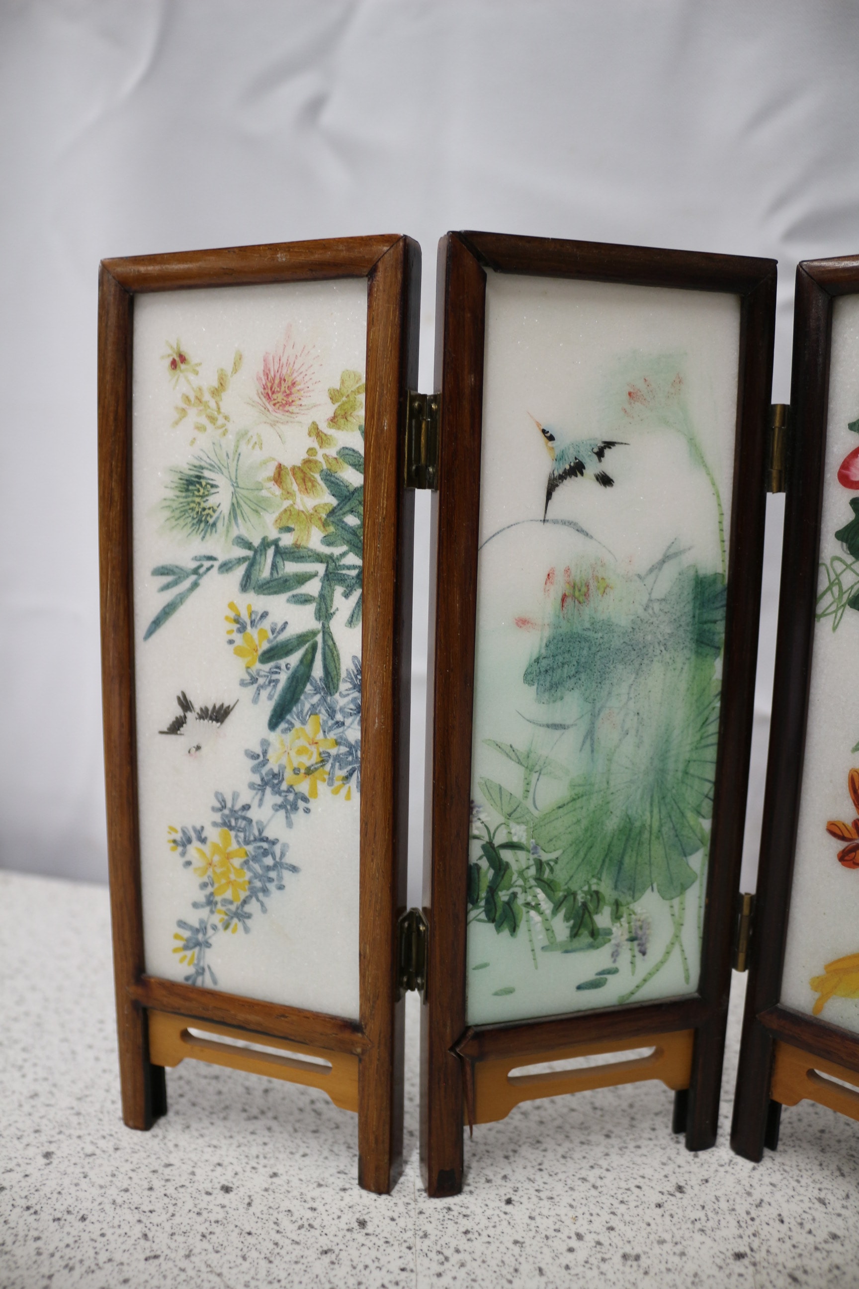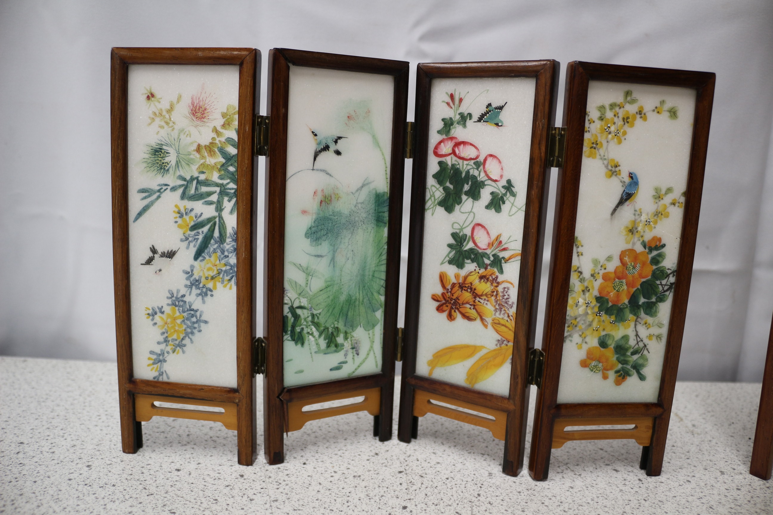 A pair of 4-panel miniature oriental decorative screens with dark brown wooden frames and white painted stone inserts, one featuring colourful floral and bird designs, the other traditional landscape scenes. Tallest 21cm AF
