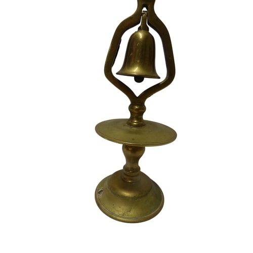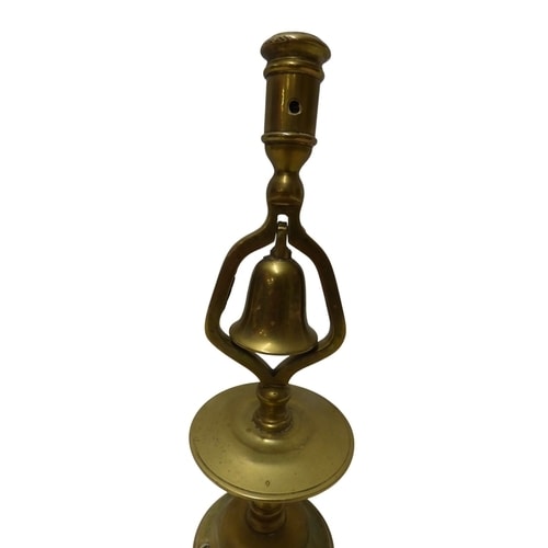 A slightly tarnished Vintage Baldwin Victorian Brass Tavern Service Candlestick with Bell, featuring a central bell integrated into the stem. 32cm tall