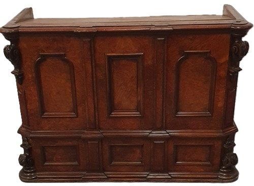 An Antique Italian Walnut Rostrum or Counter. This rectangular, dark-stained hardwood exquisite piece of furniture is likely made in a Baroque or Renaissance Revival style. Its front features a slightly slanted flat top surface and is divided into three vertical sections by fluted pilasters. The outer sections display arched recessed panels, and the central section has a rectangular recessed panel, suggesting doors or false fronts. A lower tier presents three smaller rectangular panels, similarly divided. The item’s sides terminate in substantial carved scrolled supports at both upper and lower corners. Constructed from solid walnut with figured or burl wood panels. 250x55cm, 90cm tall