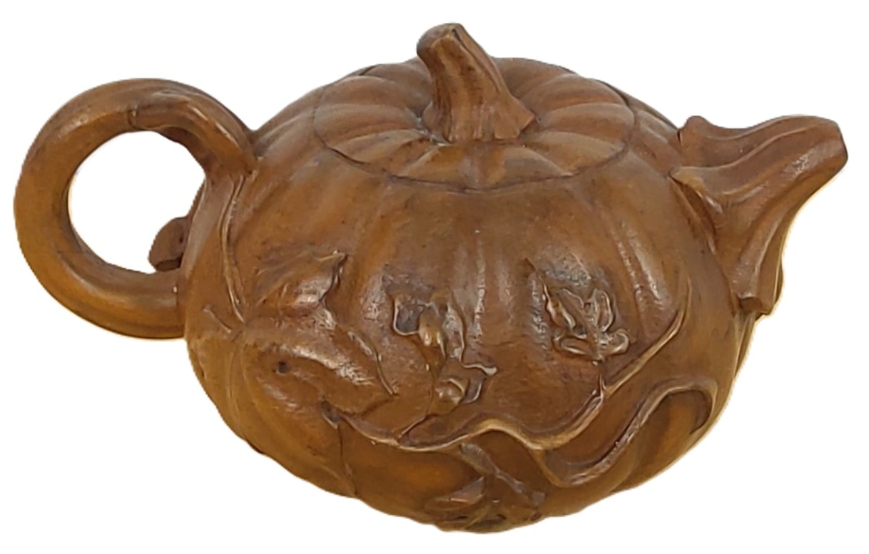 Lot 385: A Chinese Boxwood Carved Pumpkin Teapot Sculpture