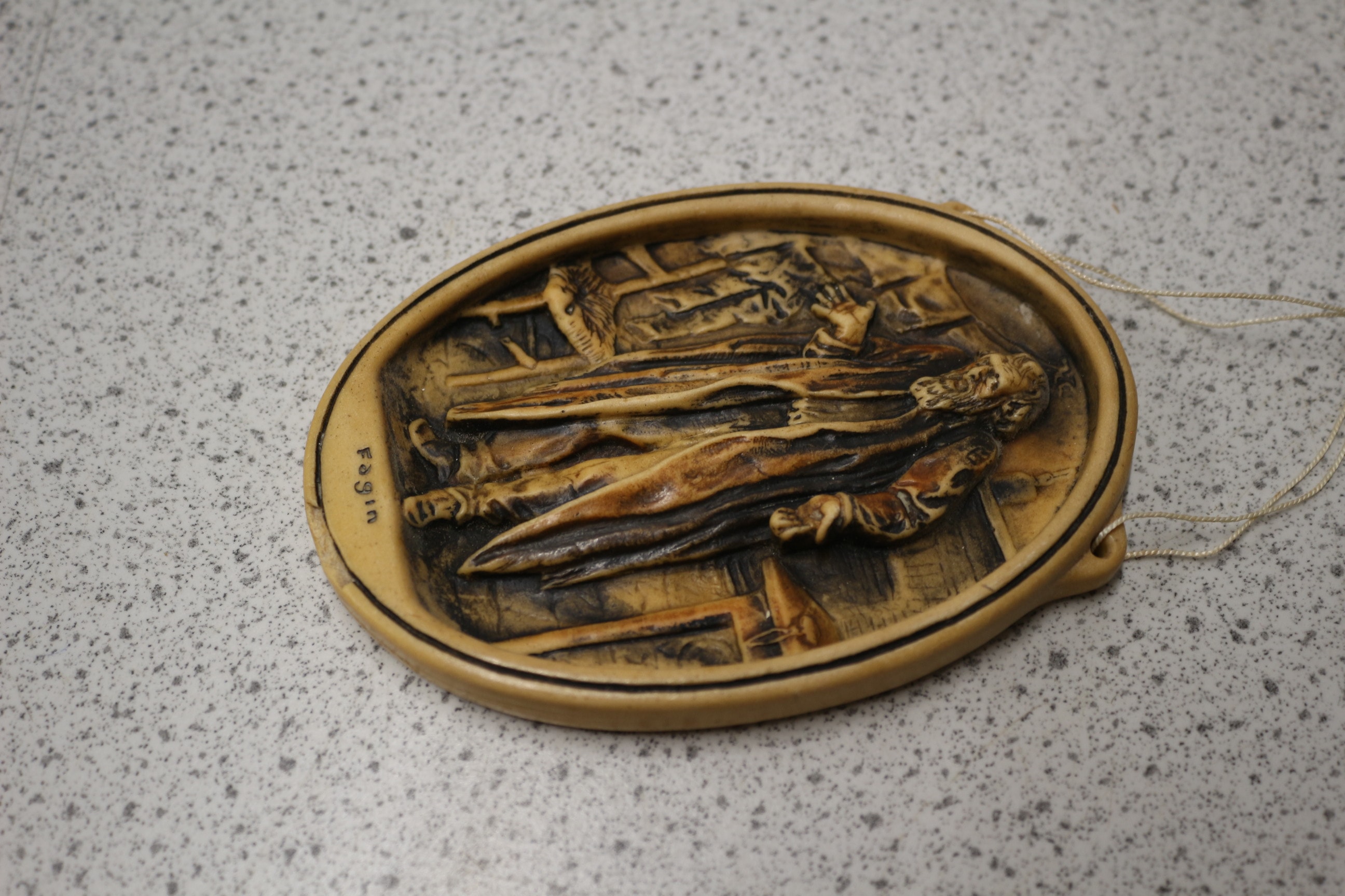 An Osborne Ivorex Charles Dickens ‘Fagin’ wall plaque, crafted from a multi-toned resin or composite material designed to emulate carved wood or ivory. This oval-shaped figural relief depicts a standing, bearded male figure in robes within an interior setting, rendered in a representational style. The name “Fagin” is clearly inscribed at the bottom, identifying the character from Charles Dickens’ *Oliver Twist*. The item features two holes at the top with a string for hanging. Examples from this series are often copyrighted around 1910-1911. 12.5cm