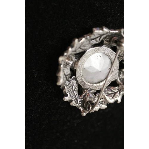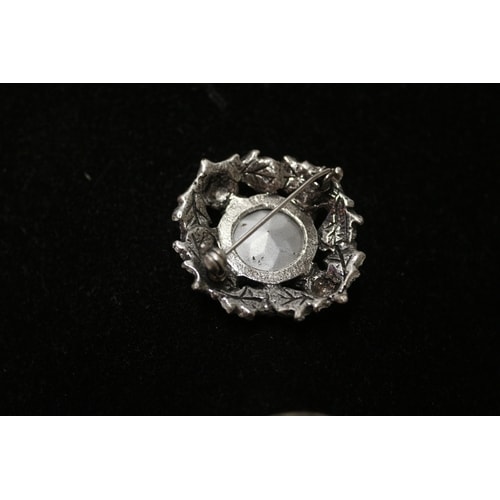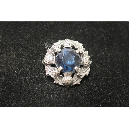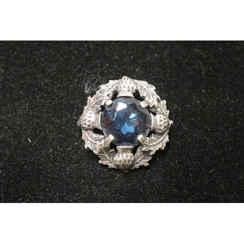 A silver-coloured brooch with a dark blue faceted stone at its centre, surrounded by a wreath design featuring thistles and leaves, marked ‘SCOTLAND’ on the back.