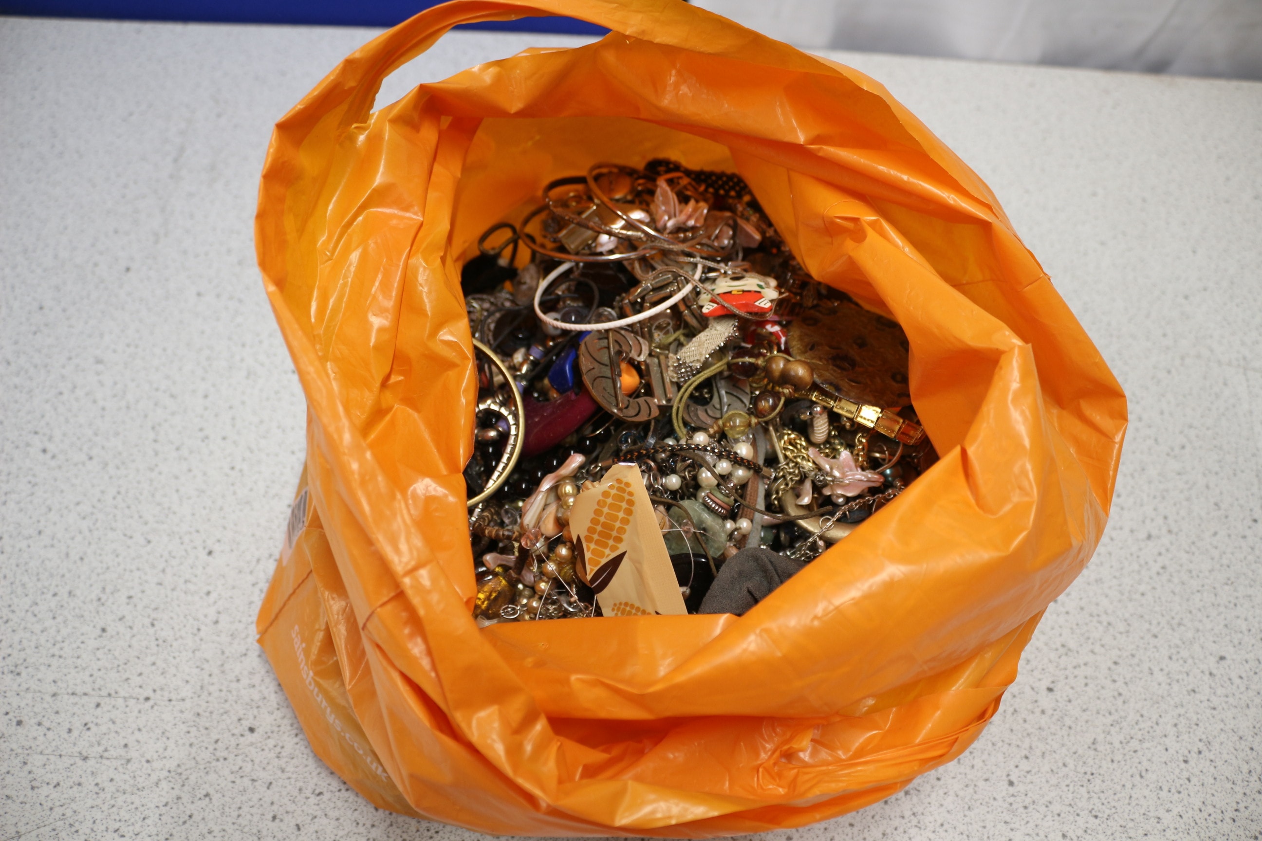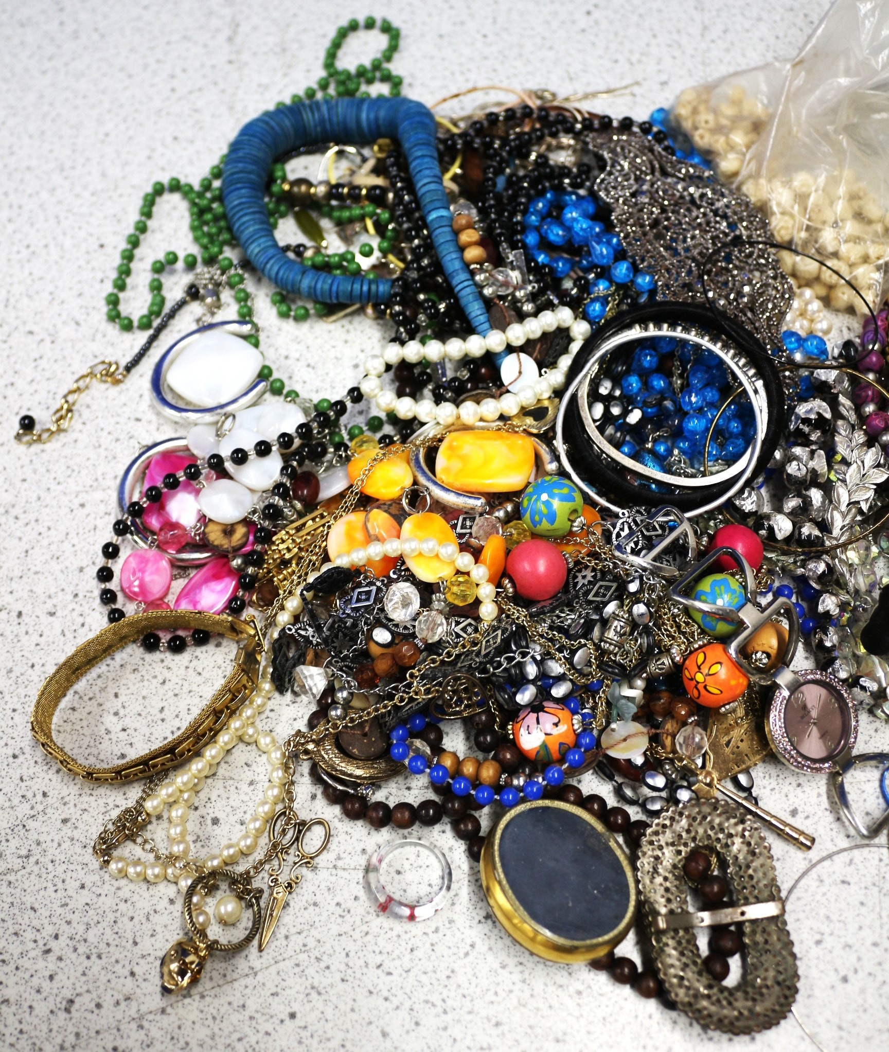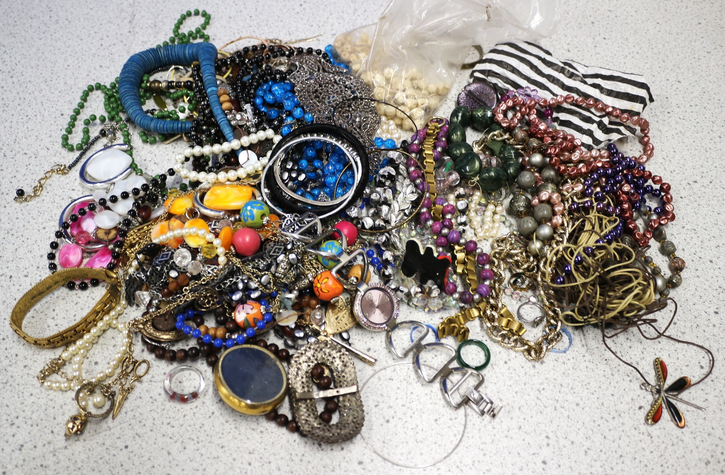 This lot comprises a substantial collection of assorted costume jewellery, primarily consisting of necklaces, bracelets, rings, and pendants, along with loose components and a dragonfly brooch. The items exhibit a wide variety of styles, suggesting a mixed period accumulation likely spanning from vintage to contemporary designs. Materials observed include various base metals in gold and silver tones, a diverse array of beads (glass, plastic, faux pearls, wood, shell, and possibly some semi-precious stones), and other elements such as enamel and resin. No distinct manufacturer’s marks or legible text are visible.