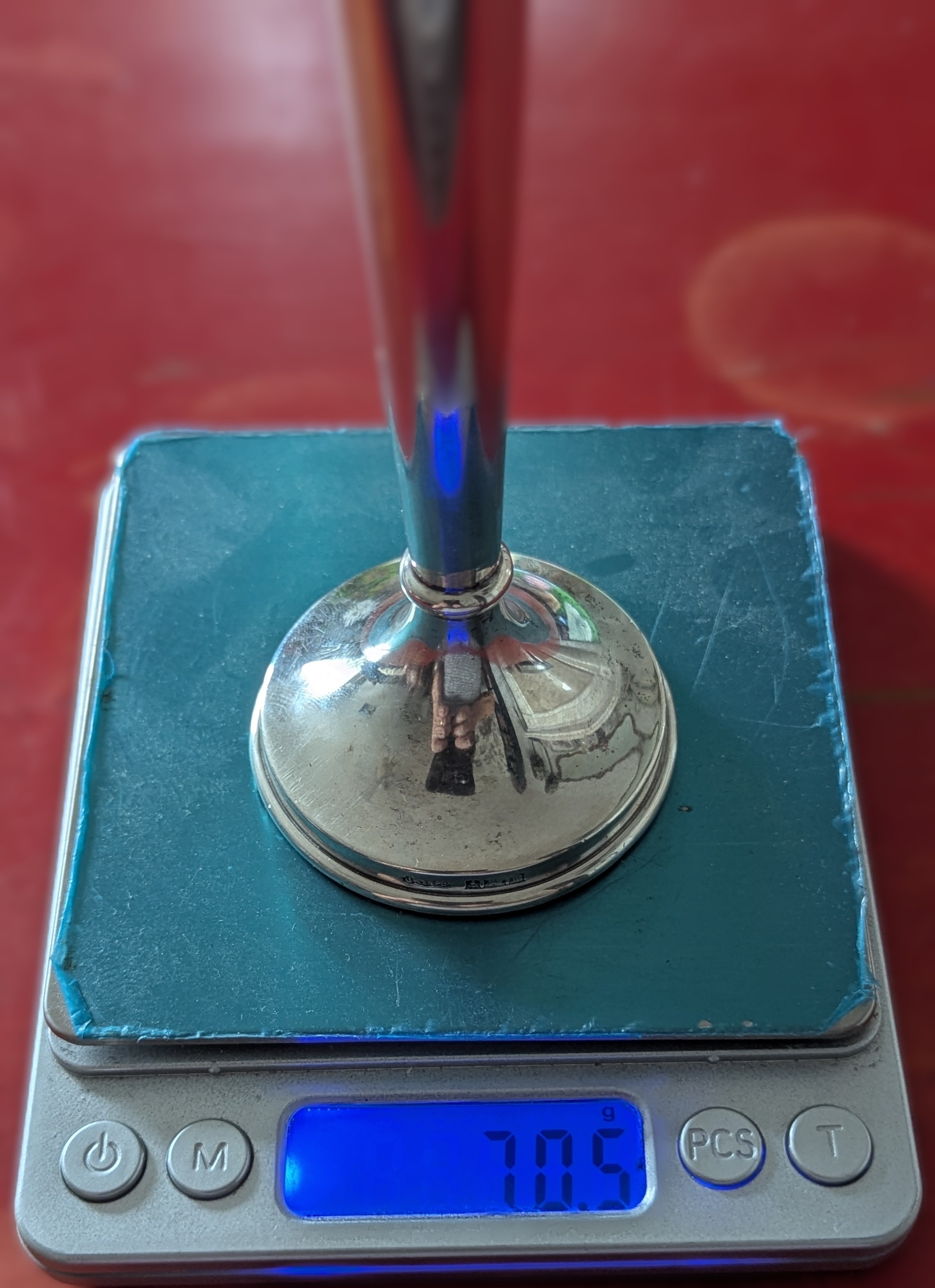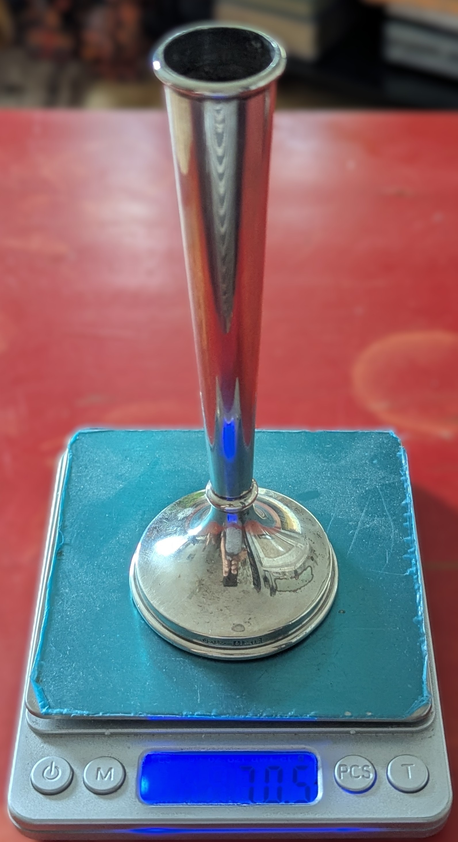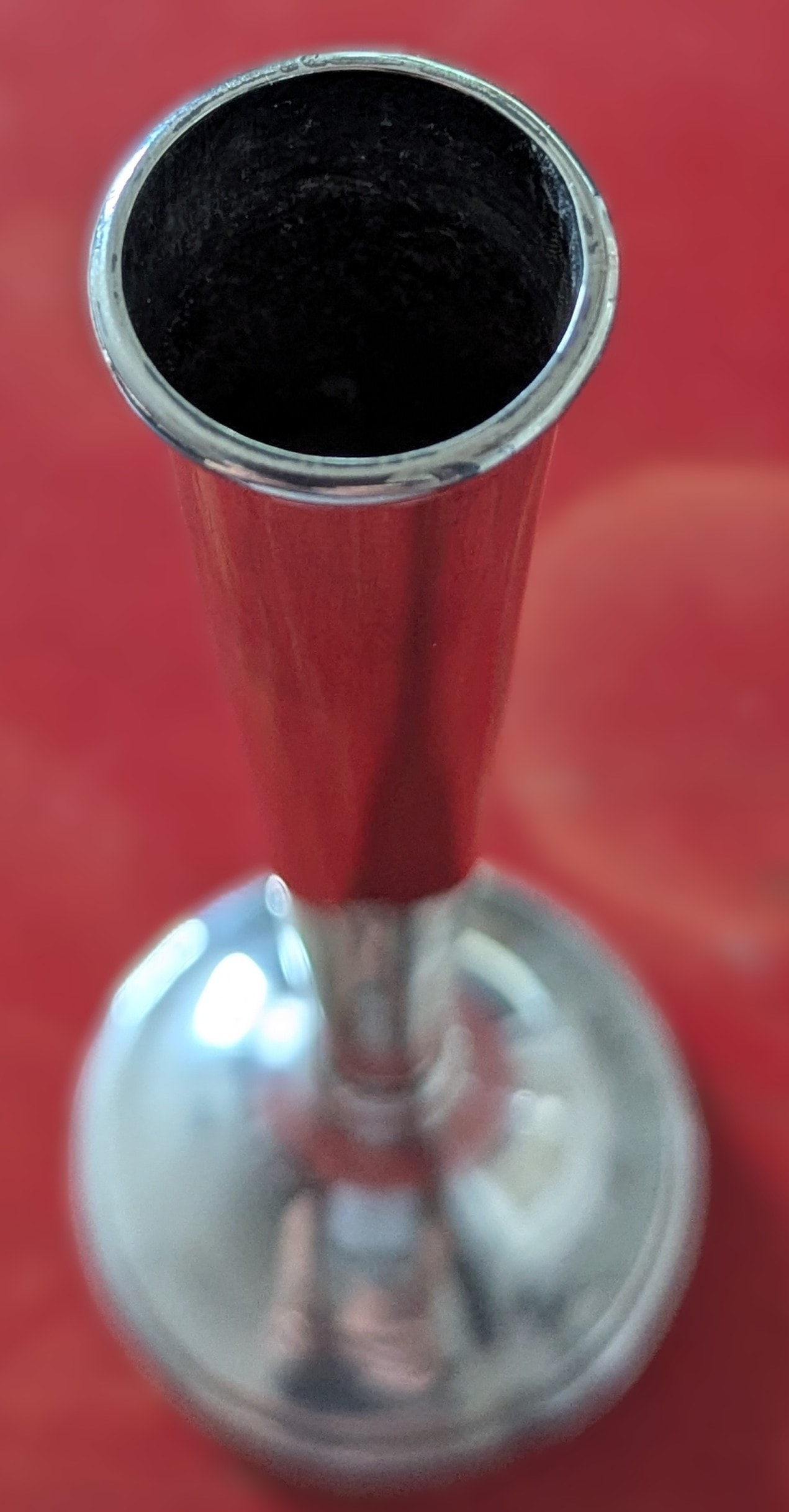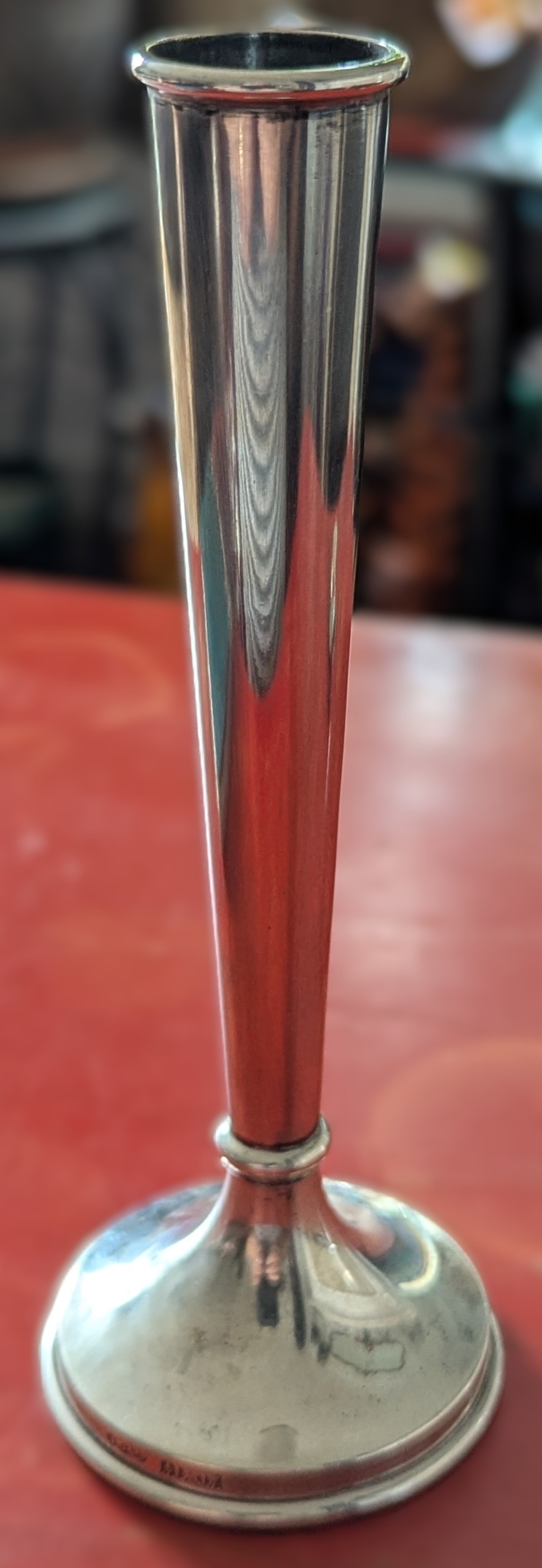 A slender, trumpet-shaped bud vase, crafted from polished sterling silver. Its minimalist design features a tapering body set upon a circular, flaring base. The base bears a series of clear British hallmarks, including a lion passant, anchor (Birmingham Assay Office), a date letter (appearing as ‘W’ in a shield-like cartouche for 1971), and a maker’s mark ‘JGLtd’ within a rounded rectangular punch.