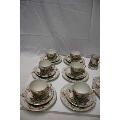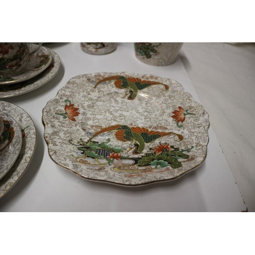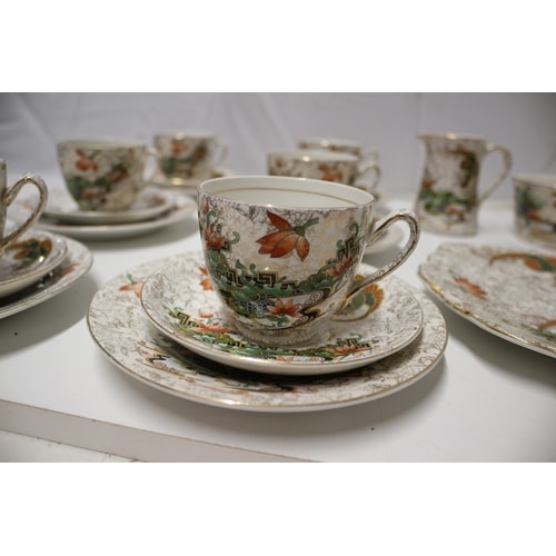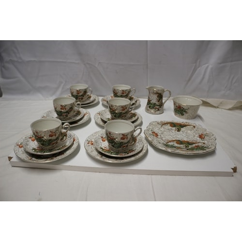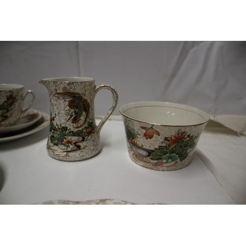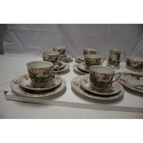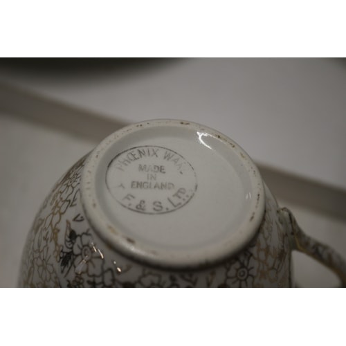 A 21-piece ceramic tea set, including cups, saucers, side plates, 1 creamer, 1 sugar bowl, and 1 scalloped serving platter, primarily white/cream with intricate gold patterns and a central design of green, orange, red, and blue phoenix-like birds and foliage, labelled ‘PHOENIX WARE MADE IN A ENGLAND F & S LTD’.