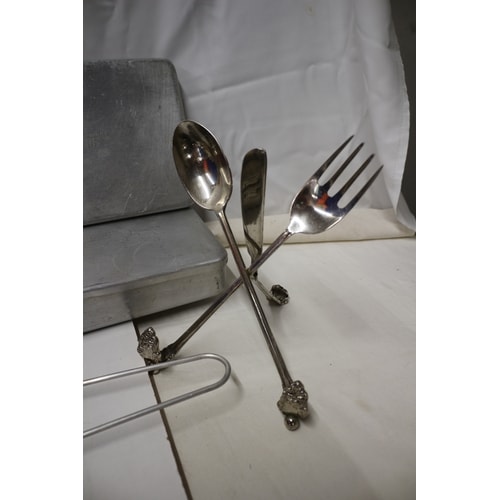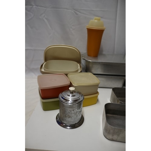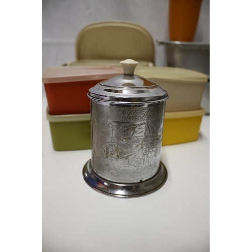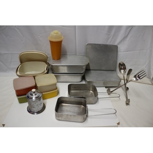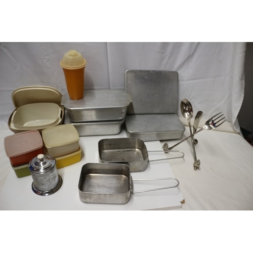 A collection of aluminium mess tins, plastic food storage containers, a plastic shaker, a metal ‘Tea Time’ caddy, and a three-piece cutlery recipe stand.